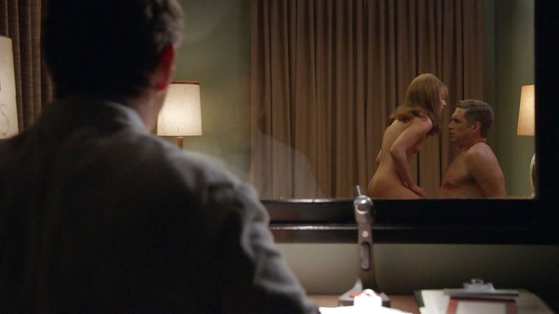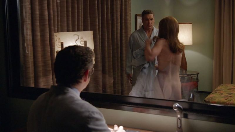 The first two scenes are both from the same TV show. The TV show is called ‘Masters of Sex‘. Emily Kinney undresses in an observation room to pose nude in front of a man. When she straddles the man on a bunk, we see her naked buttocks and breasts. When she and the guy are talking, she strokes his shoulders and chest with her fingertips.
