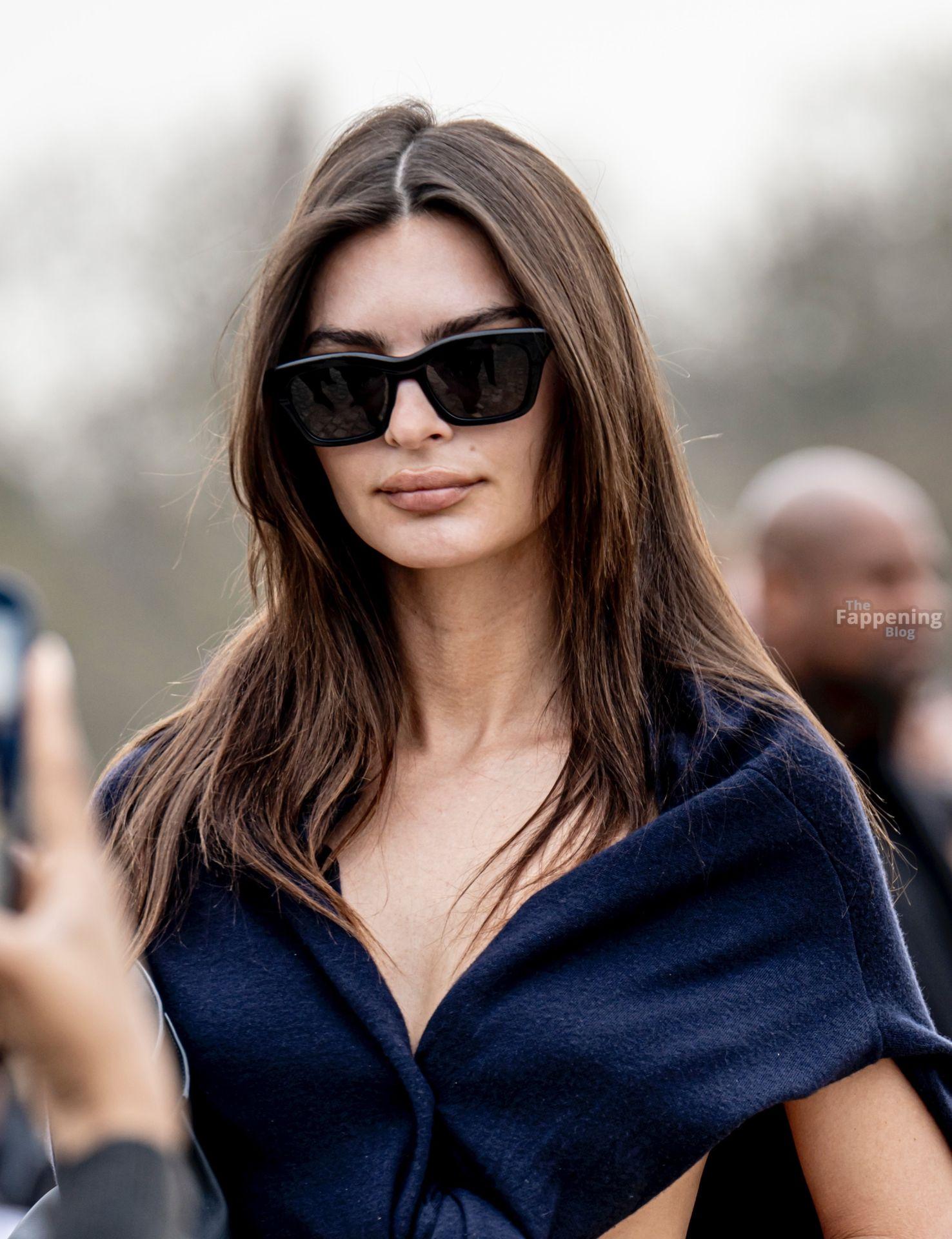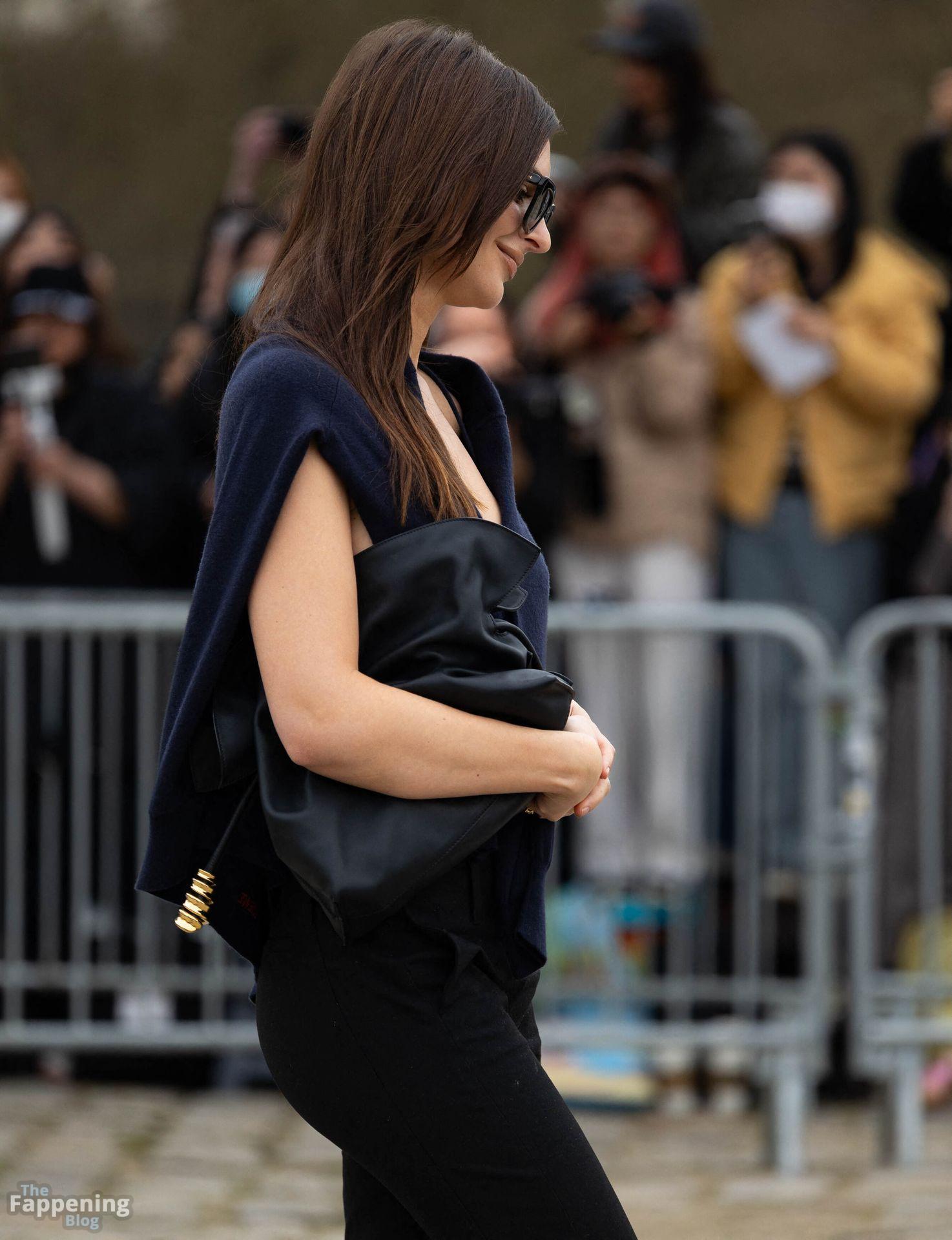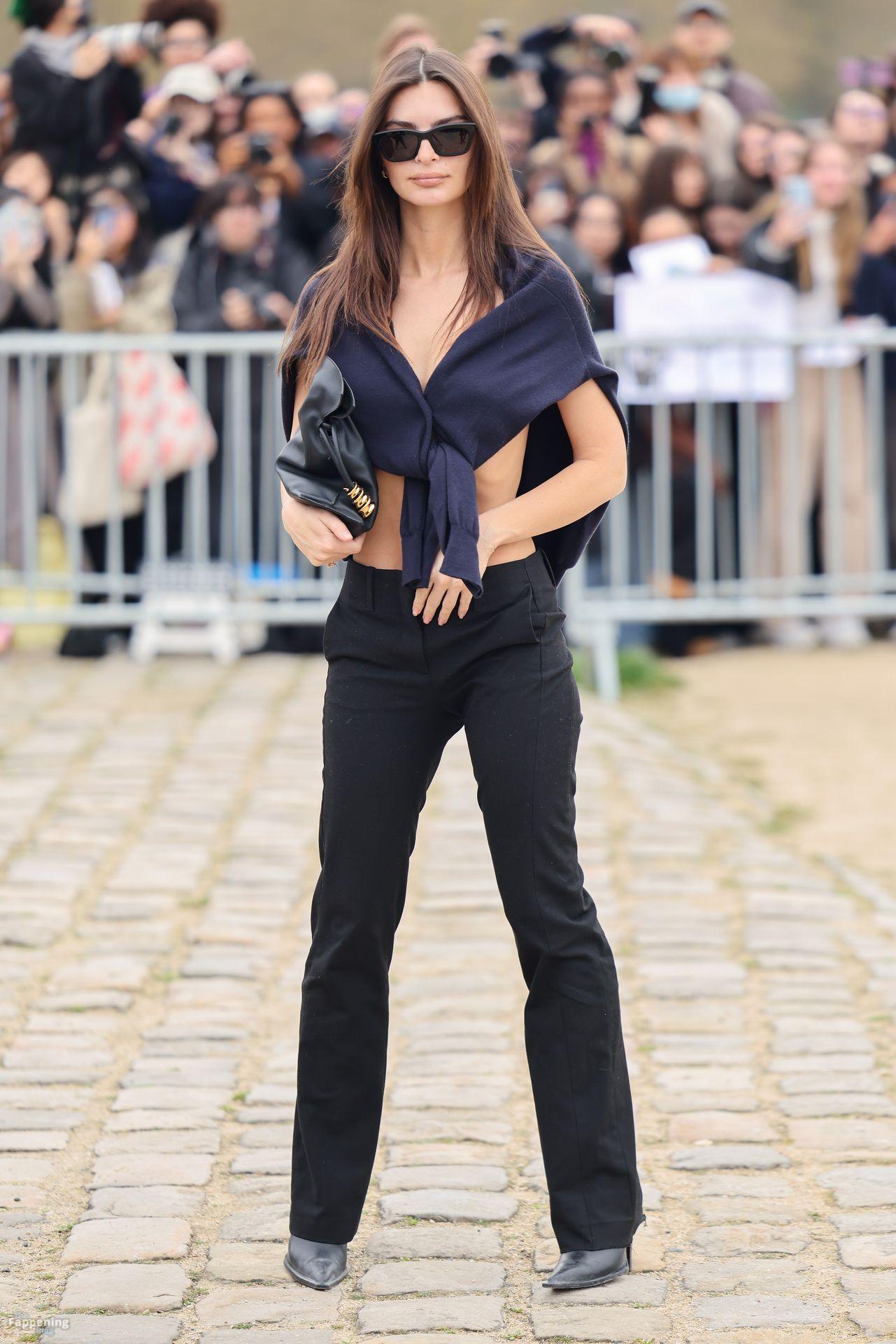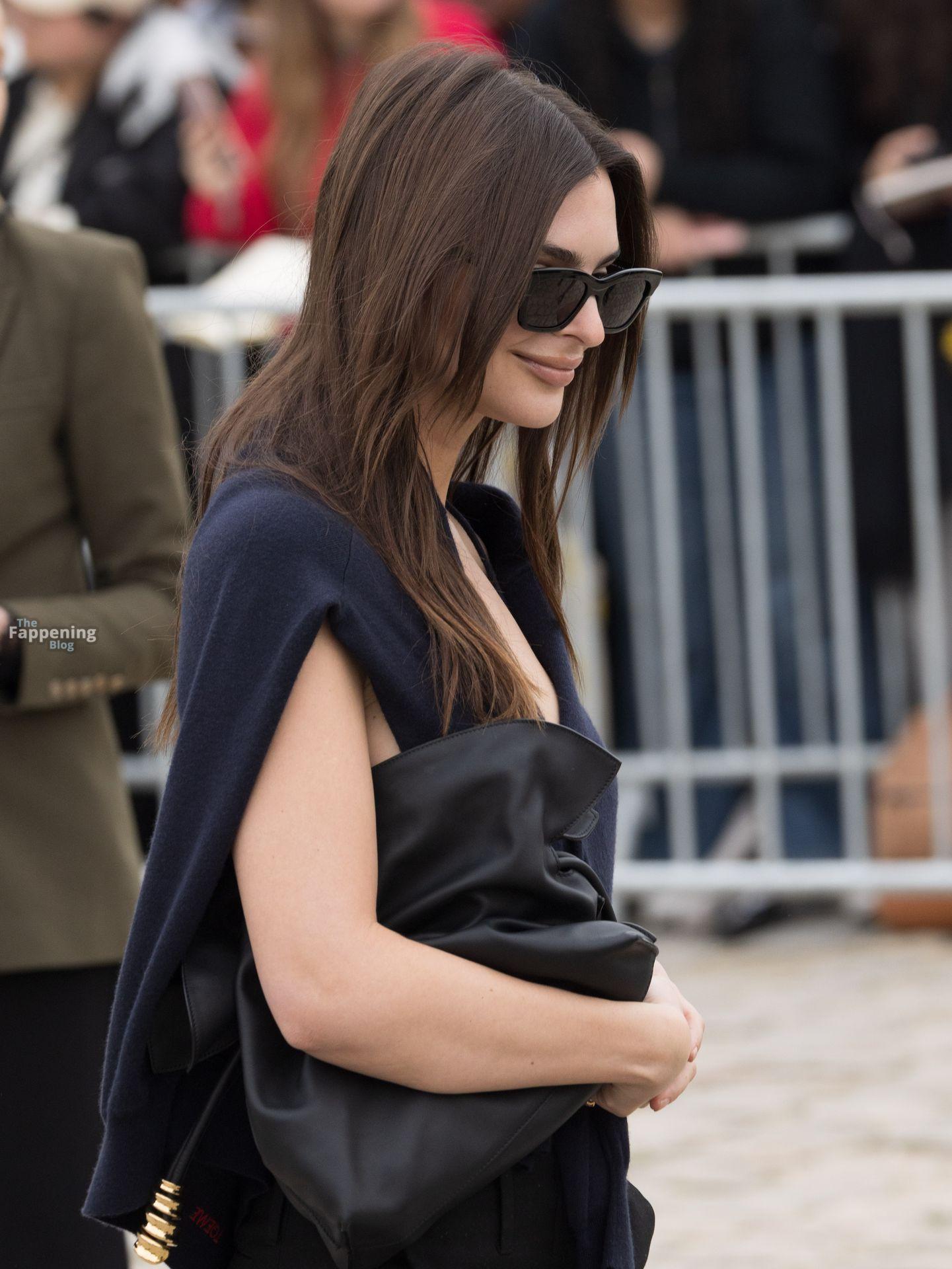Emily Ratajkowski va senza reggiseno, mostrando il suo underboob mentre arriva allo show Loewe durante la Fashion Week a Parigi, Francia.