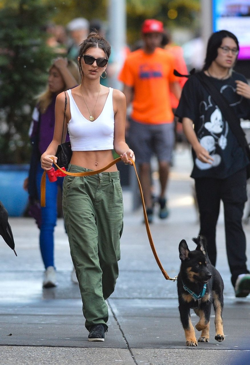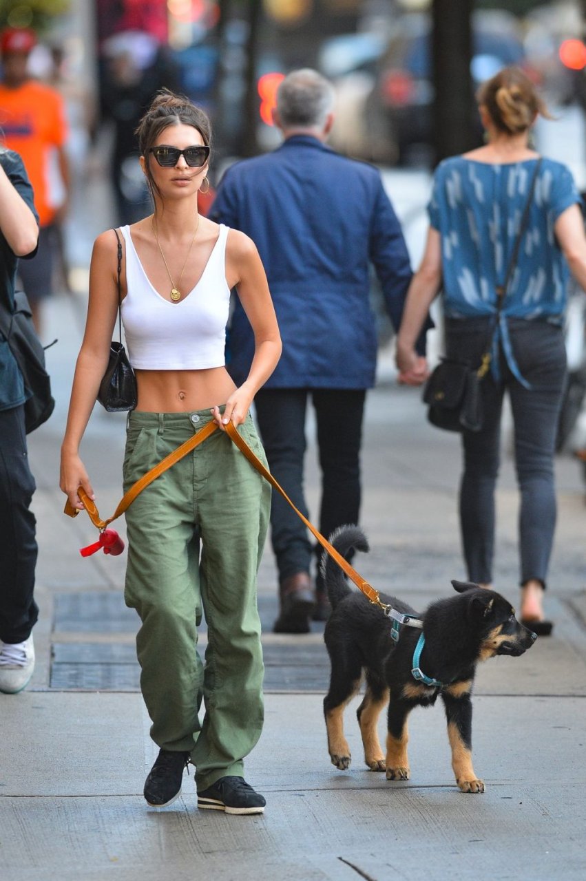 Emily Ratajkowski è stata vista mentre passeggiava con il suo cane a New York City, 20/06/2019. La modella di bikini e attrice di 28 anni indossava un top corto bianco, pantaloni verdi e scarpe da ginnastica nere.