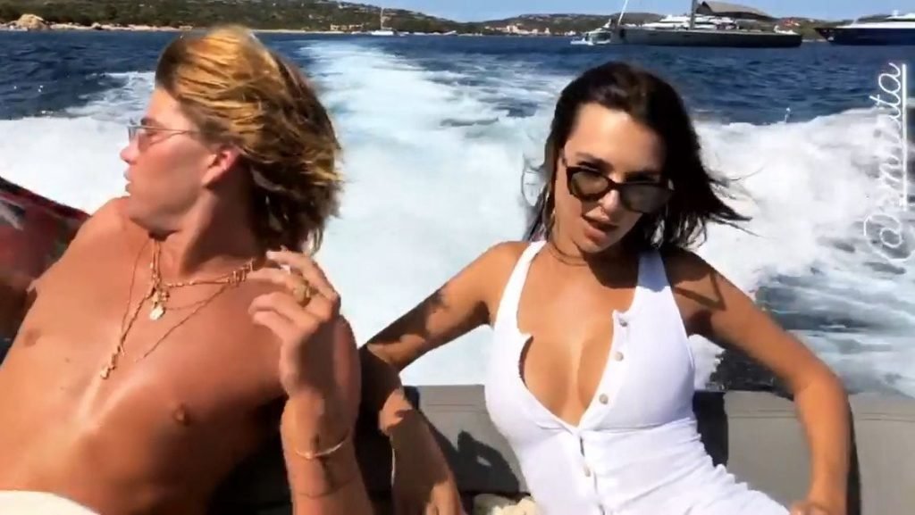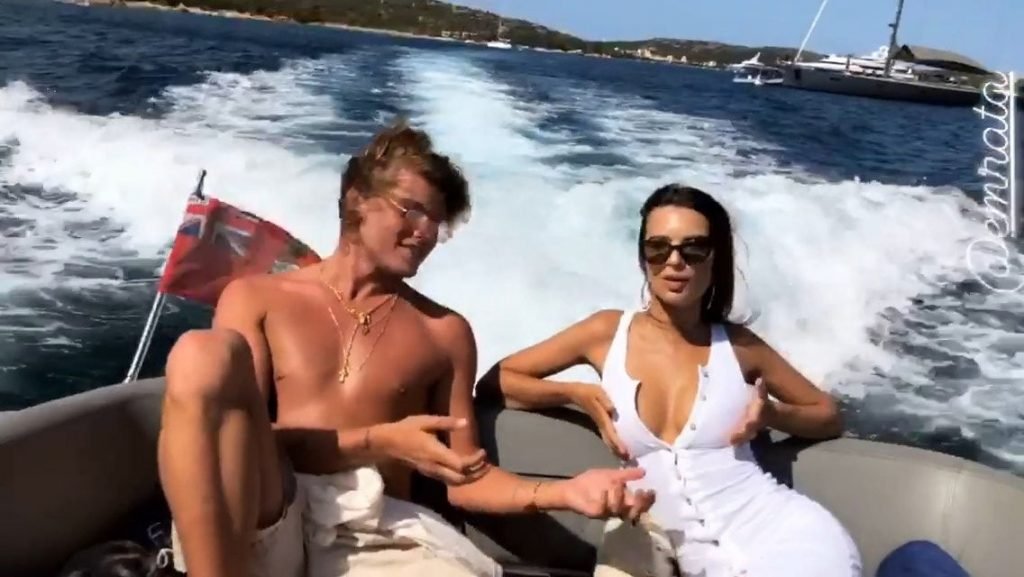 Modella e attrice Emily Ratajkowski si gode una giornata con Jordan Barrett e altri amici a Porto Cervo, Italia, 08/10/2018. La bellezza magra e ubriaca ha mostrato i suoi seni e il suo sedere perfetti.