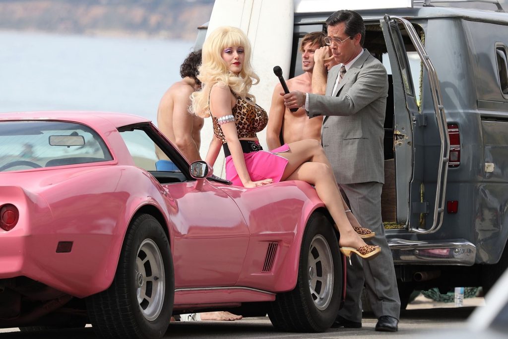 In buon umore, Emmy Rossum cammina verso il set di Angelyne. Nella scena, Angelyne viene intervistata mentre è appoggiata su una Corvette degli anni ’70. Emmy sfoggia il suo décolleté protesico e il sorriso Colgate, 27/02/2020.