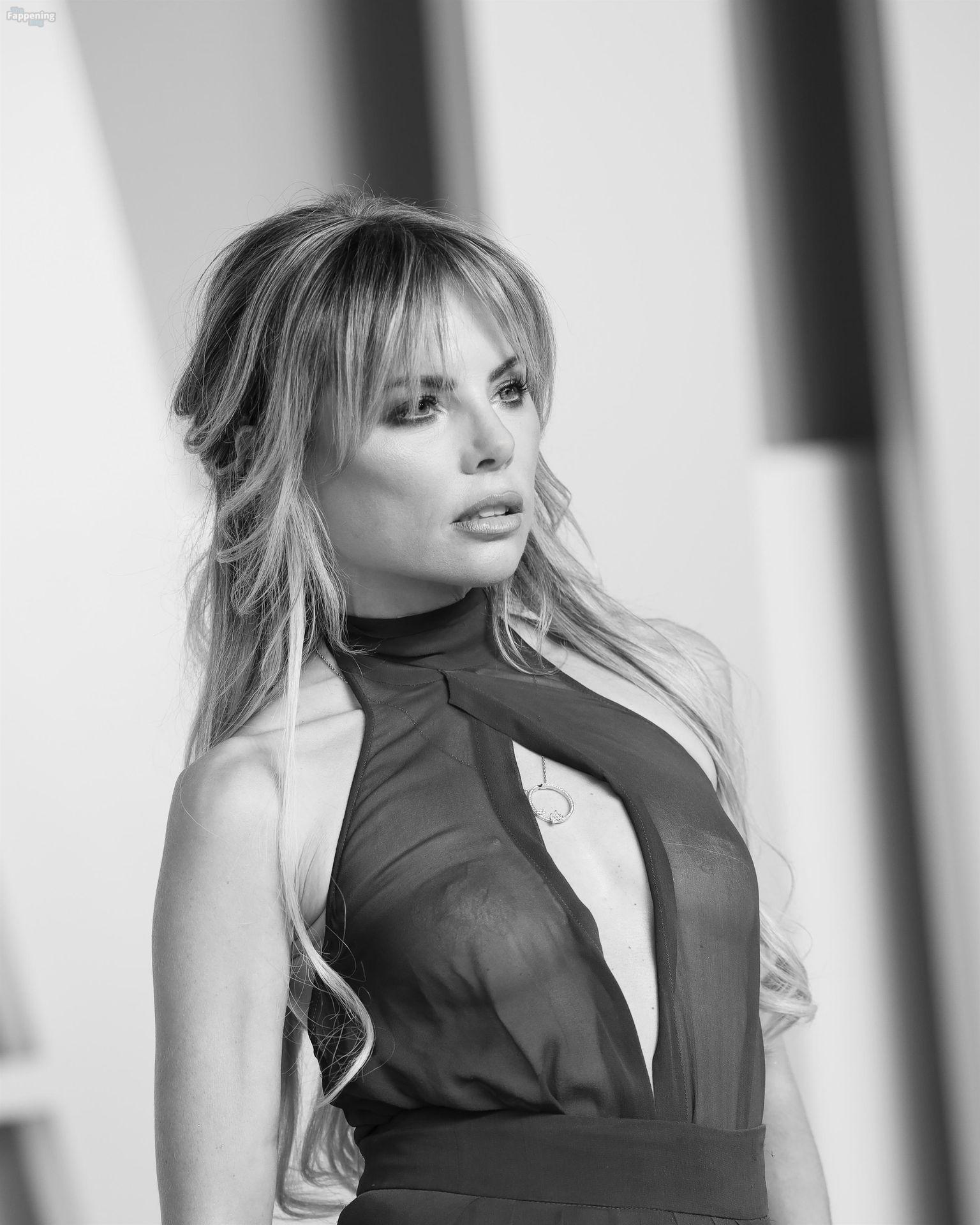 La modella italiana e guru della moda Erica Pelosini è stata fotografata al Vanity Fair Oscar Party, sfoggiando un abito blu trasparente con copricapezzoli sul seno.