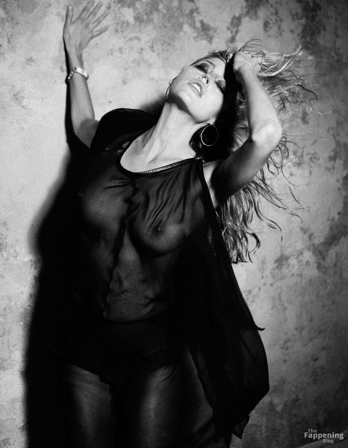 La modella di moda e attrice Estella Warren mostra i suoi seni nudi, posando con un vestito trasparente.