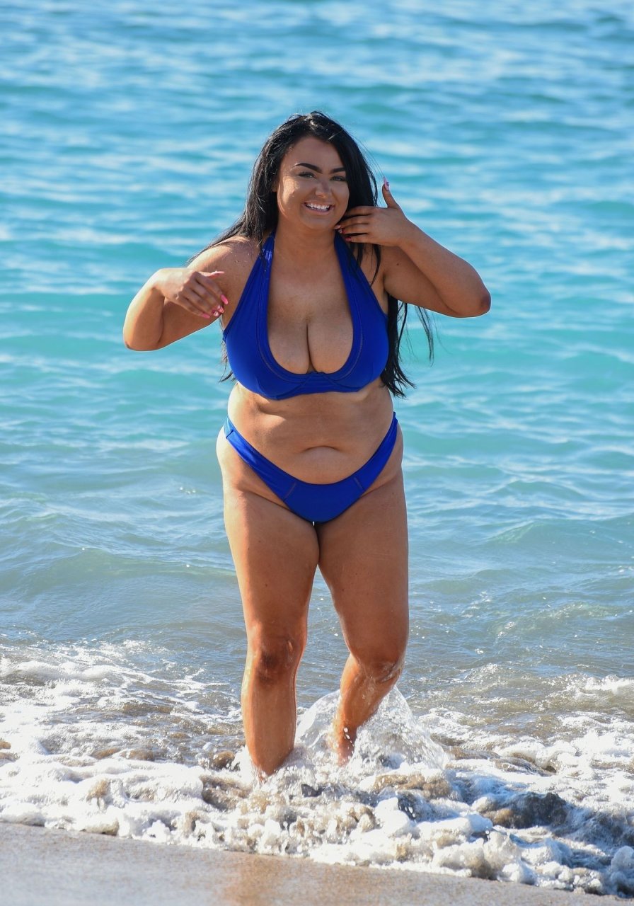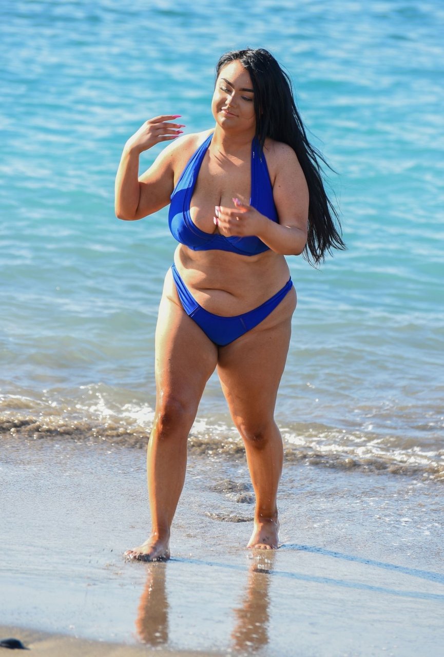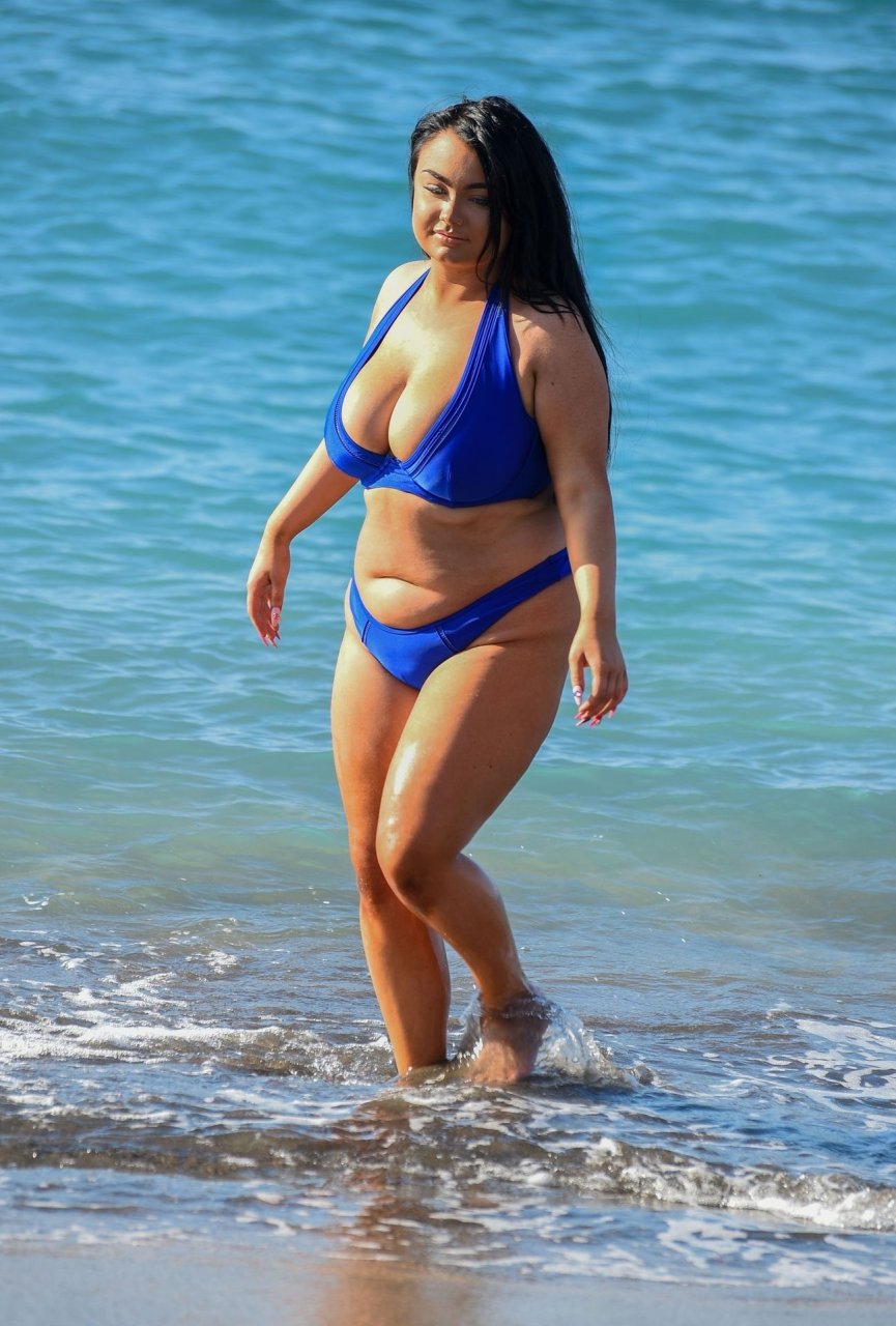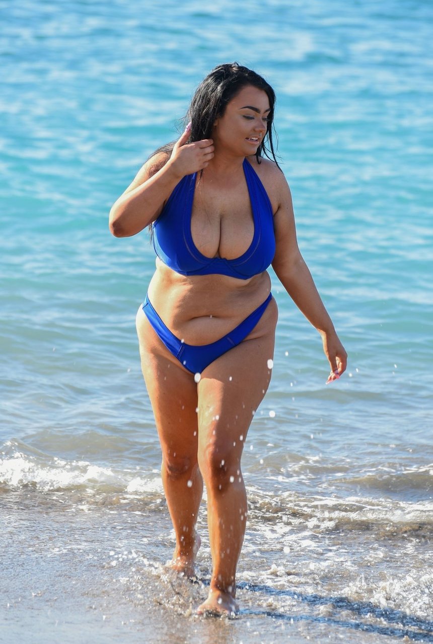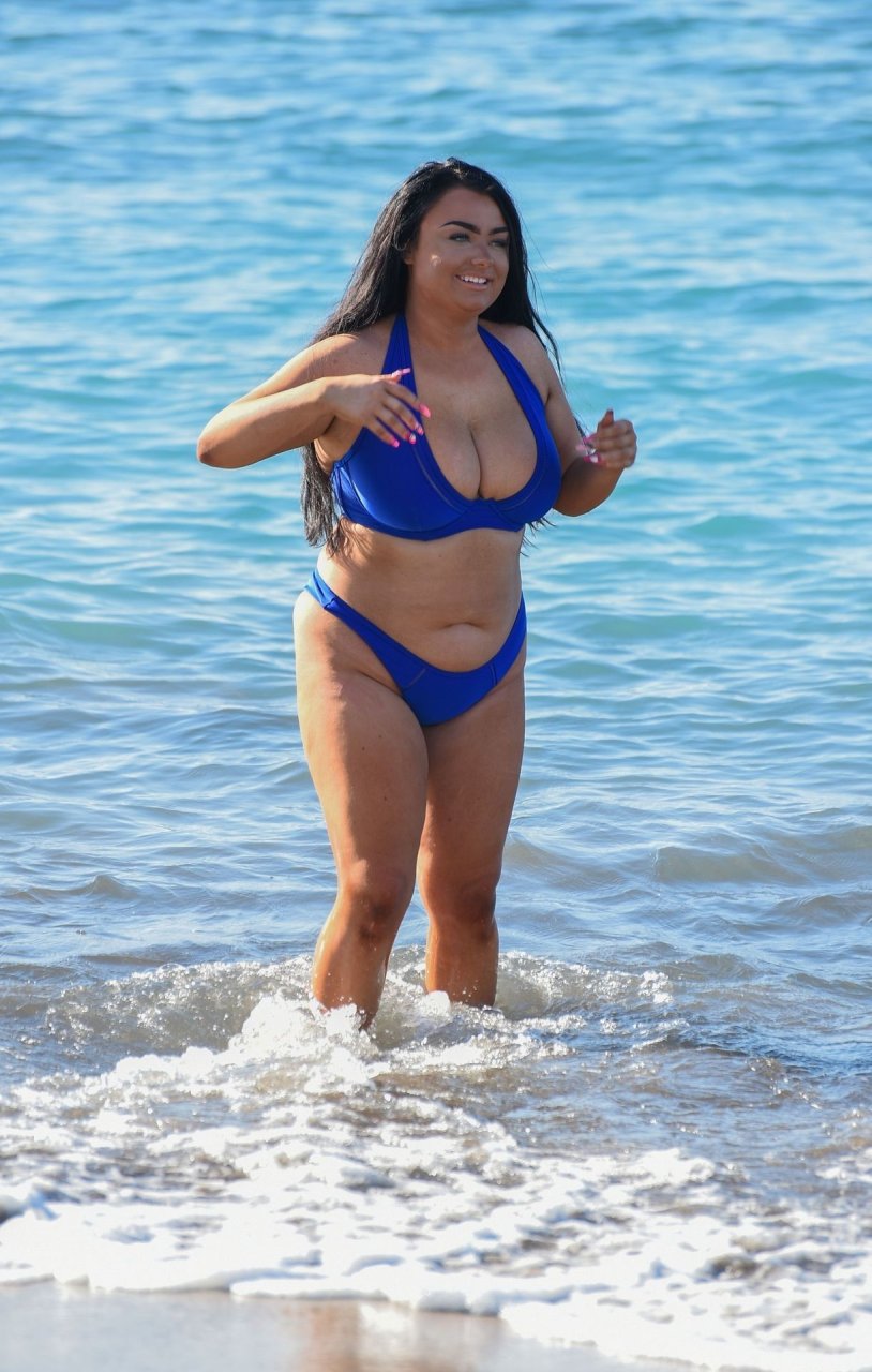 Bellissima bruna, Faith Mullen di Geordie Shore mostra il suo corpo bikini taglia 16 in un bikini blu durante una vacanza a Tenerife, 18/12/2018.