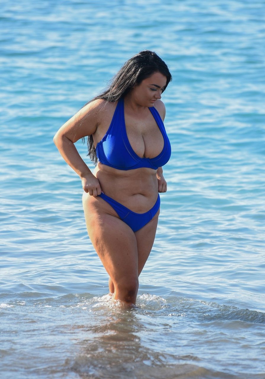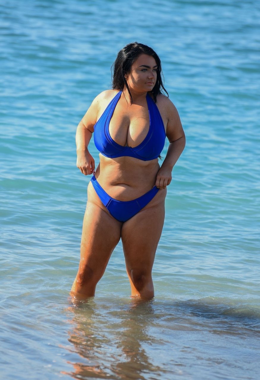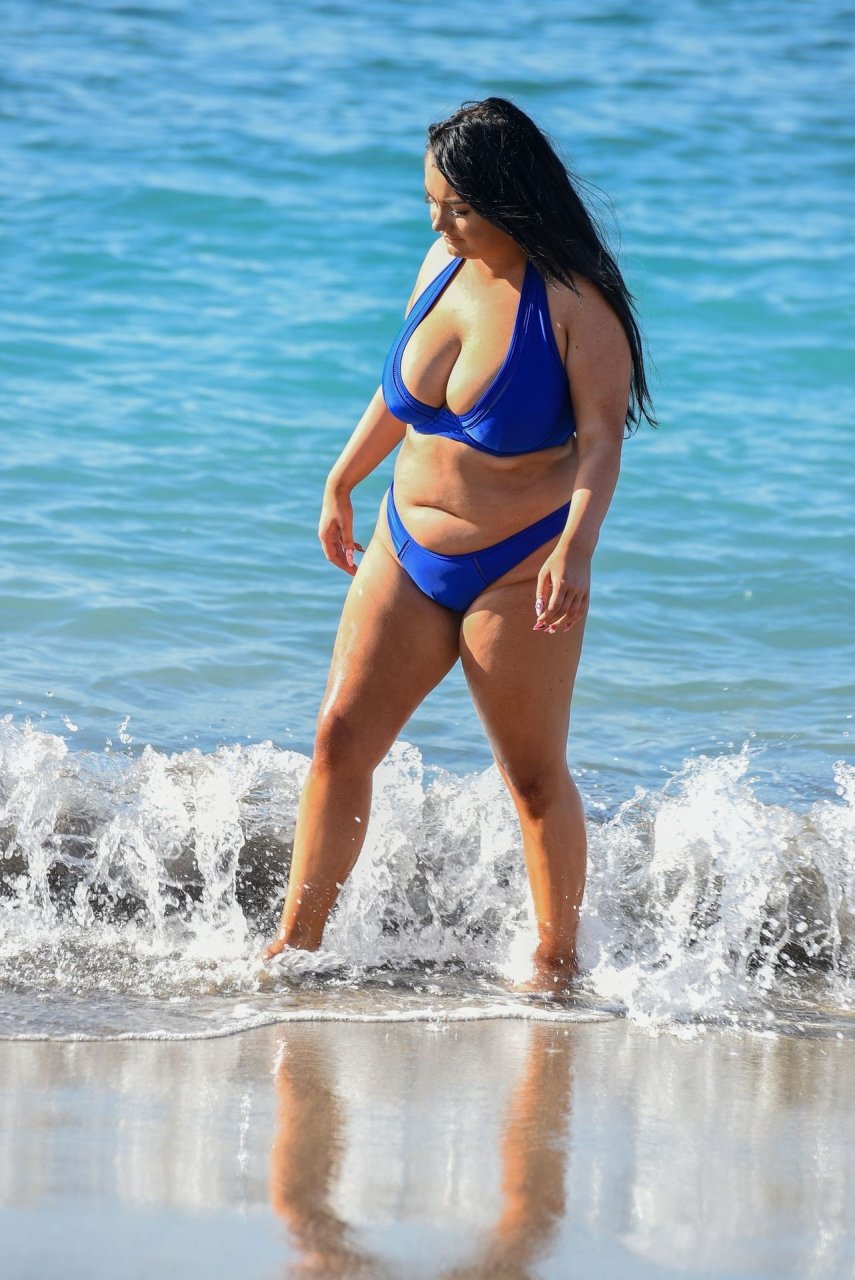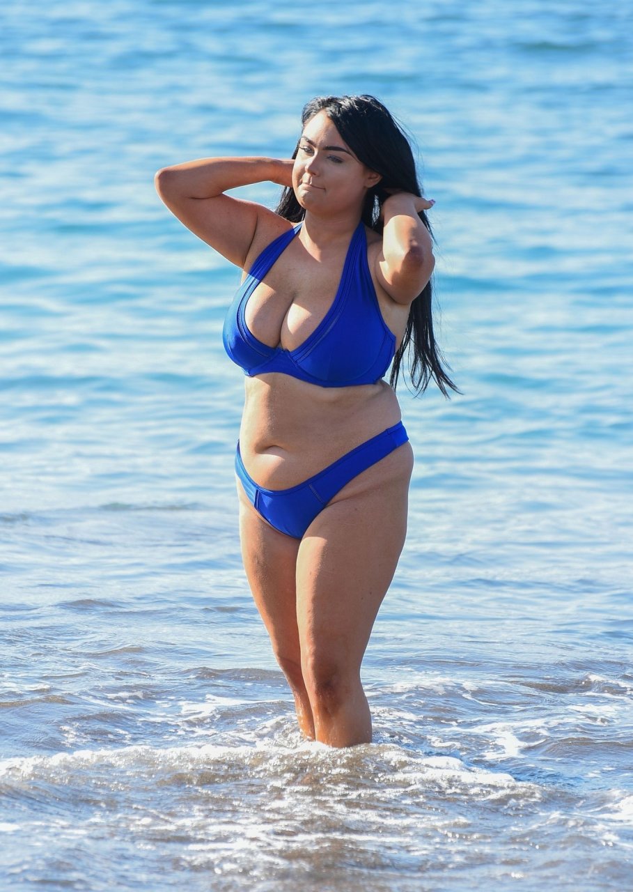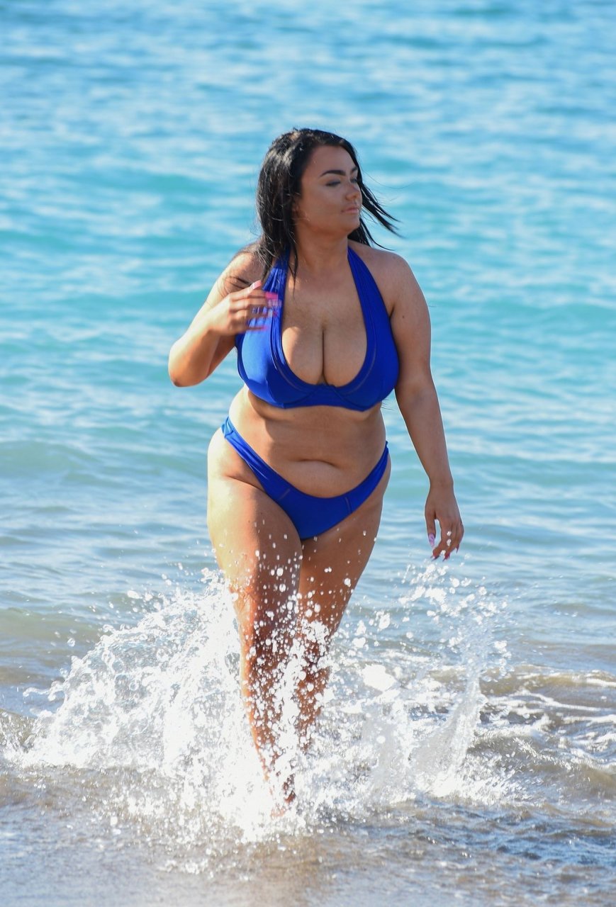 Bellissima bruna, Faith Mullen di Geordie Shore mostra il suo corpo bikini taglia 16 in un bikini blu durante una vacanza a Tenerife, 18/12/2018.