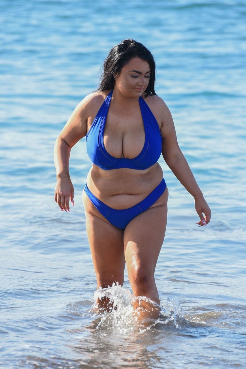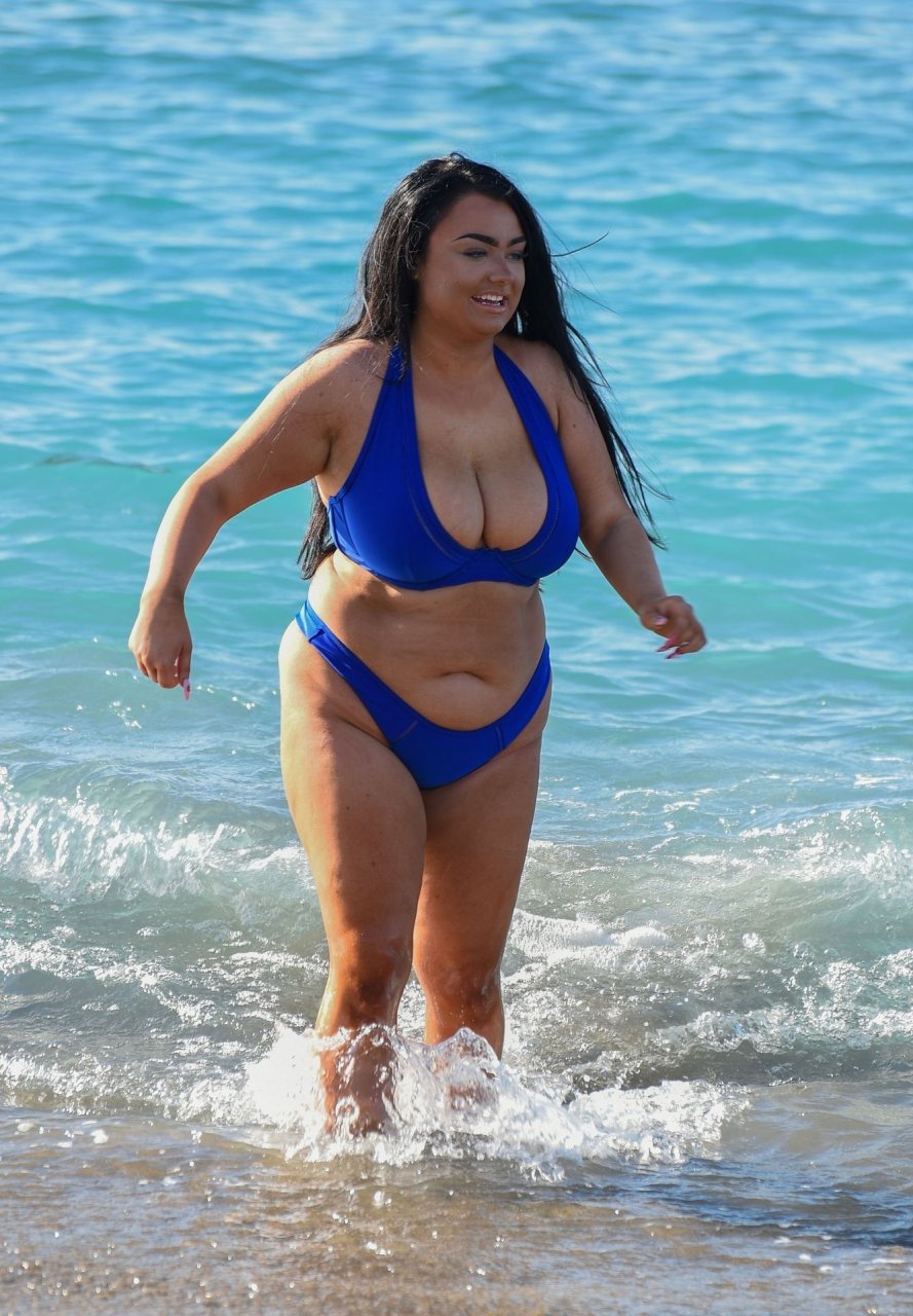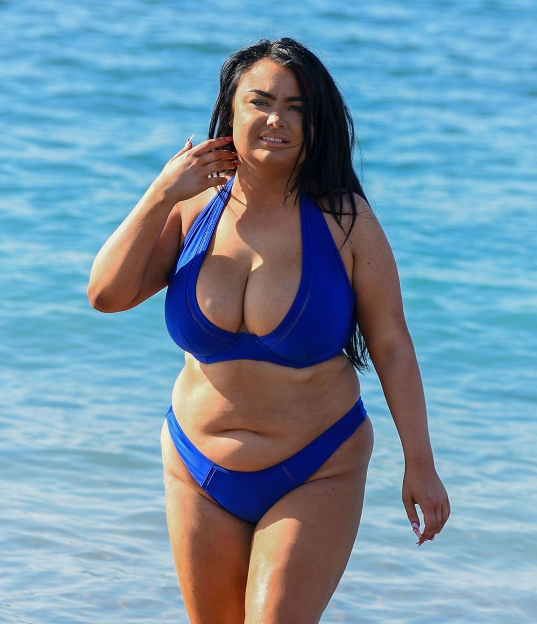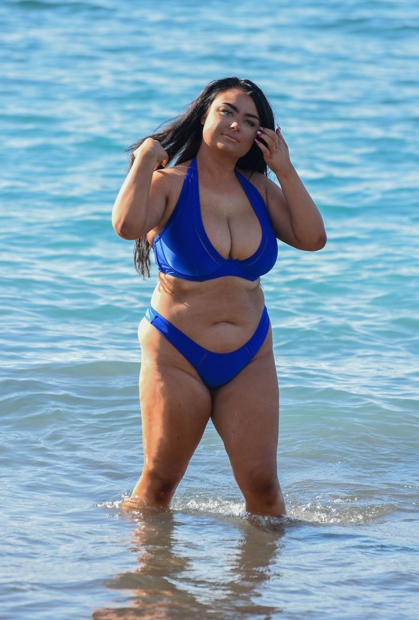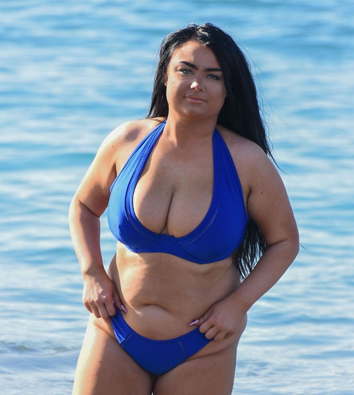 Bellissima bruna, Faith Mullen di Geordie Shore mostra il suo corpo bikini taglia 16 in un bikini blu durante una vacanza a Tenerife, 18/12/2018.
