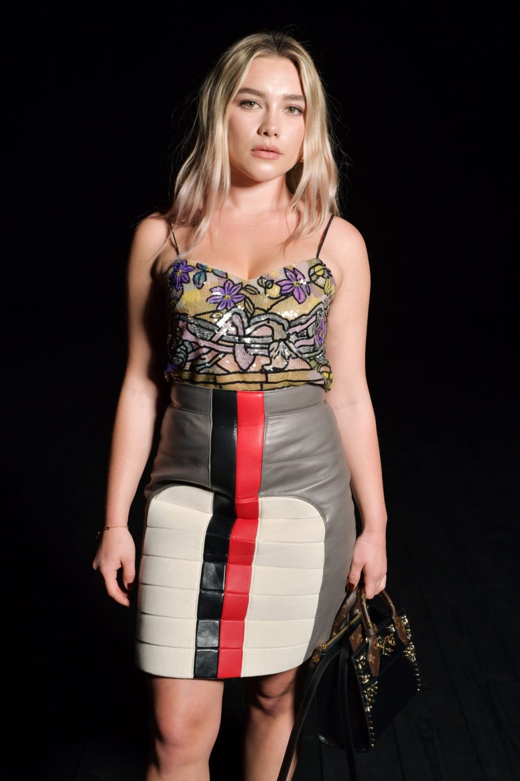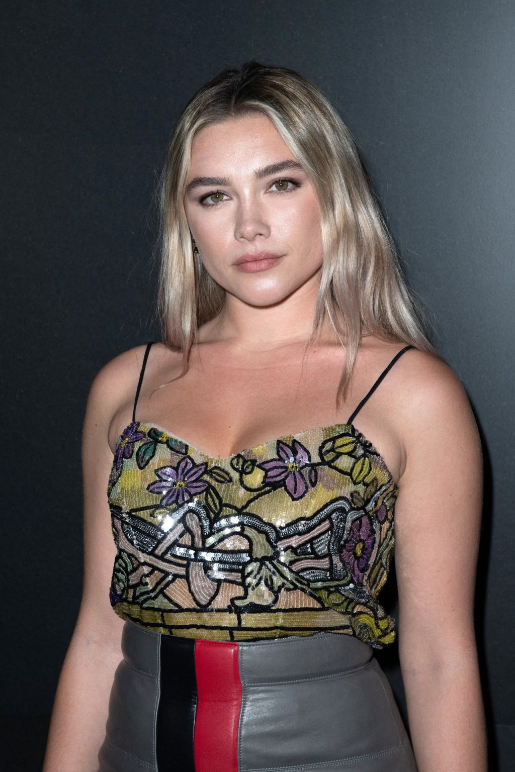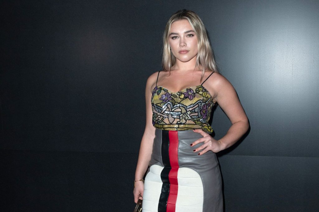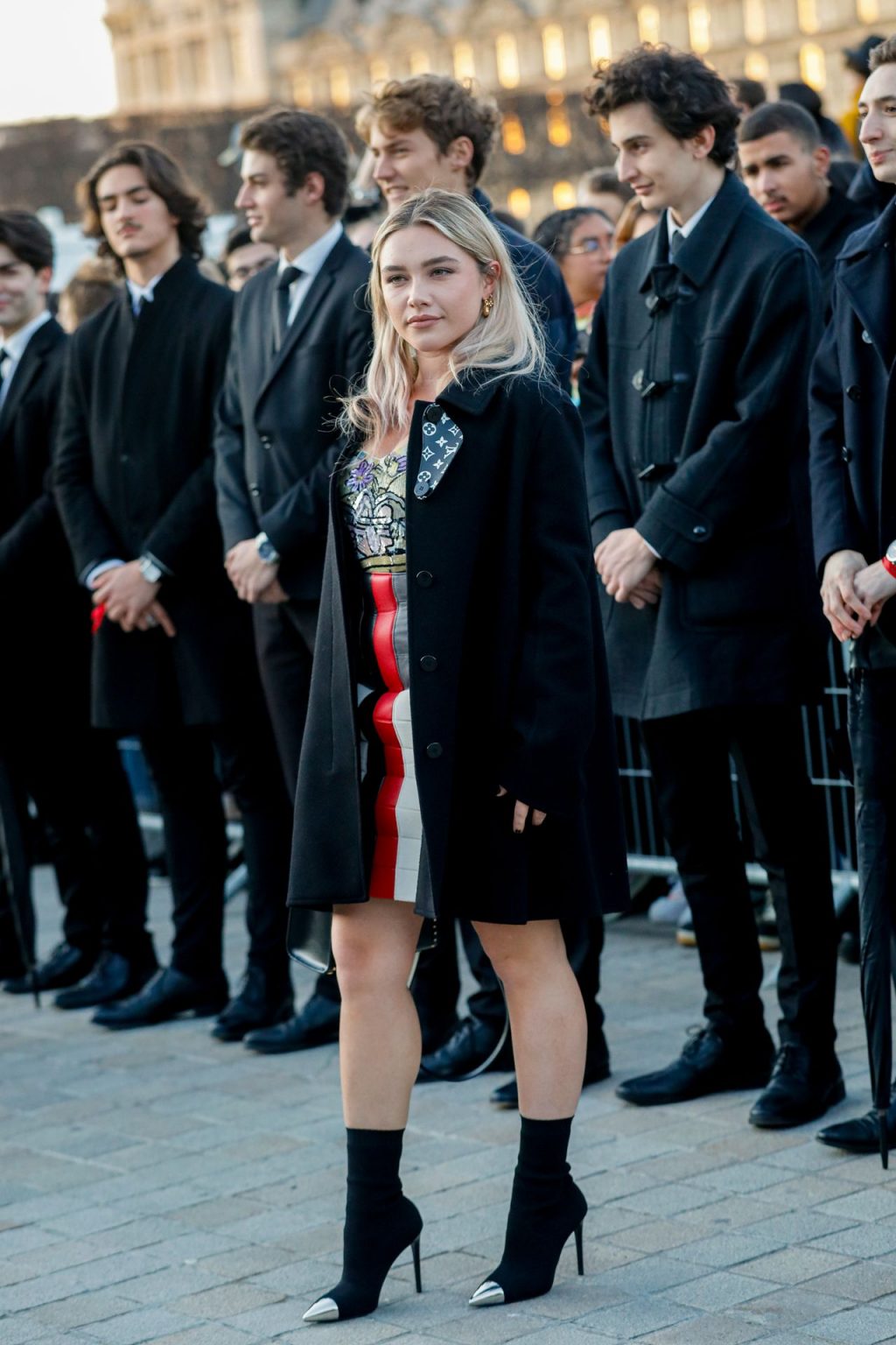 L’attrice britannica Florence Pugh è stata fotografata alla Louis Vuitton Front Row Womenswear Autunno/Inverno 2020/2021 durante la Paris Fashion Week, 03/03/2020. Ha sorpreso con le sue gambe sexy, il décolleté e la biancheria intima.