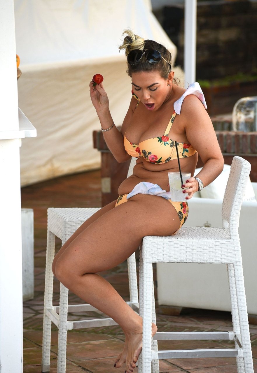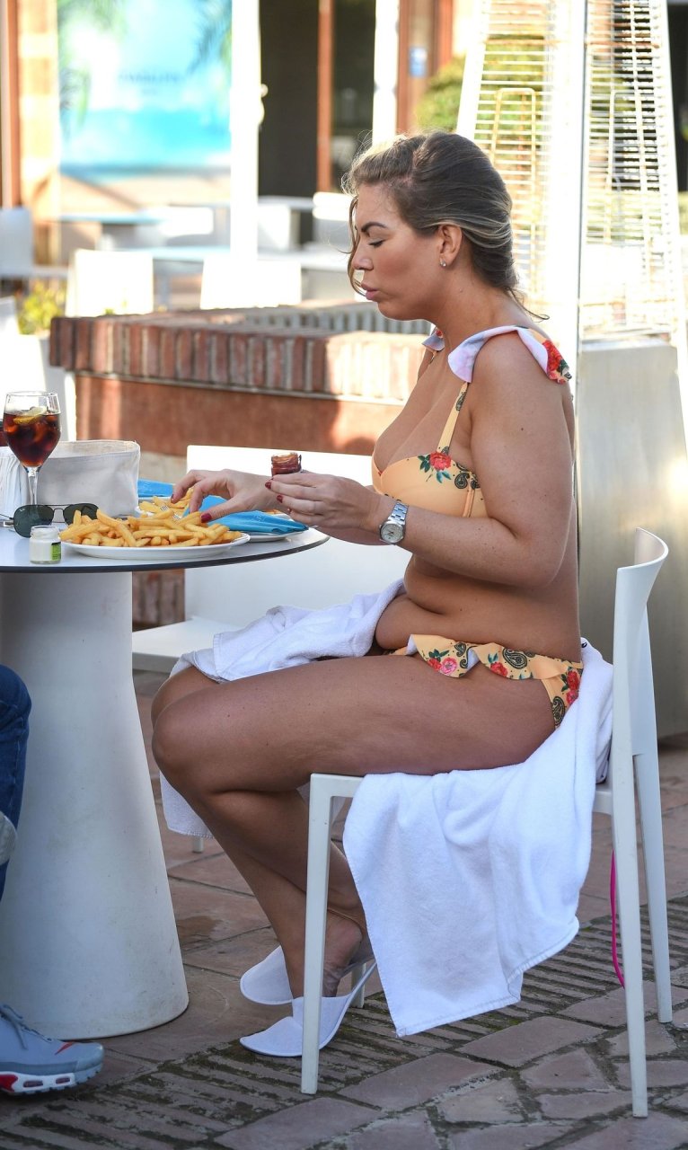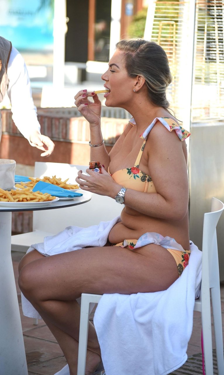La star di “The Only Way is Essex” Frankie Essex mostra la sua figura più piena a Tenerife, 25/01/2019. Frankie è vista mentre mangia patatine durante il pranzo.