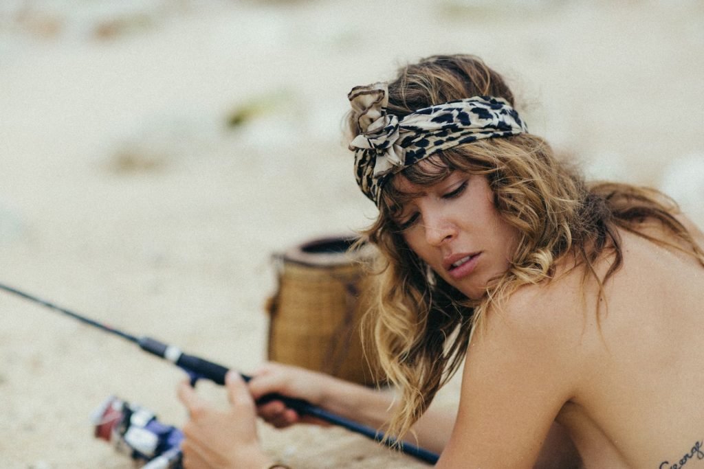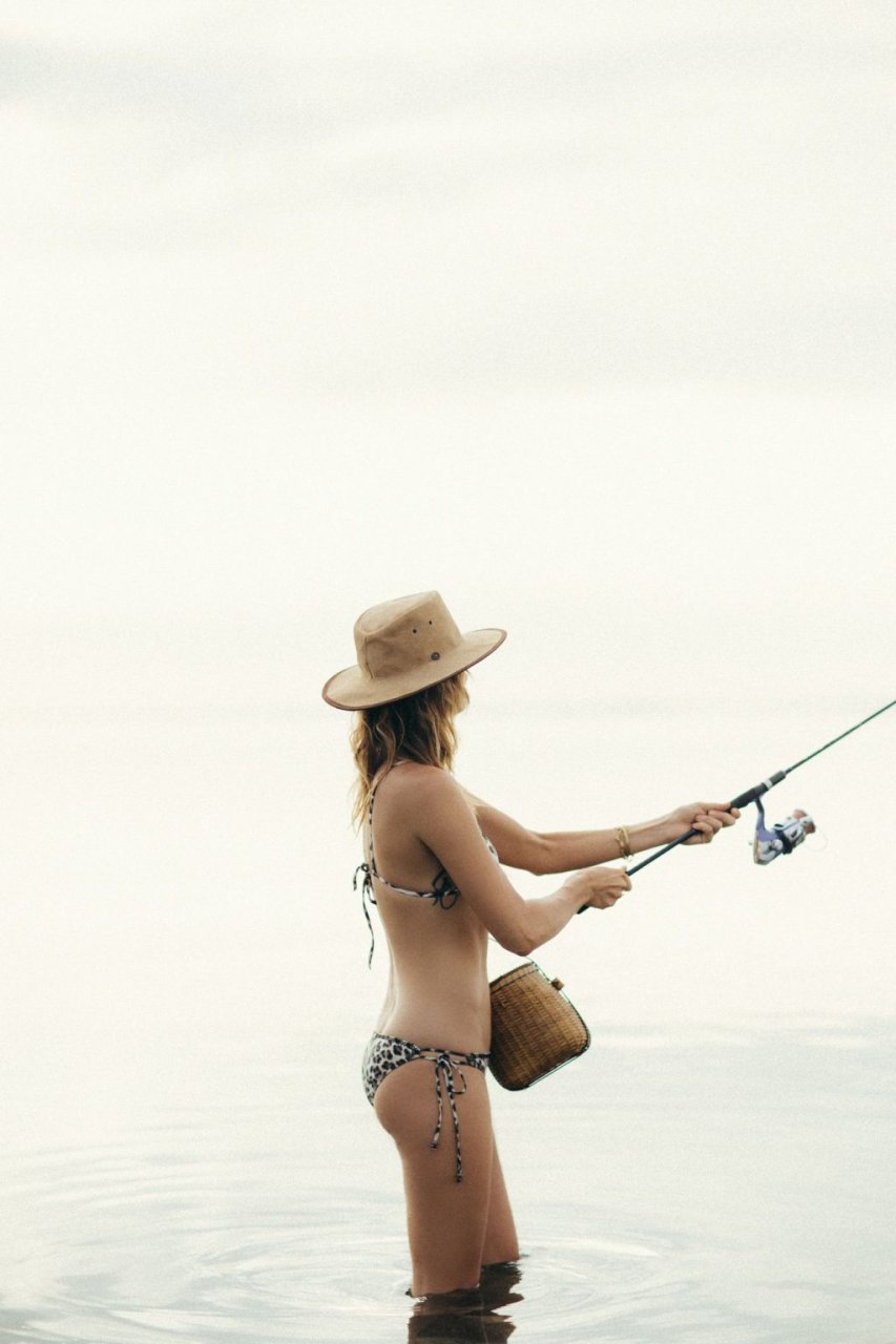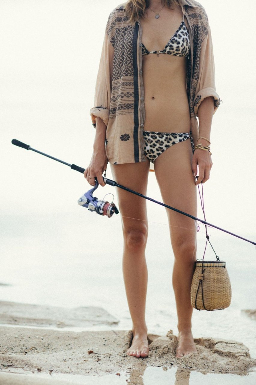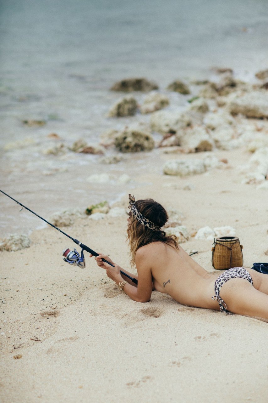 La modella tedesca Franziska von Tschurtschenthaler (Cisco) posa a seno nudo e in bikini mentre pesca in un servizio fotografico di Carly Brown (2019).