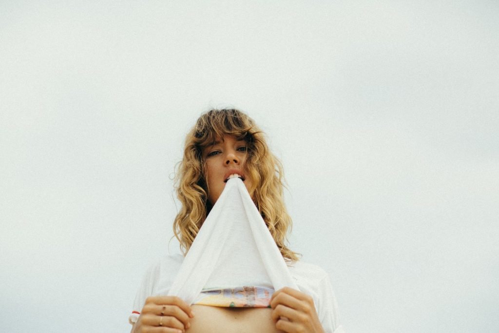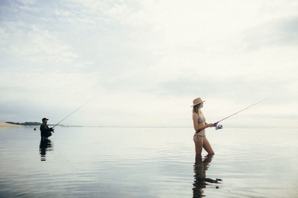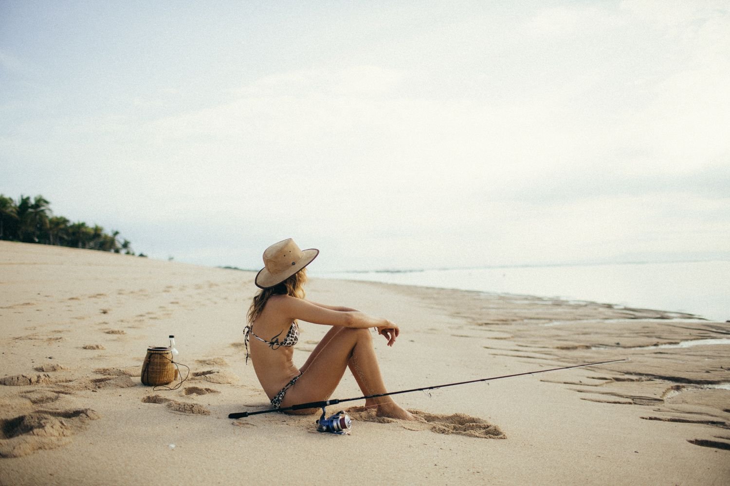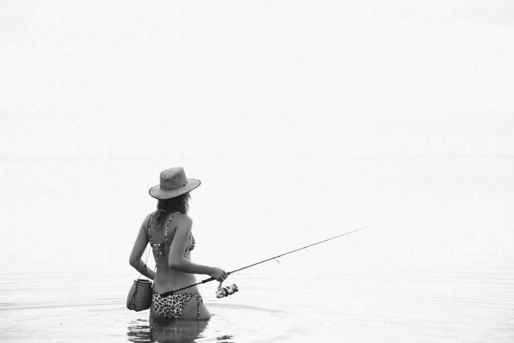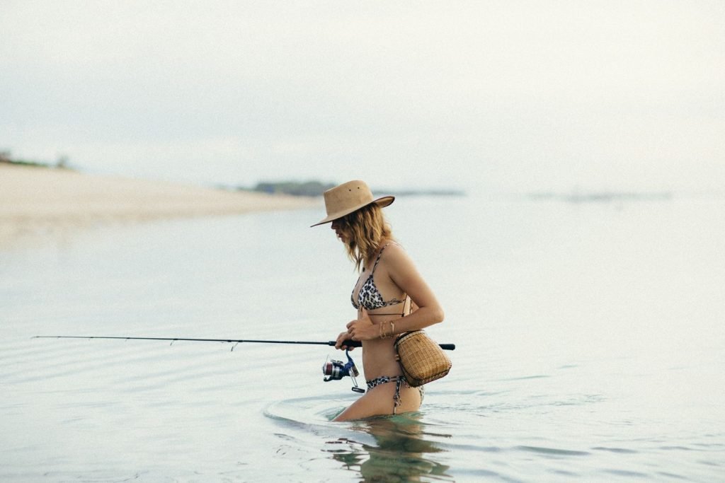 La modella tedesca Franziska von Tschurtschenthaler (Cisco) posa a seno nudo e in bikini mentre pesca in un servizio fotografico di Carly Brown (2019).