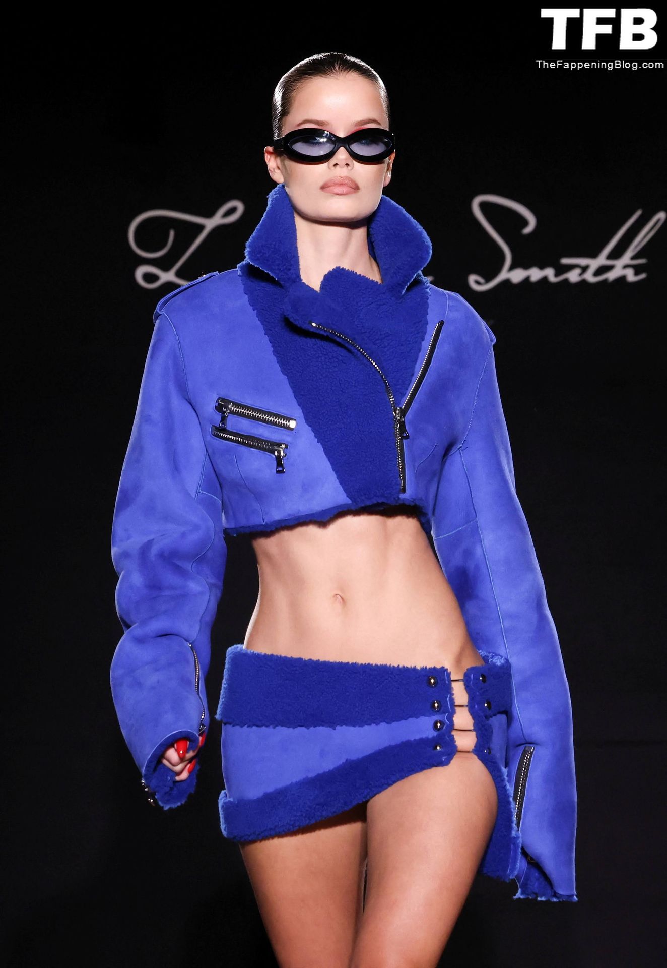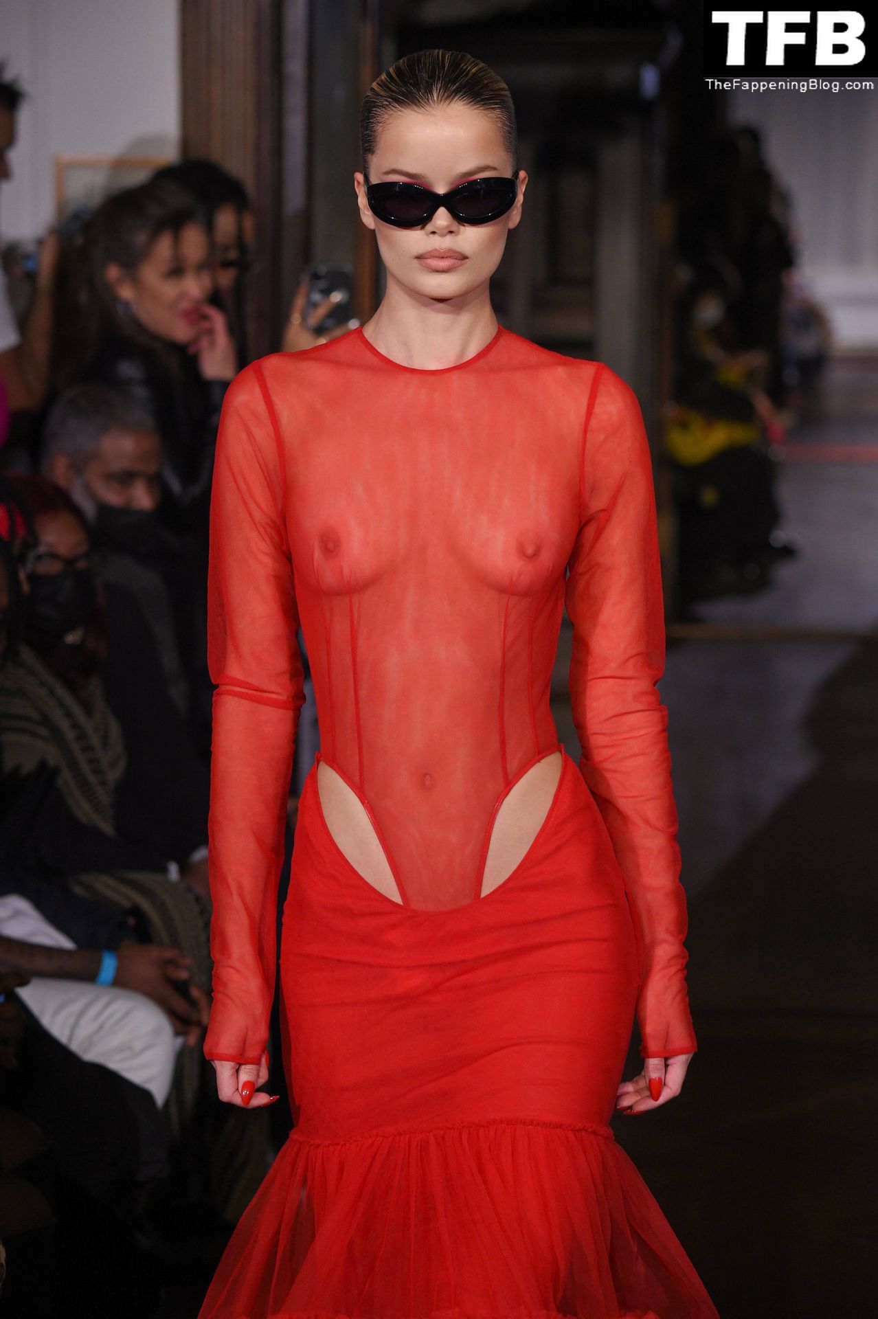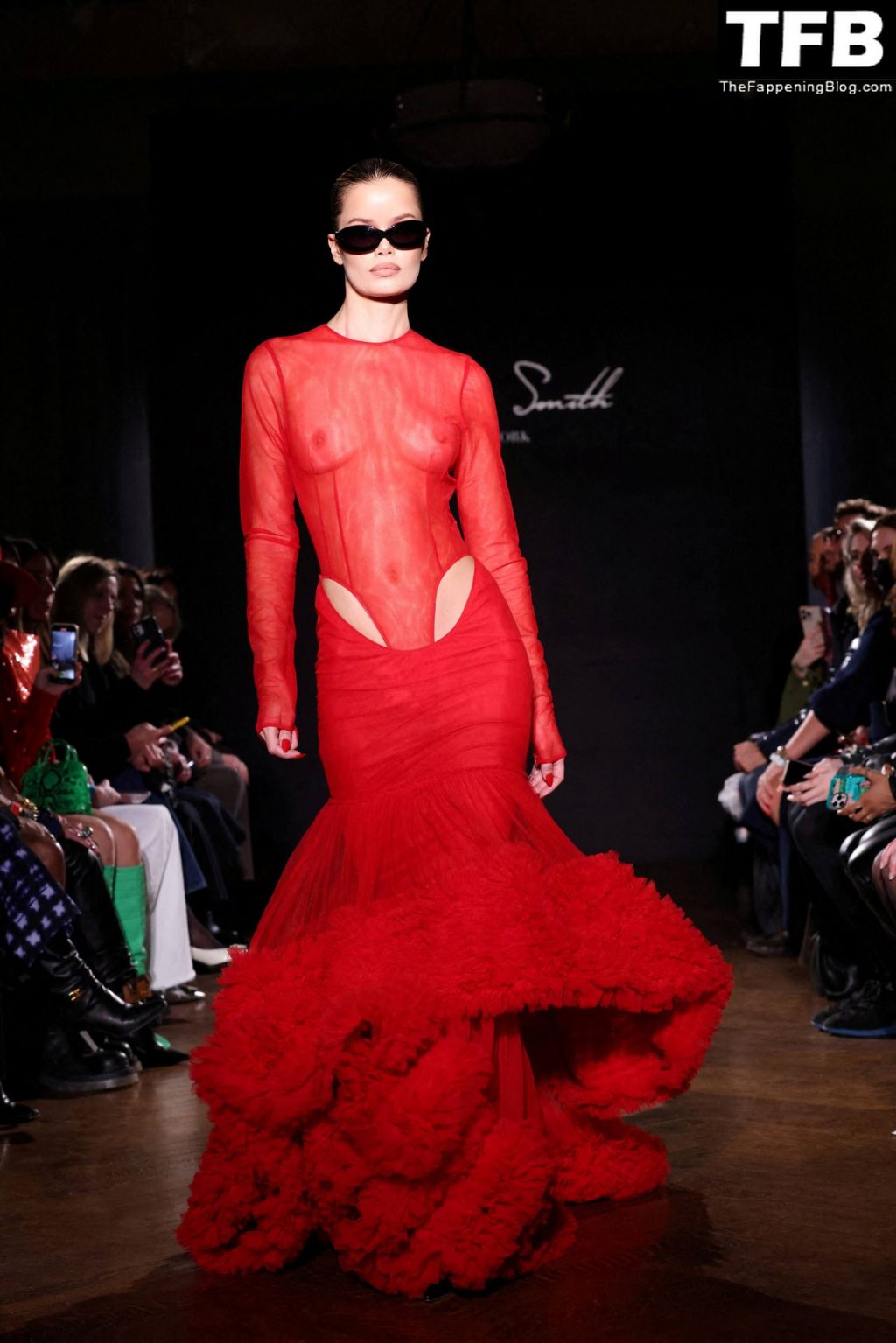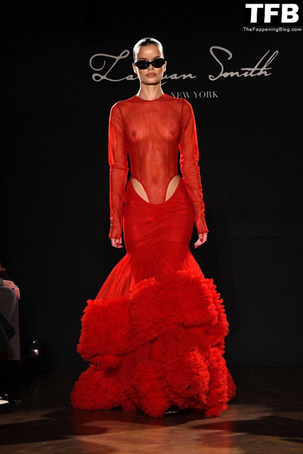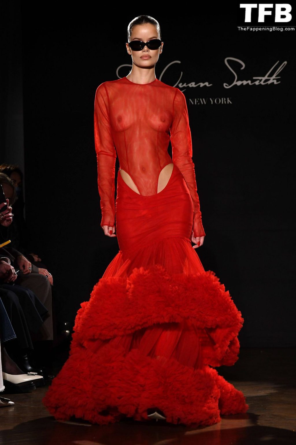 Modella Frida Aasen presenta le creazioni dell’ultima collezione di LaQuan Smith durante la settimana della moda a New York City, 14/02/2022.