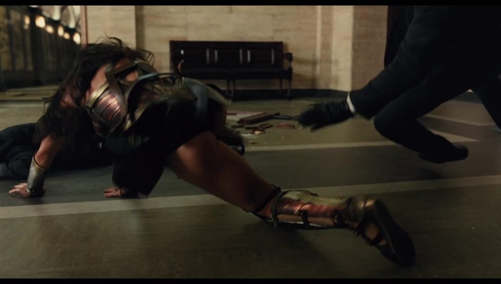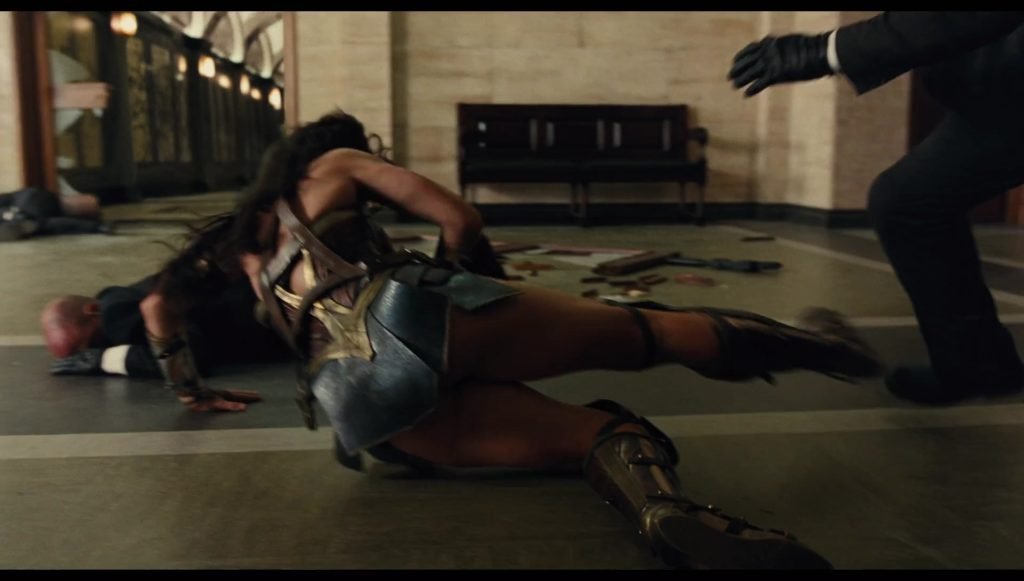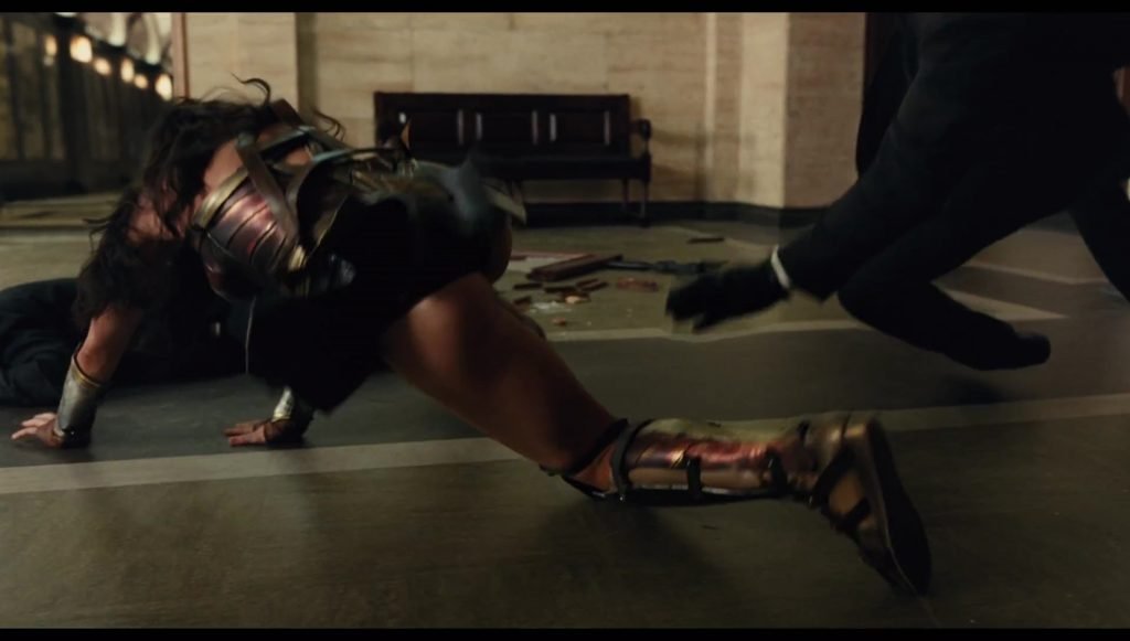 Penso che sia la sua controfigura a fare la spazzata con la gamba. La ripresa in cui lei è in piedi dopo è da un altro angolo e con un'altra inquadratura.