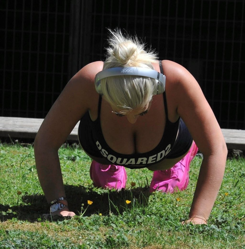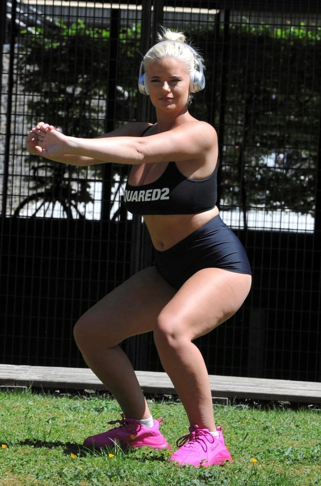 Modella glamour e influencer Apollonia Llewellyn (20), nota per guadagnare £10k al mese vendendo foto sexy online, abbastanza da permettersi 12 vacanze e una casa, fotografata mentre sfoggia un décolleté MOLTO prosperoso mentre si allena sudando in un parco a Manchester, 06/01/2020.