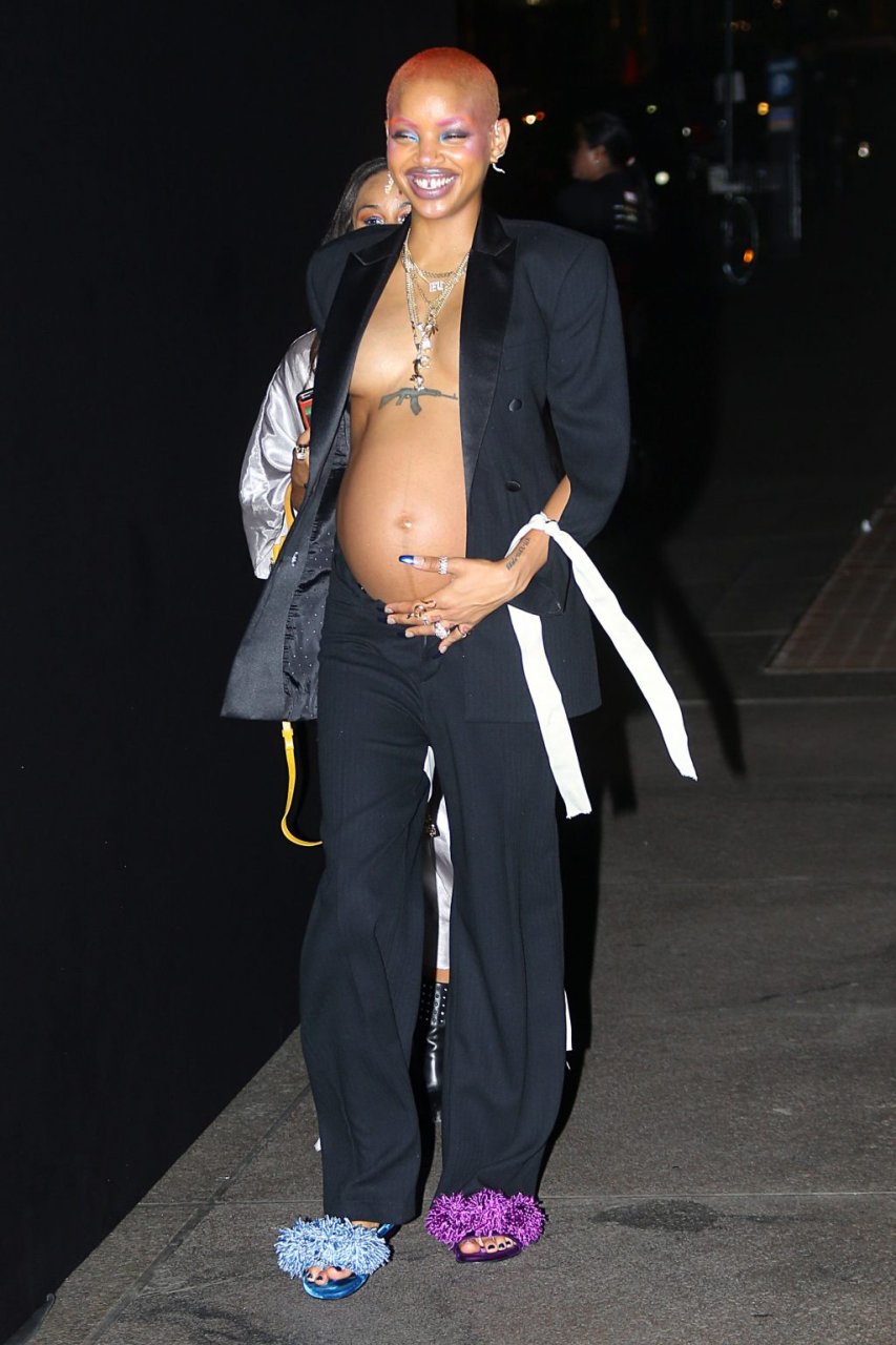 Slick Woods incinta e senza reggiseno partecipa alla festa di apertura della NYFW ospitata da E! Entertainment, ELLE e IMG, tenutasi presso il Seagram Building a New York, 05/09/2018. Slick Woods (Simone Thompson) è una modella americana di 22 anni.