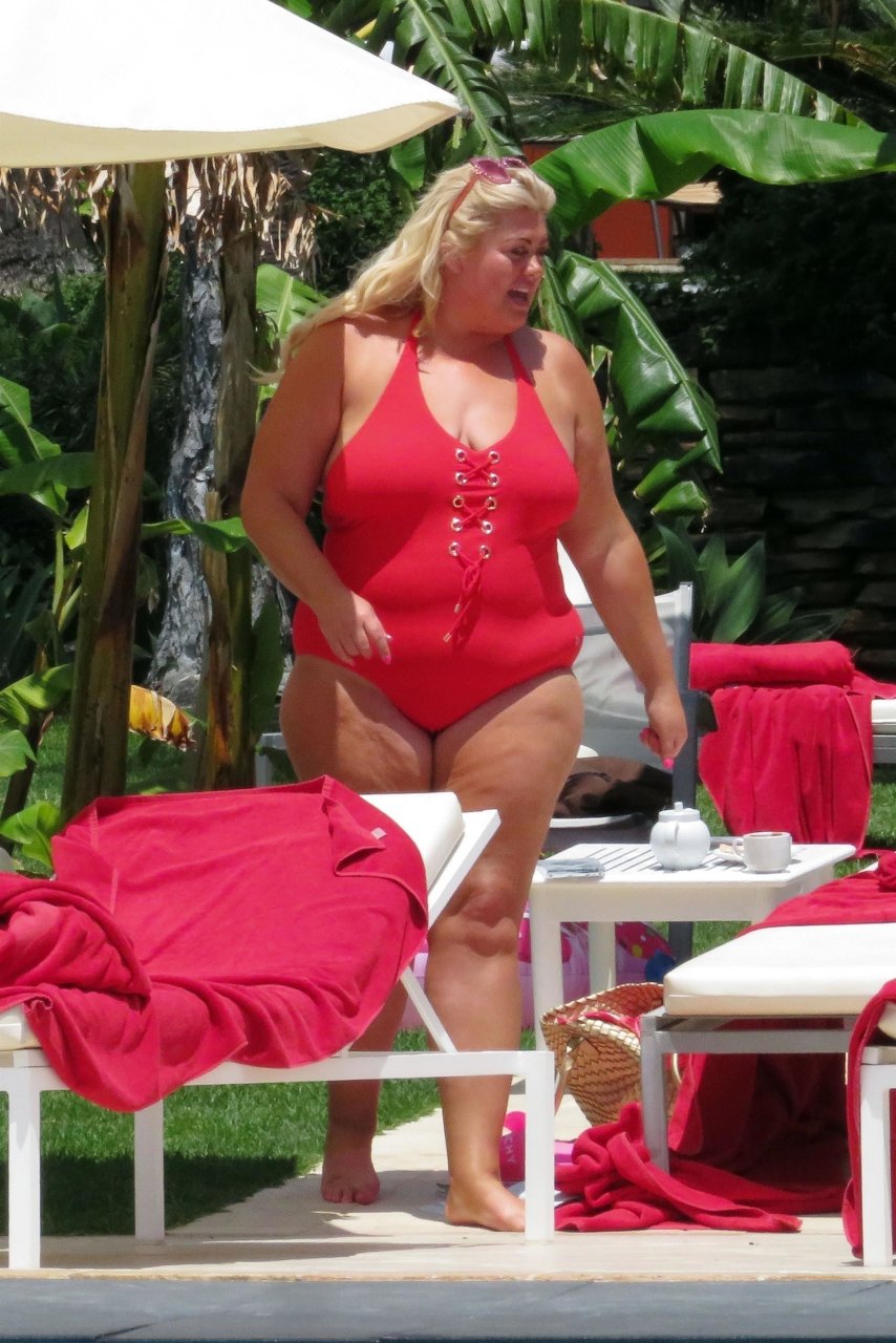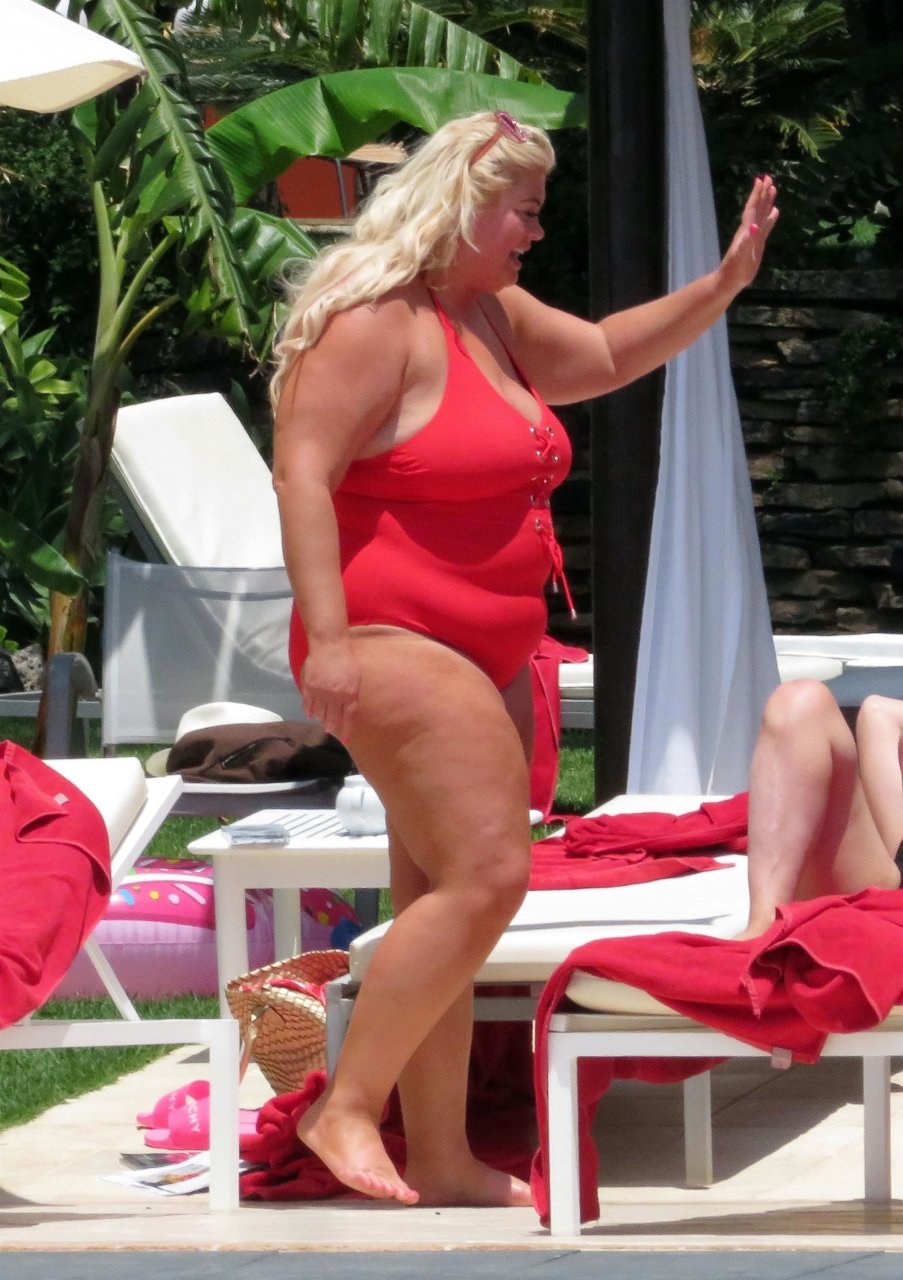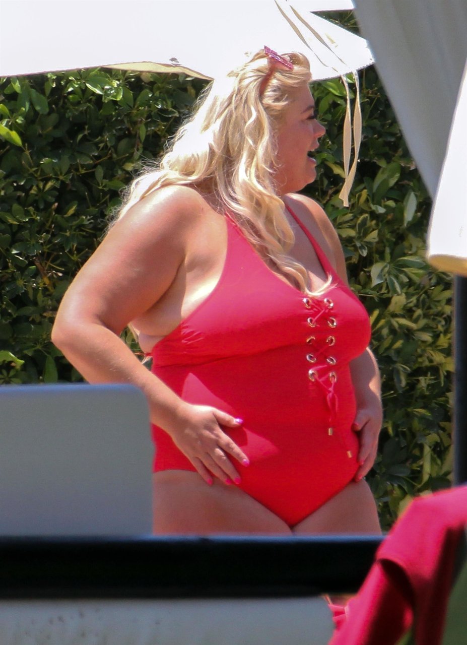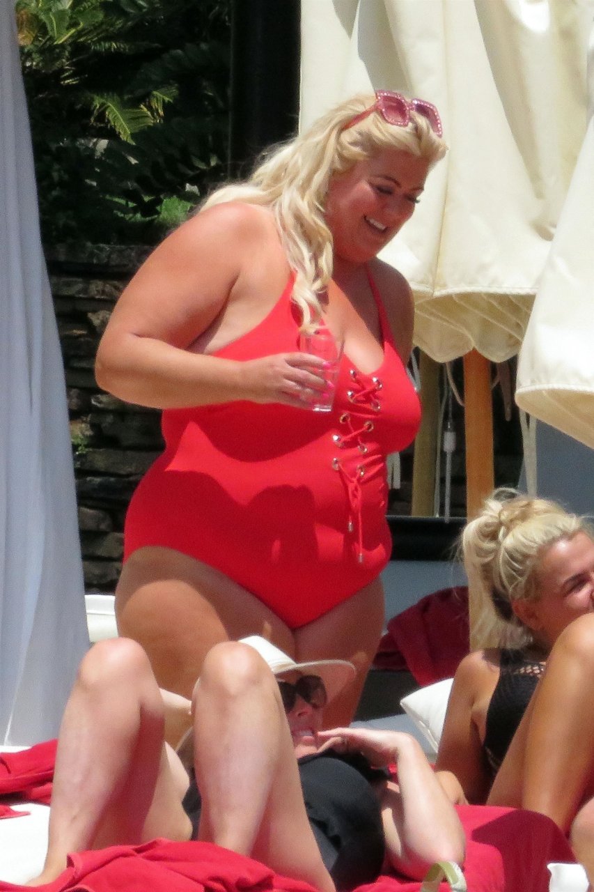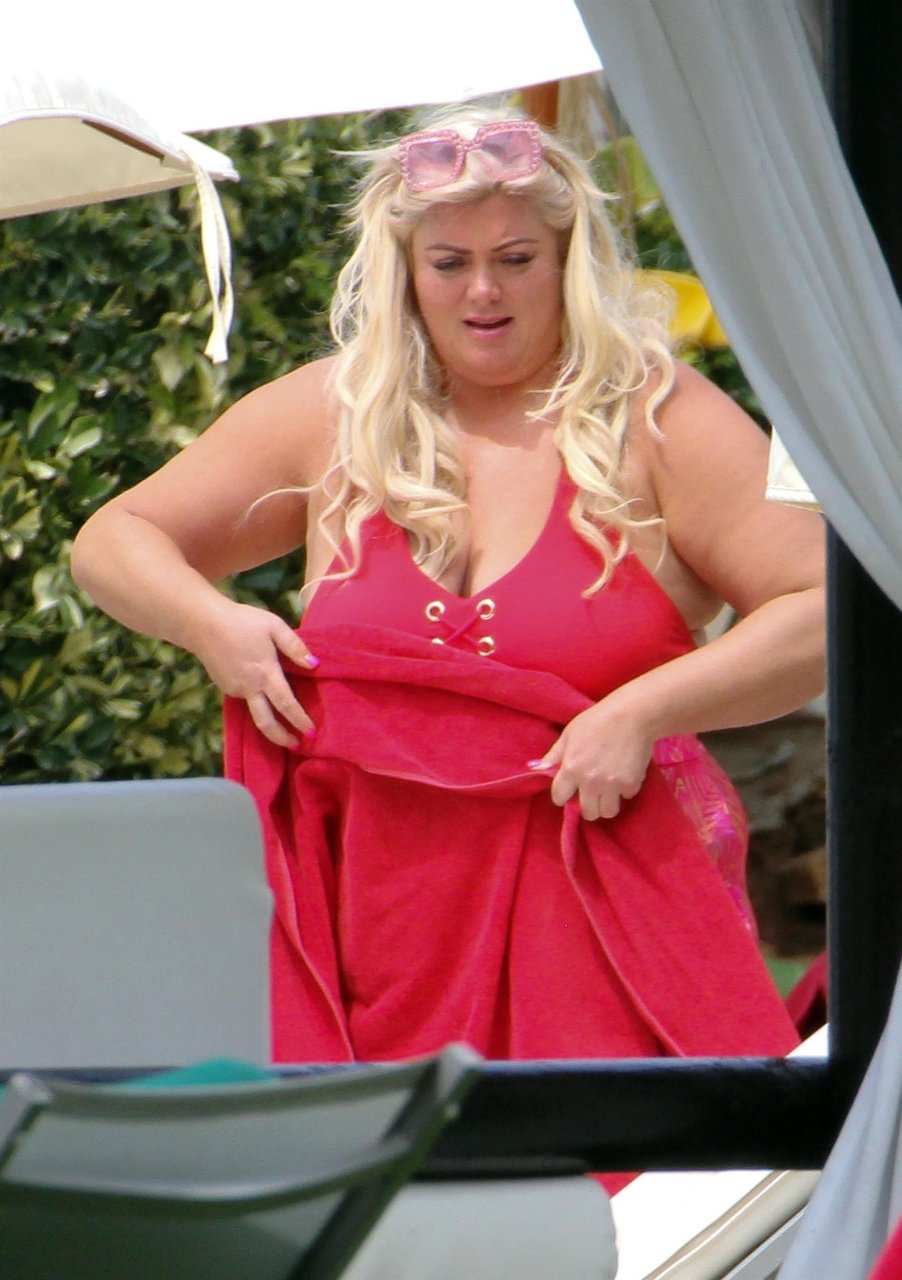Star di TOWIE Gemma Collins (37) ritratta mentre si rilassa a bordo piscina durante una vacanza in Spagna, 27/05/2018. L’ex star di CBB è stata vista rilassarsi con gli amici a bordo piscina con un costume da bagno rosa acceso e occhiali da sole mentre gustava bevande e ha persino fatto un selfie con alcuni fan prima di godersi un rilassante massaggio al corpo presso l’hotel alla moda di Marbella.