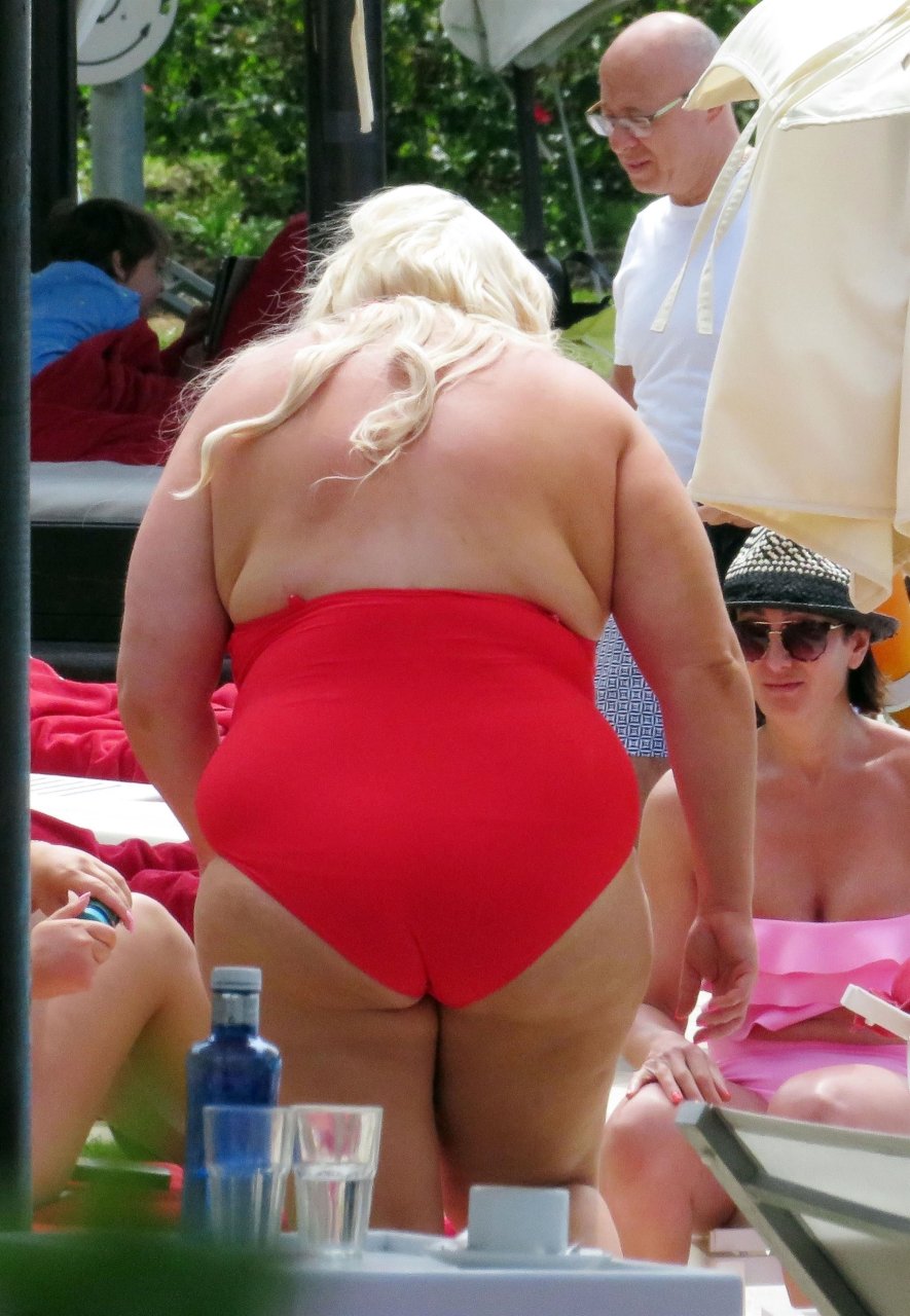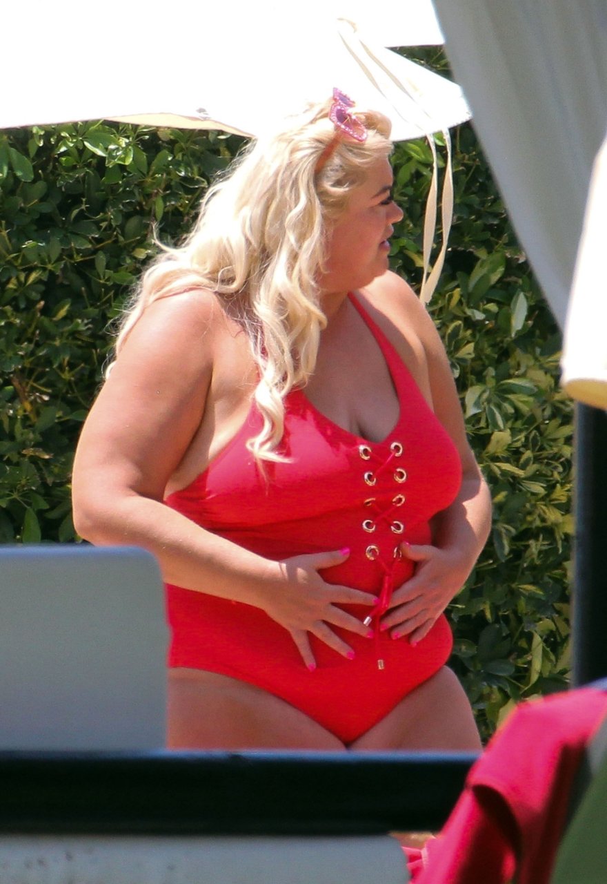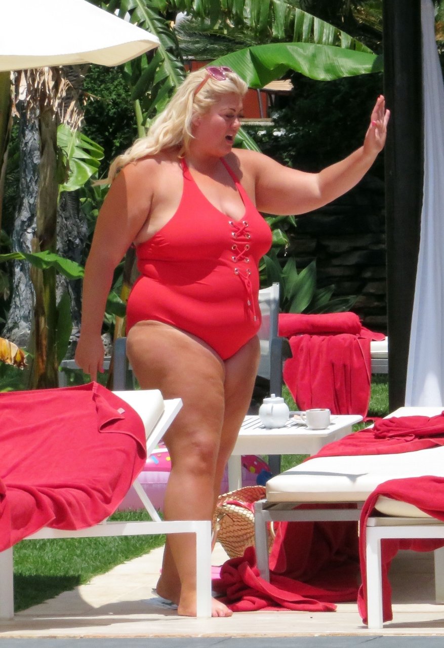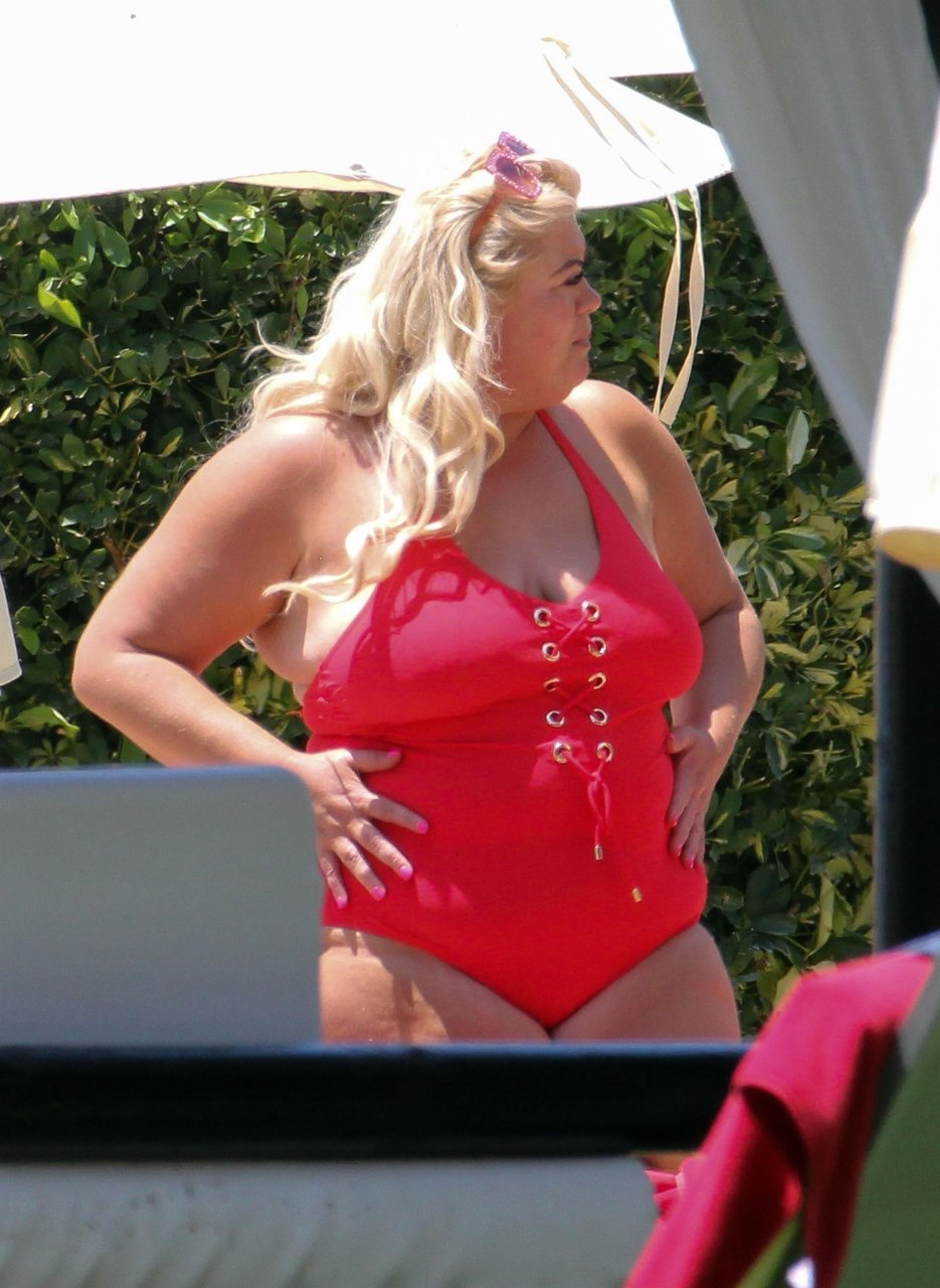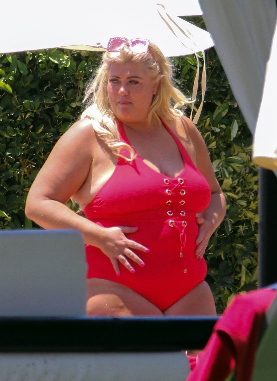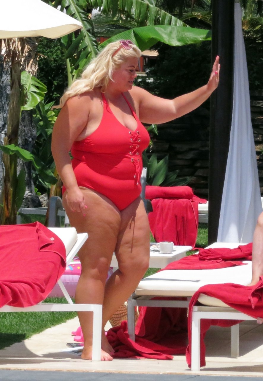 Star di TOWIE Gemma Collins (37) ritratta mentre si rilassa a bordo piscina durante una vacanza in Spagna, 27/05/2018. L’ex star di CBB è stata vista rilassarsi con gli amici a bordo piscina con un costume da bagno rosa acceso e occhiali da sole mentre gustava bevande e ha persino fatto un selfie con alcuni fan prima di godersi un rilassante massaggio al corpo presso l’hotel alla moda di Marbella.