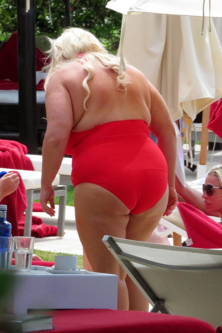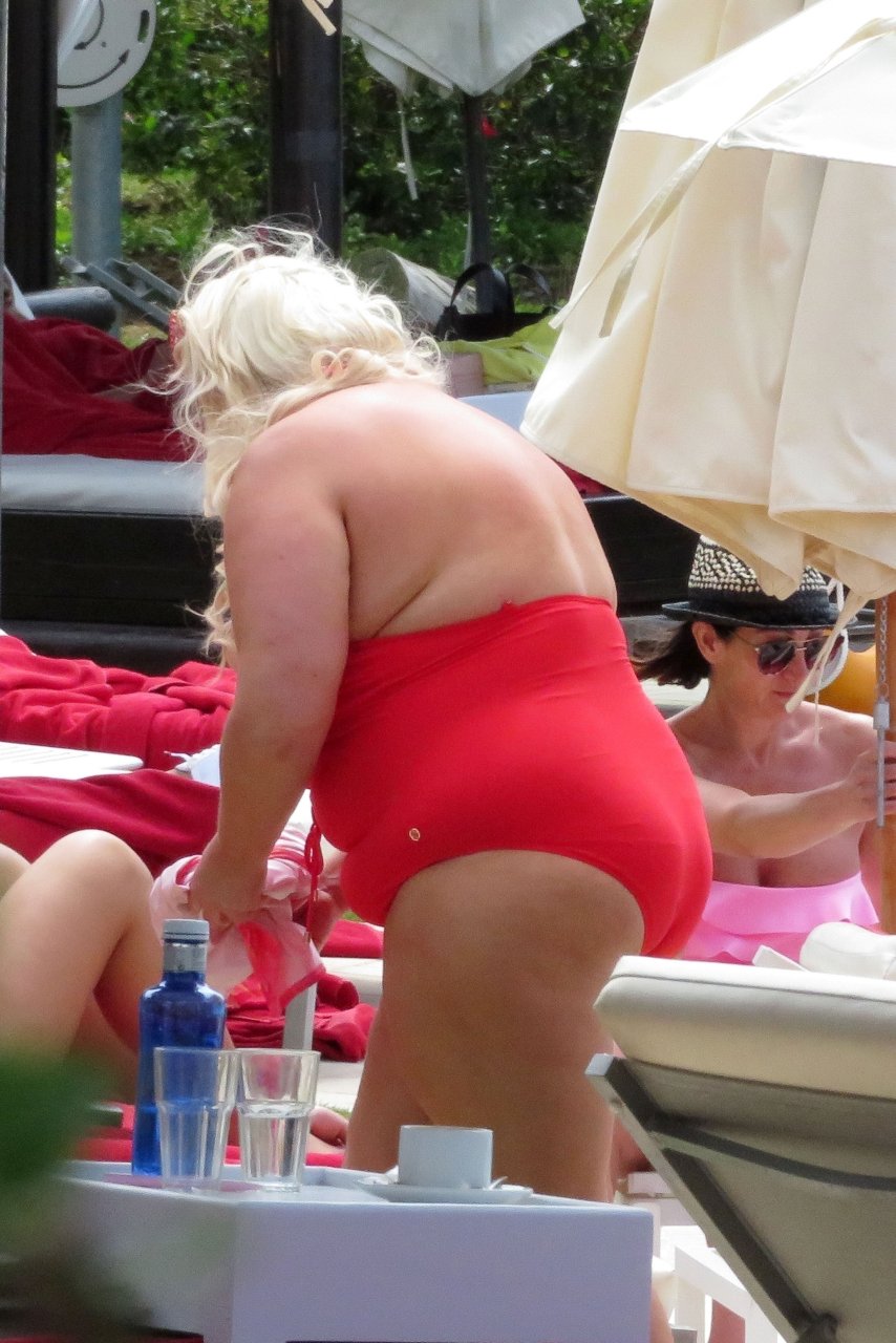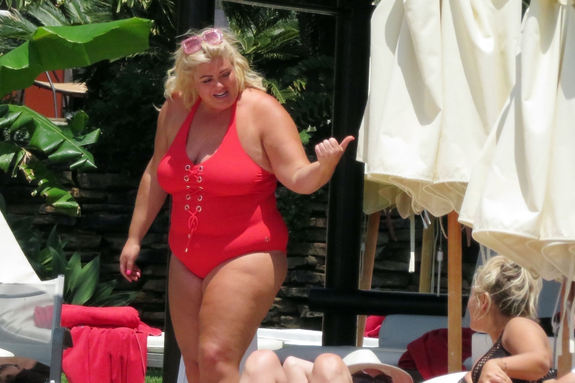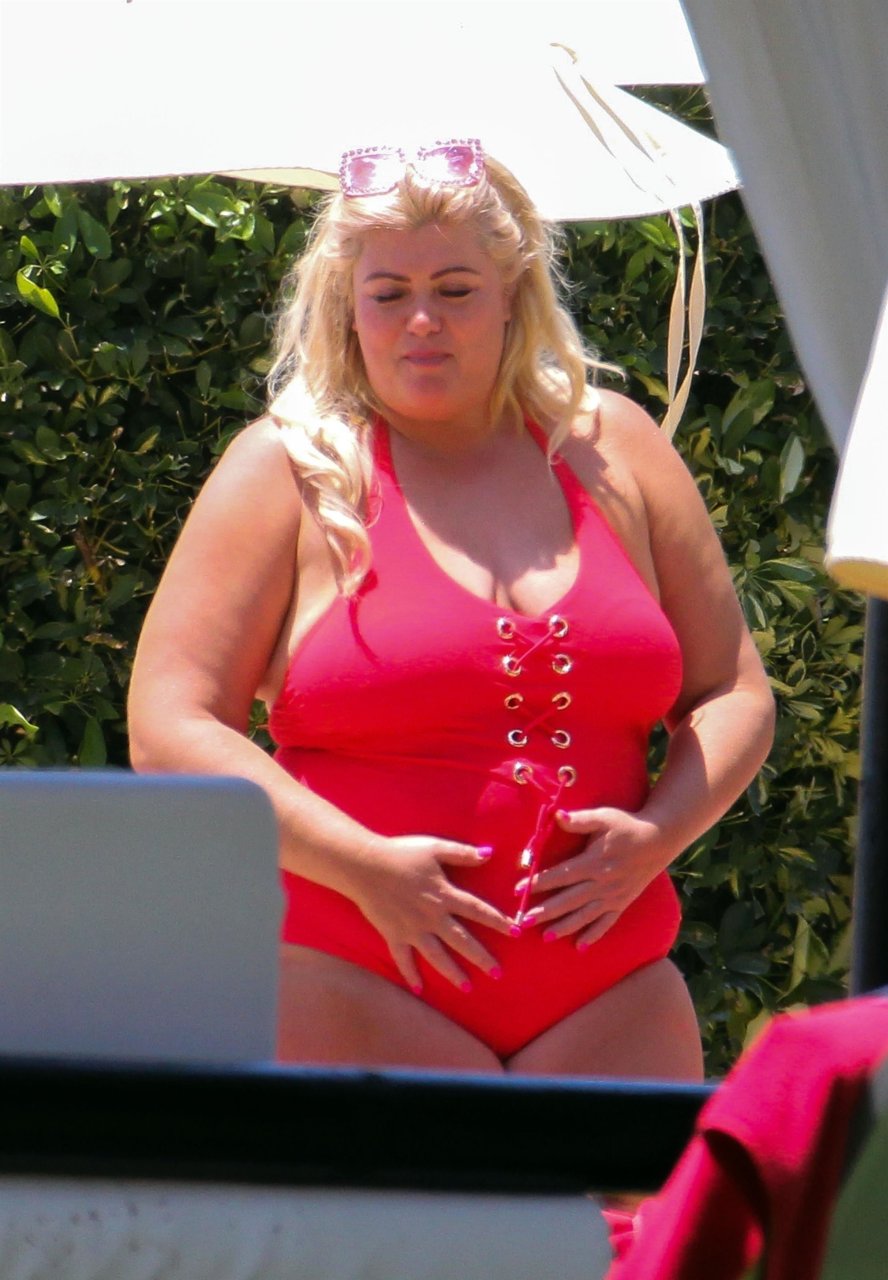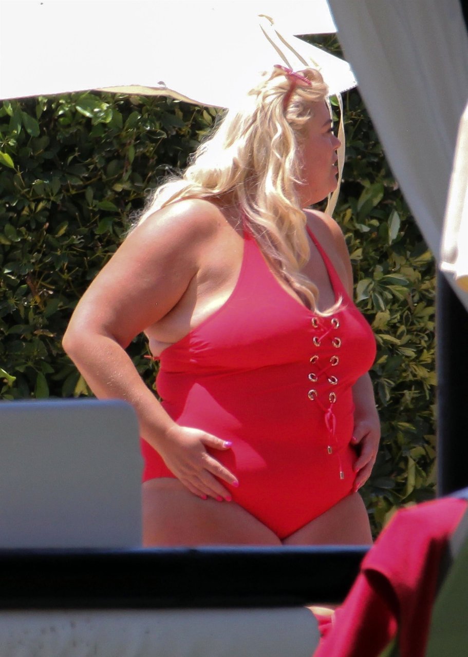 Star di TOWIE Gemma Collins (37) ritratta mentre si rilassa a bordo piscina durante una vacanza in Spagna, 27/05/2018. L’ex star di CBB è stata vista rilassarsi con gli amici a bordo piscina con un costume da bagno rosa acceso e occhiali da sole mentre gustava bevande e ha persino fatto un selfie con alcuni fan prima di godersi un rilassante massaggio al corpo presso l’hotel alla moda di Marbella.