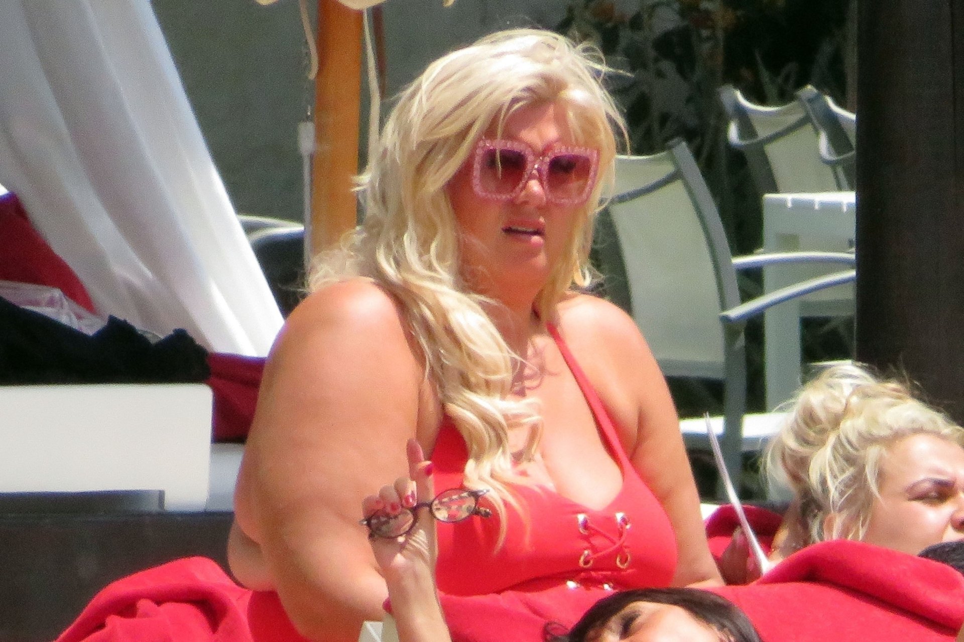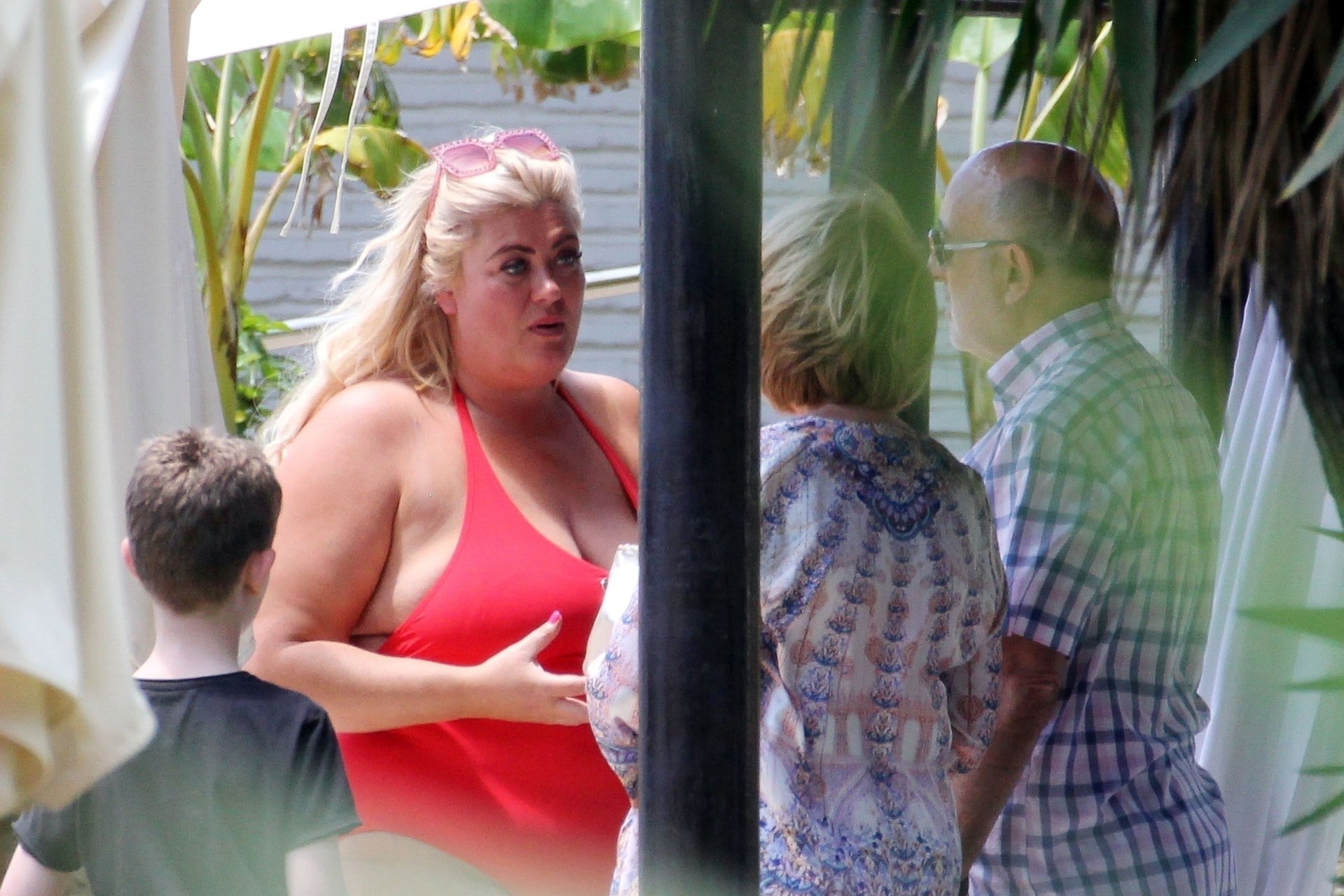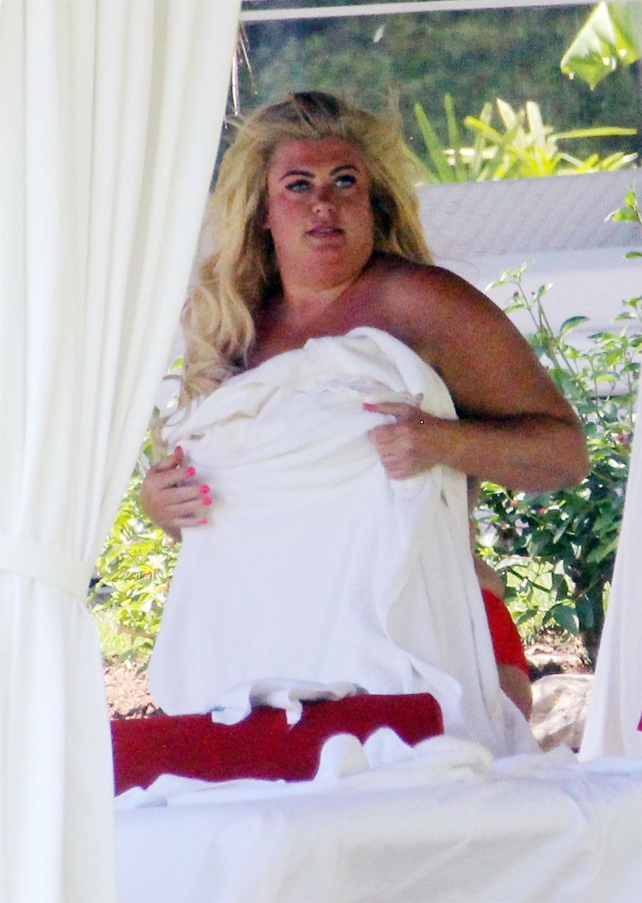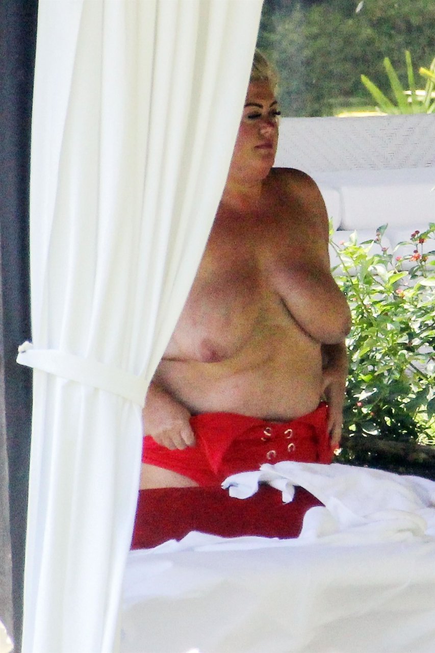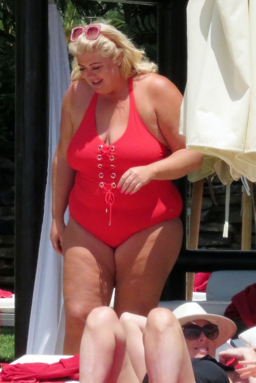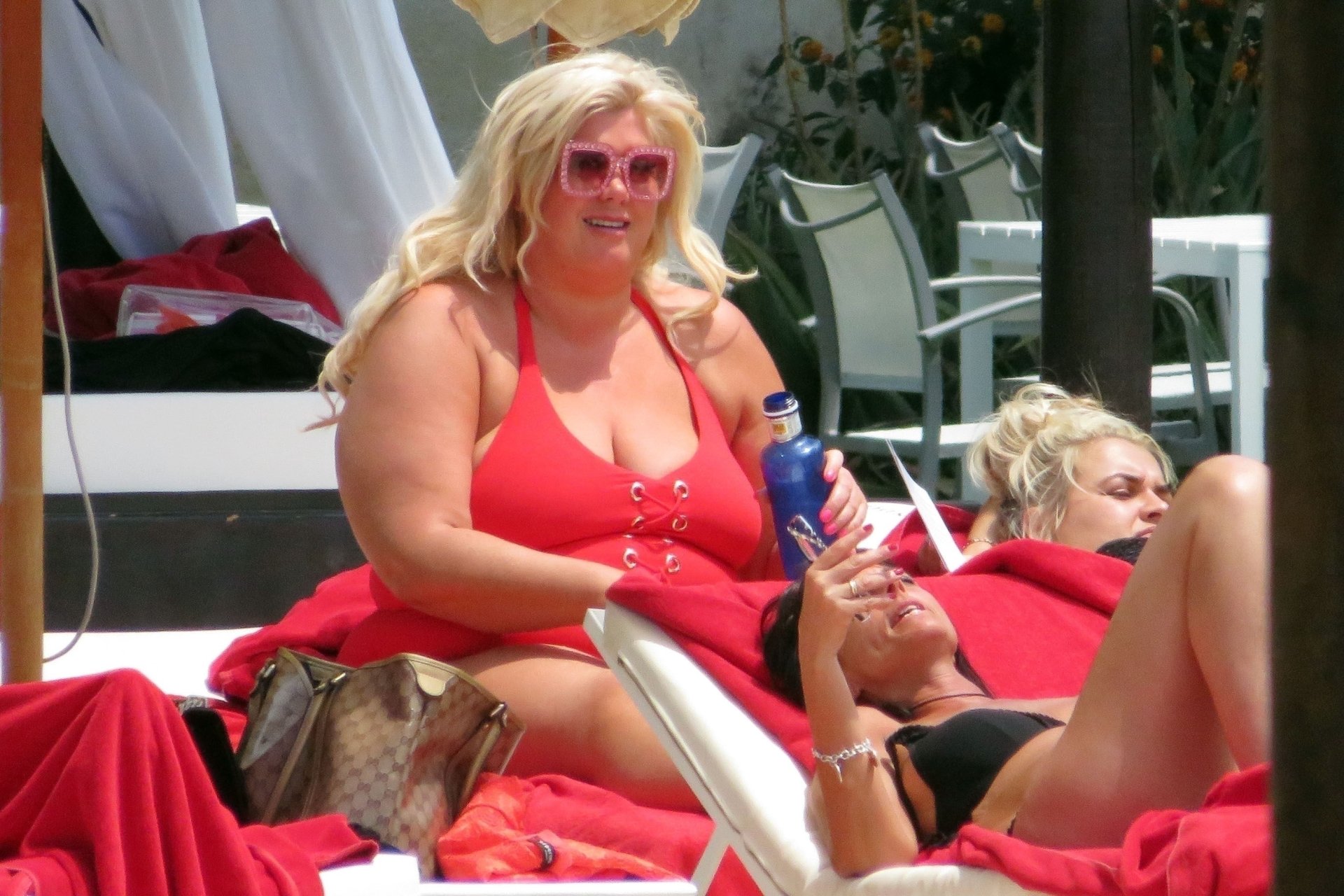 Star di TOWIE Gemma Collins (37) ritratta mentre si rilassa a bordo piscina durante una vacanza in Spagna, 27/05/2018. L’ex star di CBB è stata vista rilassarsi con gli amici a bordo piscina con un costume da bagno rosa acceso e occhiali da sole mentre gustava bevande e ha persino fatto un selfie con alcuni fan prima di godersi un rilassante massaggio al corpo presso l’hotel alla moda di Marbella.