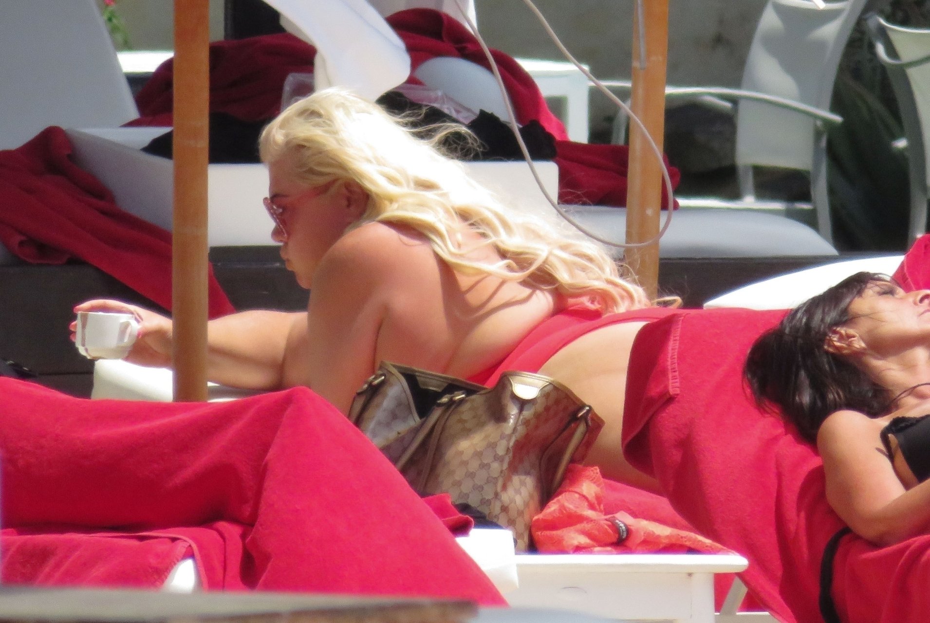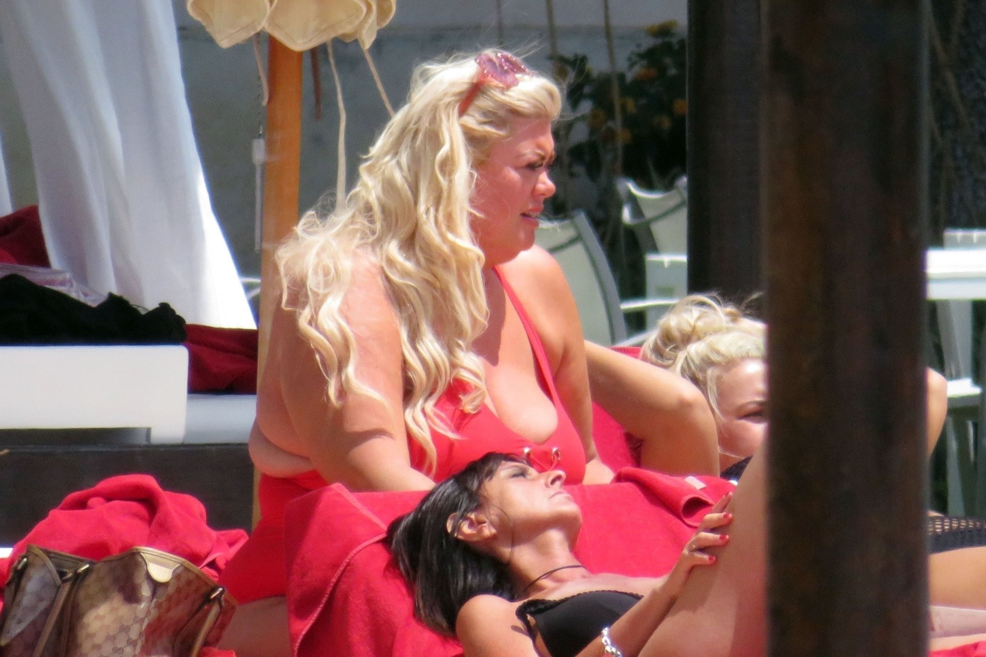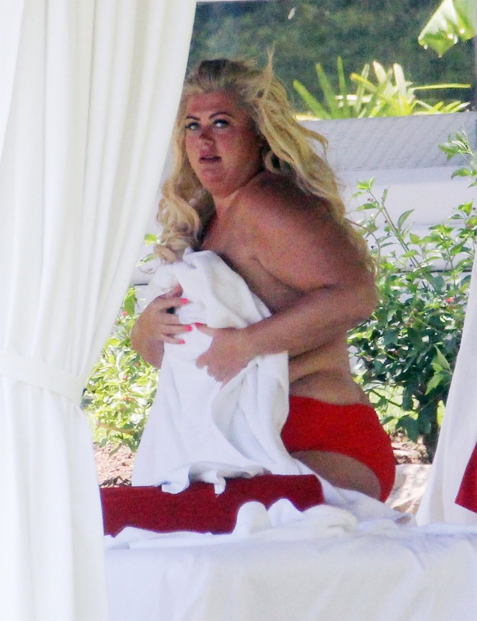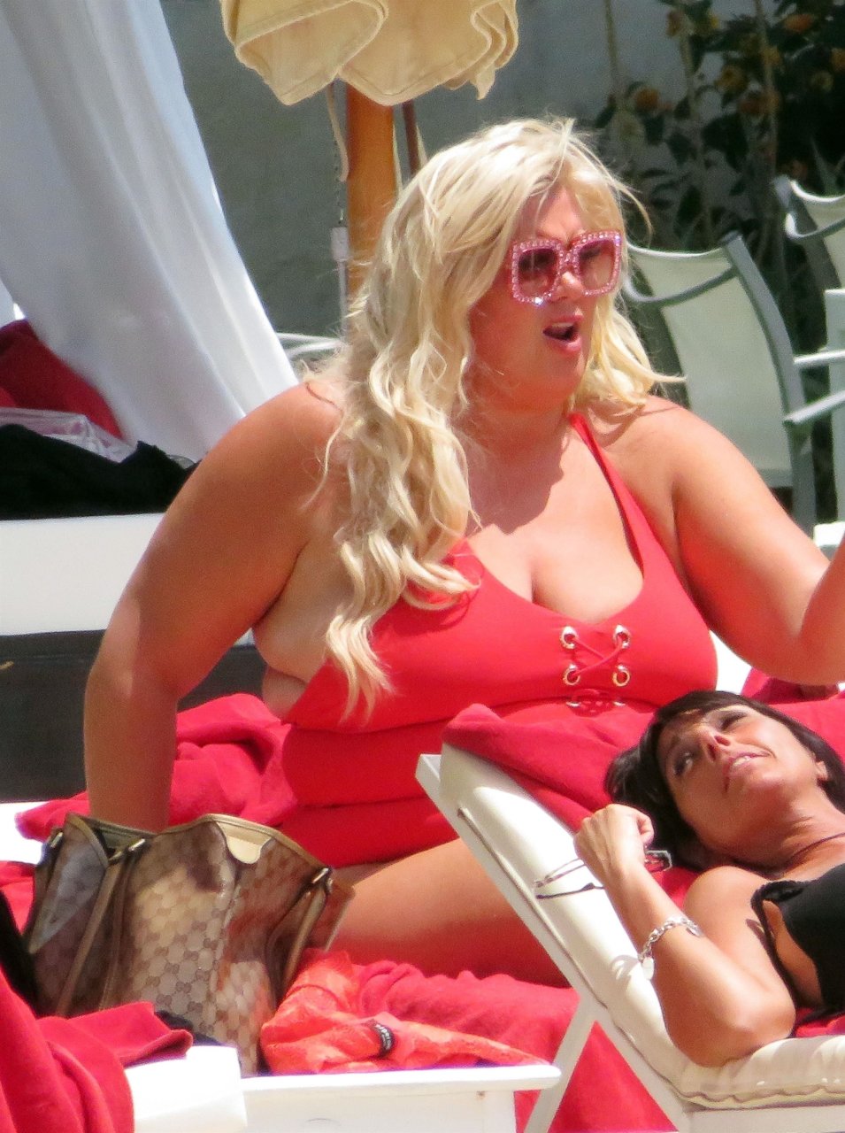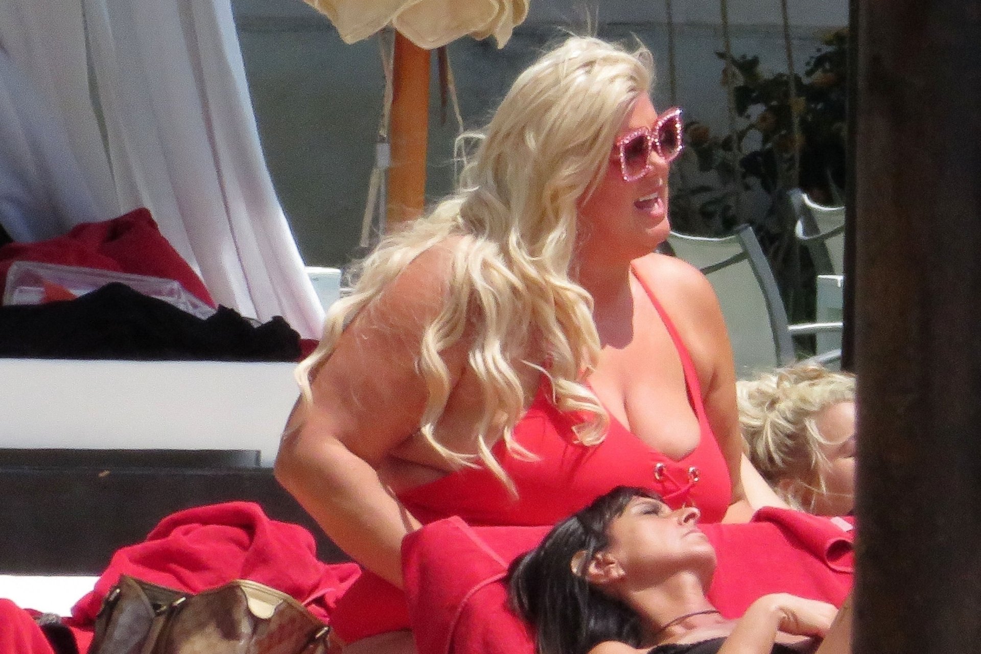 Star di TOWIE Gemma Collins (37) ritratta mentre si rilassa a bordo piscina durante una vacanza in Spagna, 27/05/2018. L’ex star di CBB è stata vista rilassarsi con gli amici a bordo piscina con un costume da bagno rosa acceso e occhiali da sole mentre gustava bevande e ha persino fatto un selfie con alcuni fan prima di godersi un rilassante massaggio al corpo presso l’hotel alla moda di Marbella.