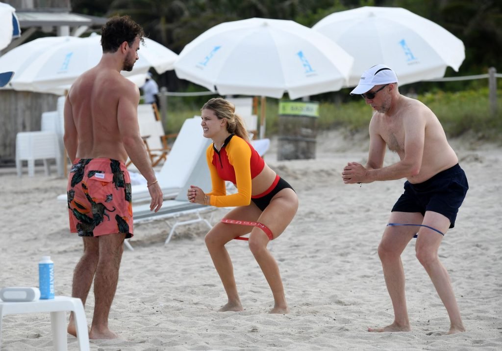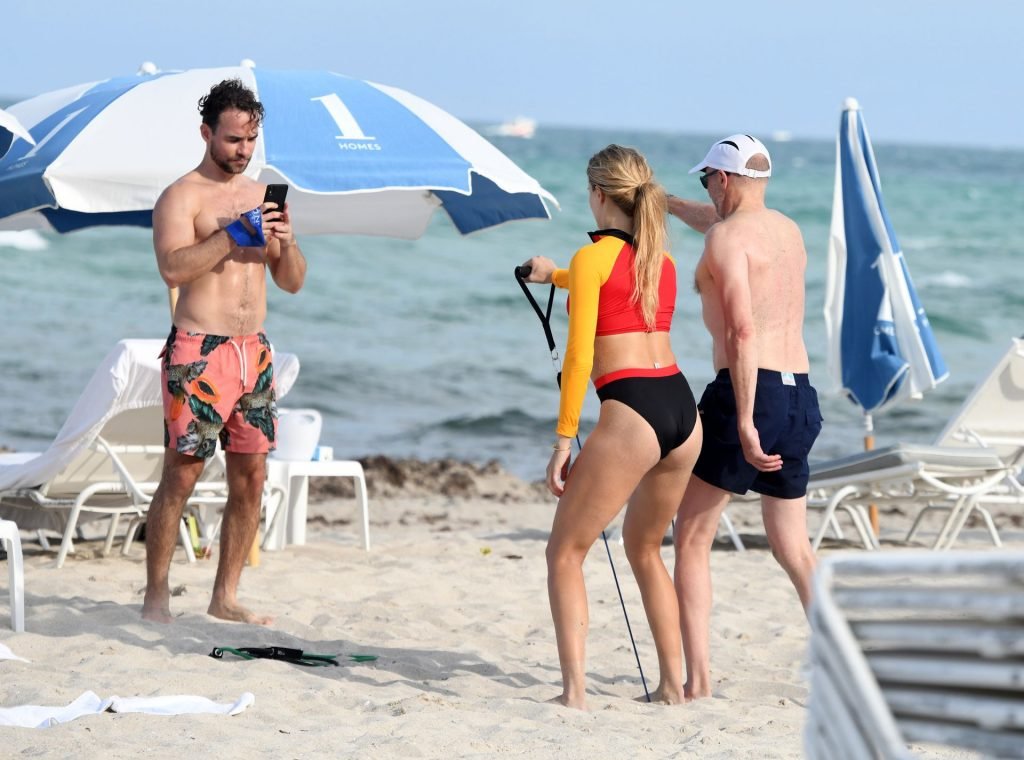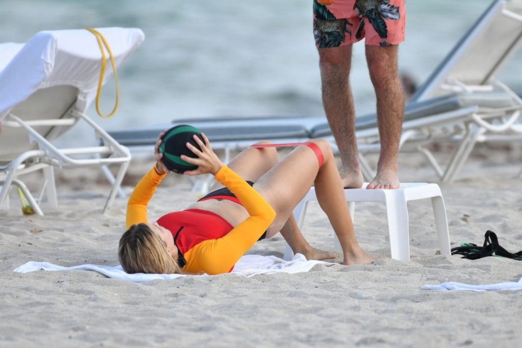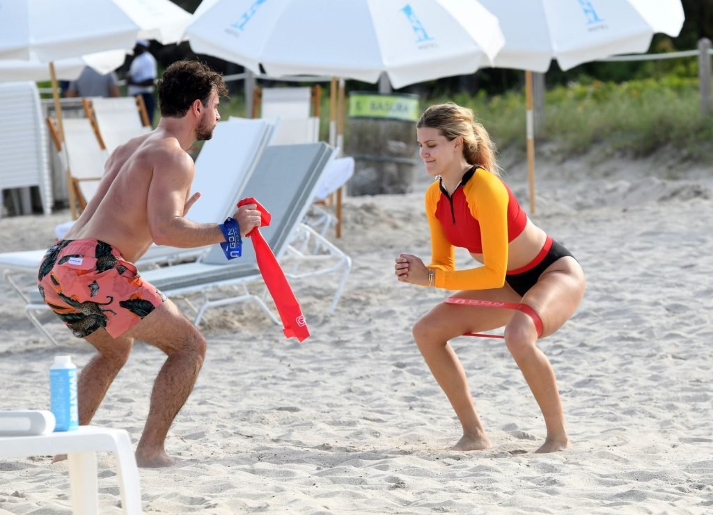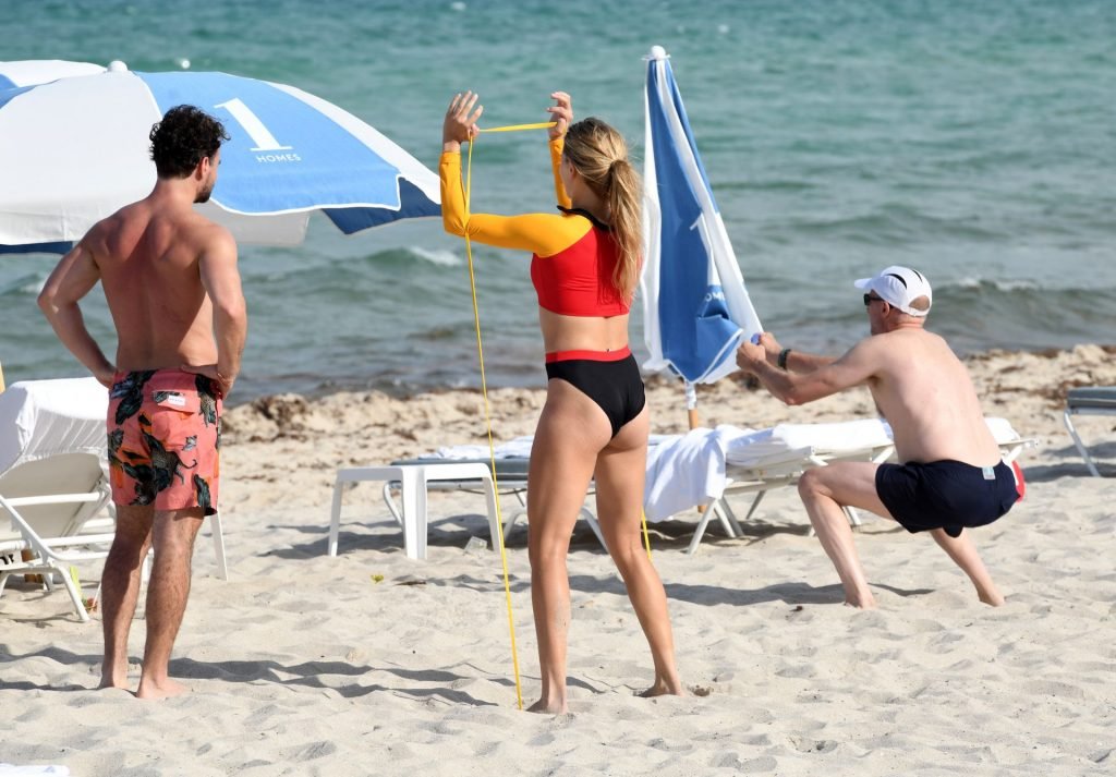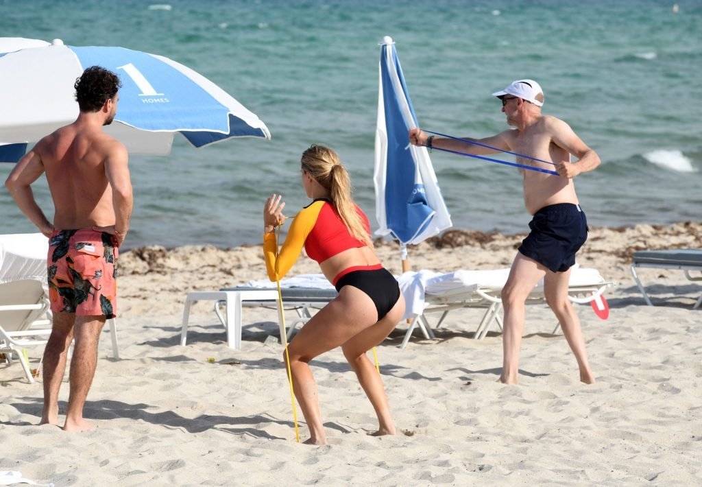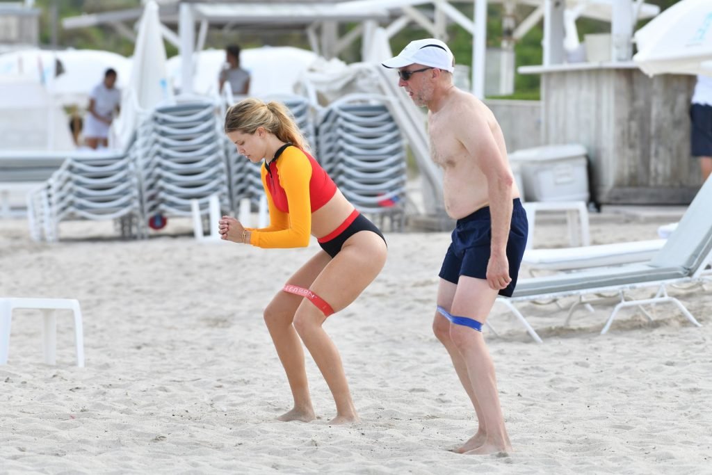 Eugenie Bouchard viene messa alla prova dal suo aitante personal trainer mentre fa un allenamento intenso sulla spiaggia con suo padre Mike – Miami, 18/05/2019. La tennista canadese indossava un top bikini a maniche lunghe di colore acceso e slip bikini abbinati, mostrando la sua incredibile figura mentre eseguiva un allenamento vario con bande di resistenza e una palla, con suo padre Mike che partecipava all’azione.