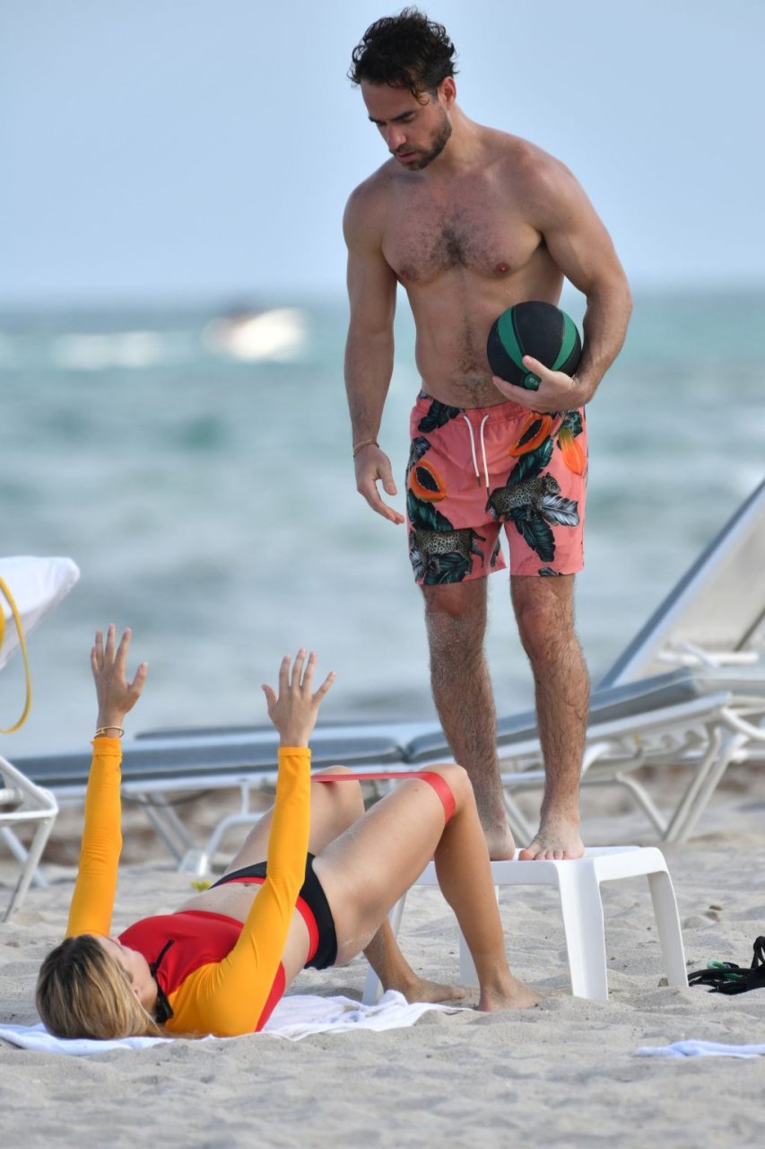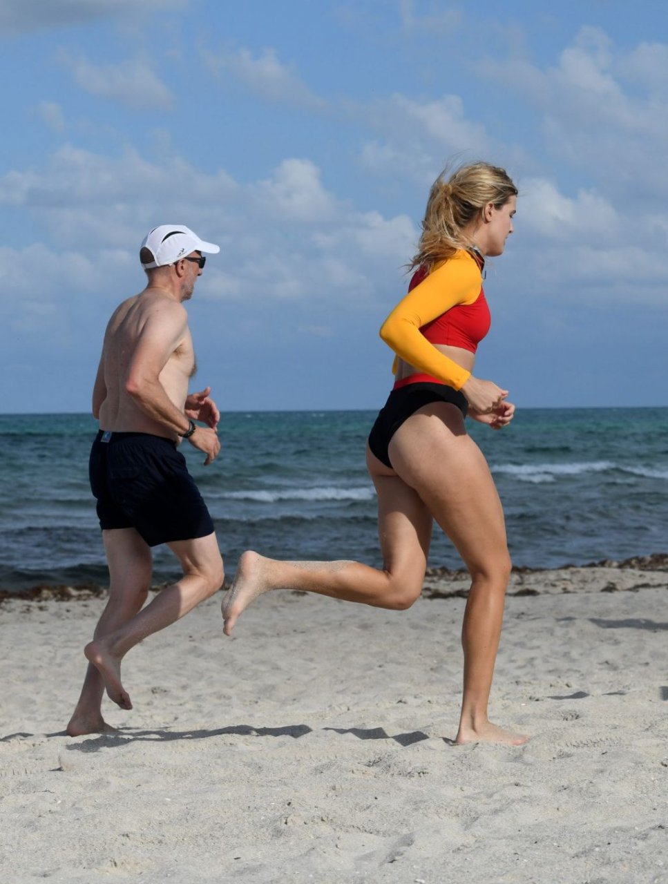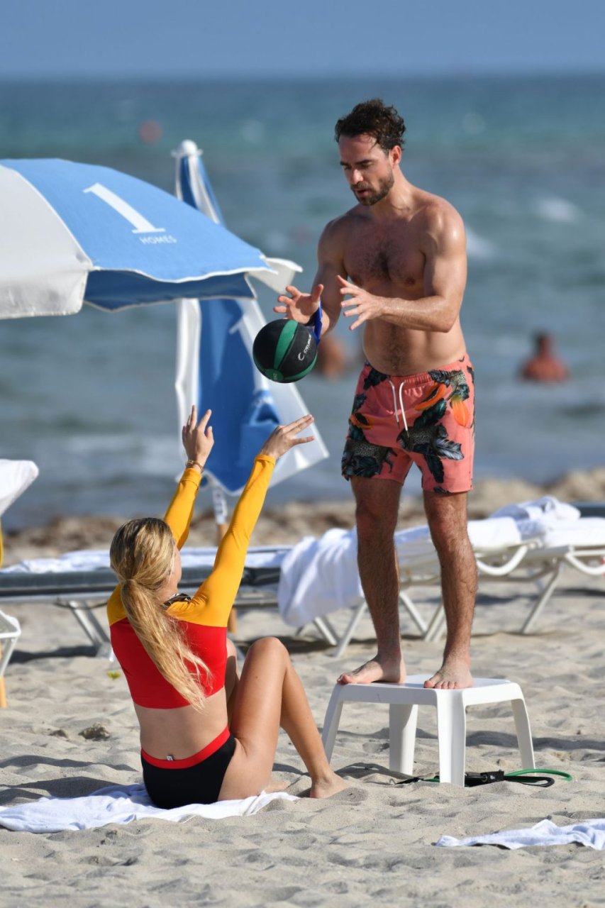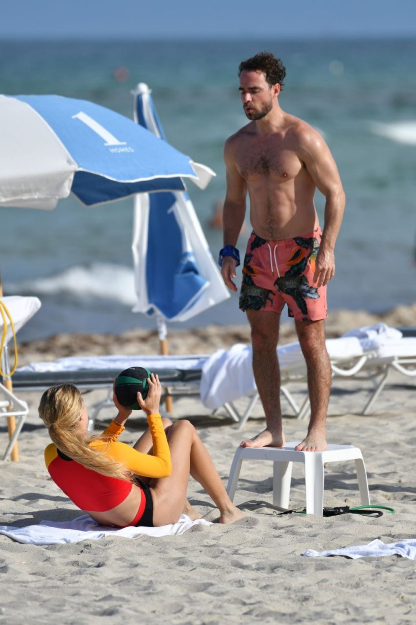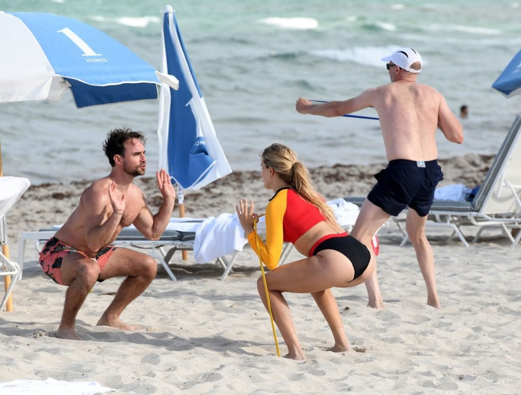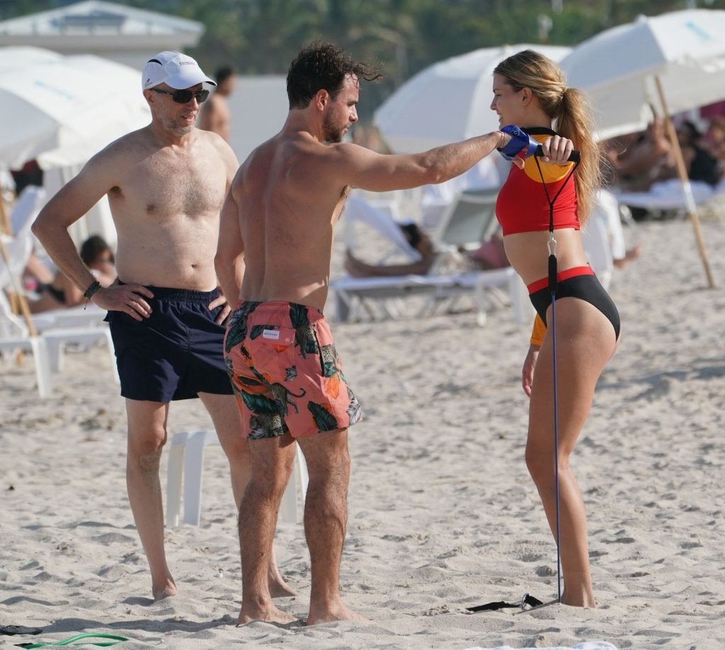 Eugenie Bouchard viene messa alla prova dal suo aitante personal trainer mentre fa un allenamento intenso sulla spiaggia con suo padre Mike – Miami, 18/05/2019. La tennista canadese indossava un top bikini a maniche lunghe di colore acceso e slip bikini abbinati, mostrando la sua incredibile figura mentre eseguiva un allenamento vario con bande di resistenza e una palla, con suo padre Mike che partecipava all’azione.