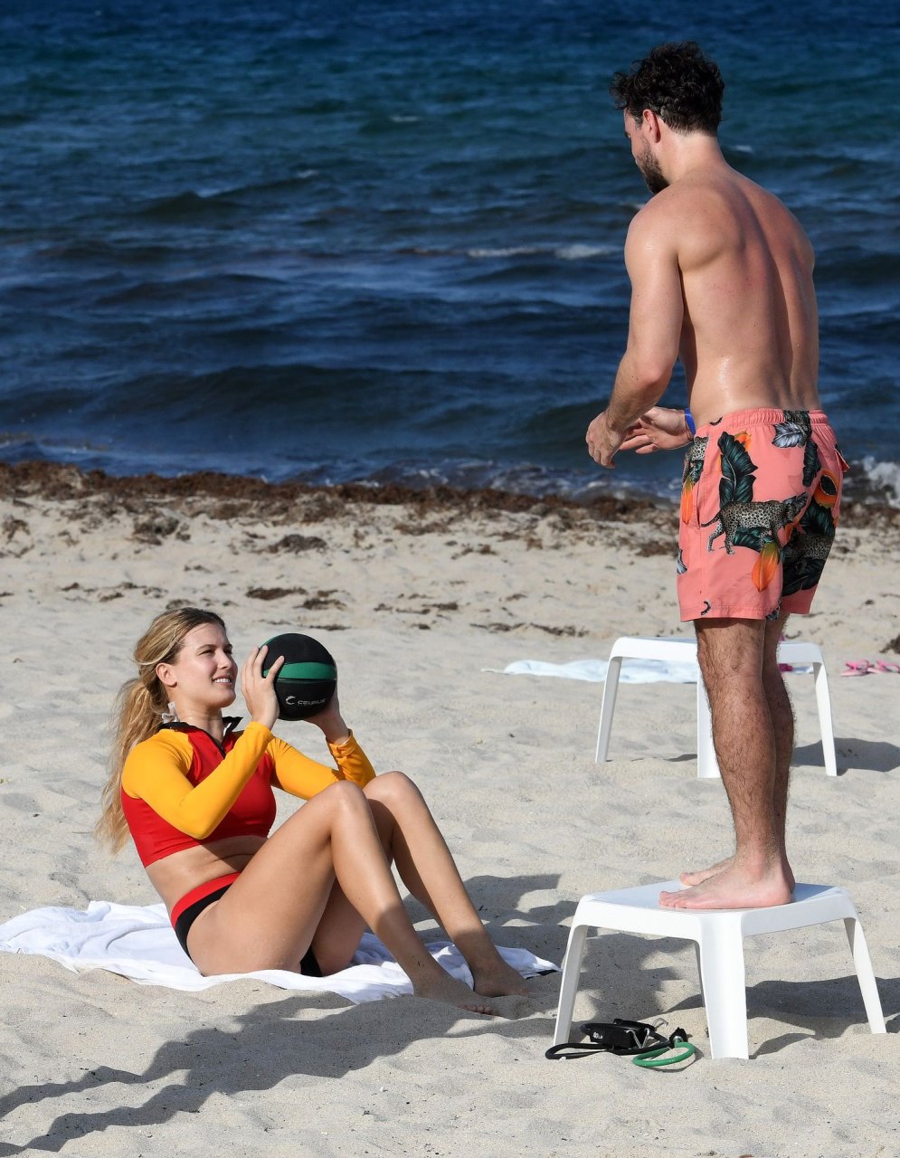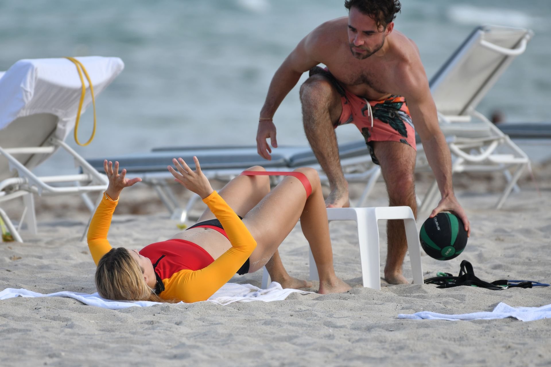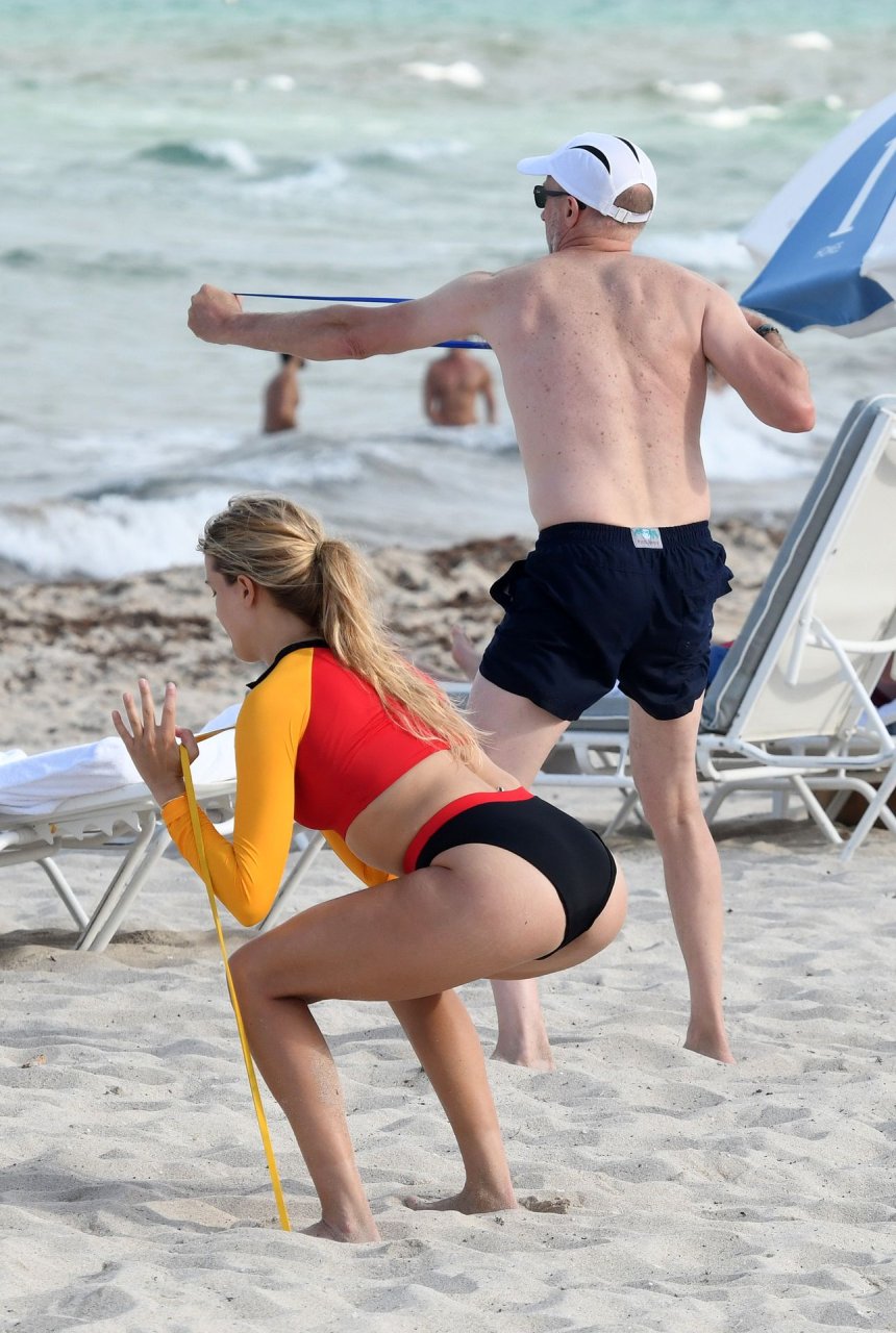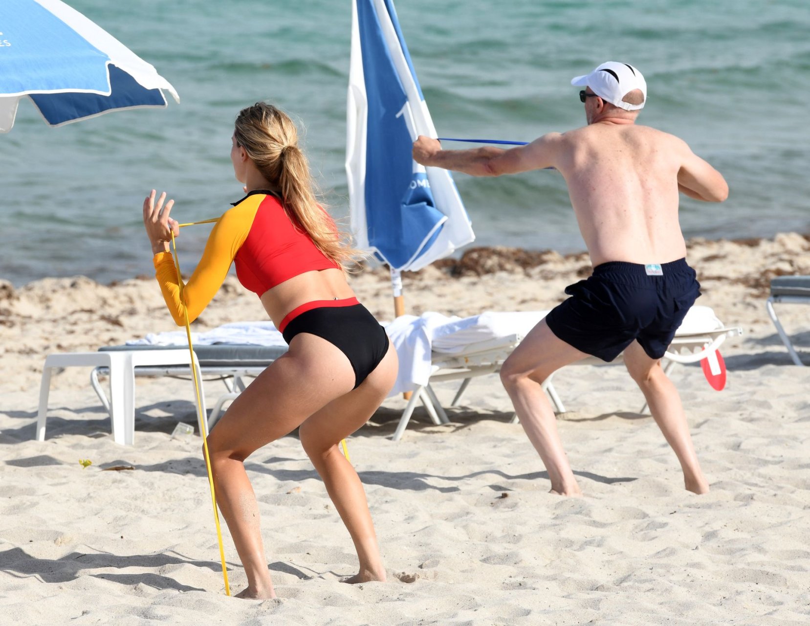 Eugenie Bouchard viene messa alla prova dal suo aitante personal trainer mentre fa un allenamento intenso sulla spiaggia con suo padre Mike – Miami, 18/05/2019. La tennista canadese indossava un top bikini a maniche lunghe di colore acceso e slip bikini abbinati, mostrando la sua incredibile figura mentre eseguiva un allenamento vario con bande di resistenza e una palla, con suo padre Mike che partecipava all’azione.