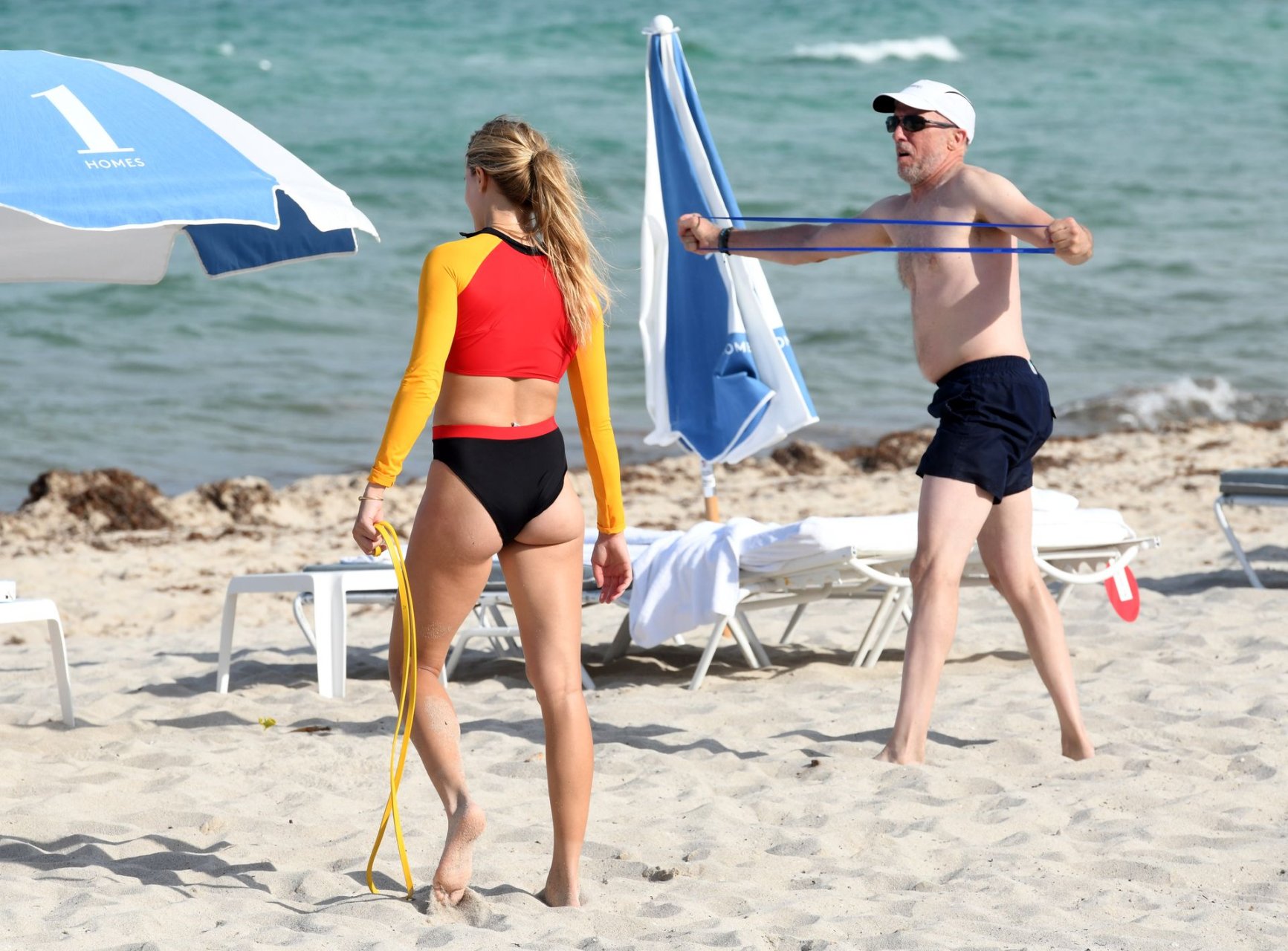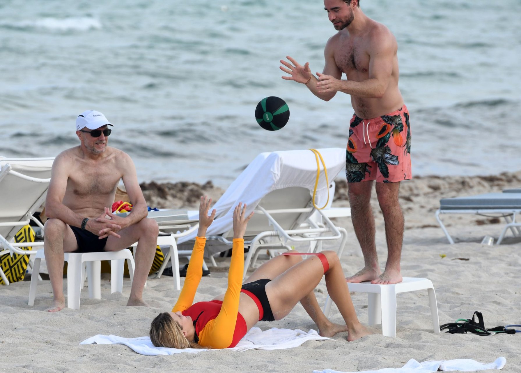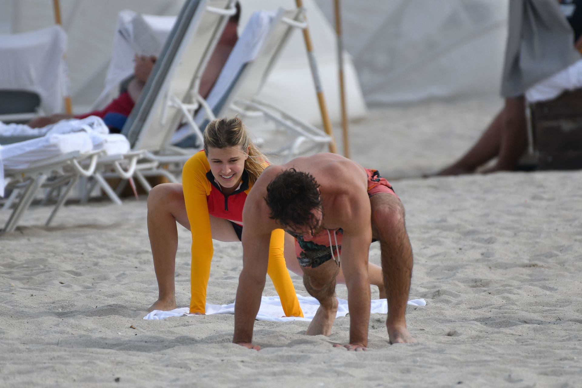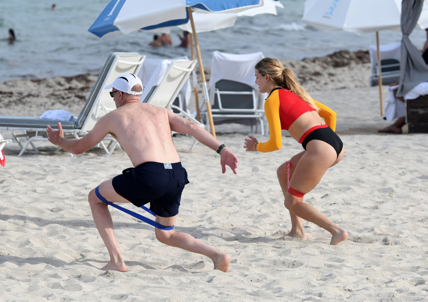 Eugenie Bouchard viene messa alla prova dal suo aitante personal trainer mentre fa un allenamento intenso sulla spiaggia con suo padre Mike – Miami, 18/05/2019. La tennista canadese indossava un top bikini a maniche lunghe di colore acceso e slip bikini abbinati, mostrando la sua incredibile figura mentre eseguiva un allenamento vario con bande di resistenza e una palla, con suo padre Mike che partecipava all’azione.