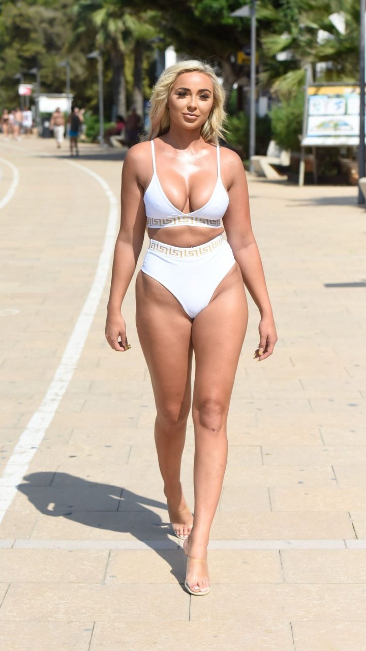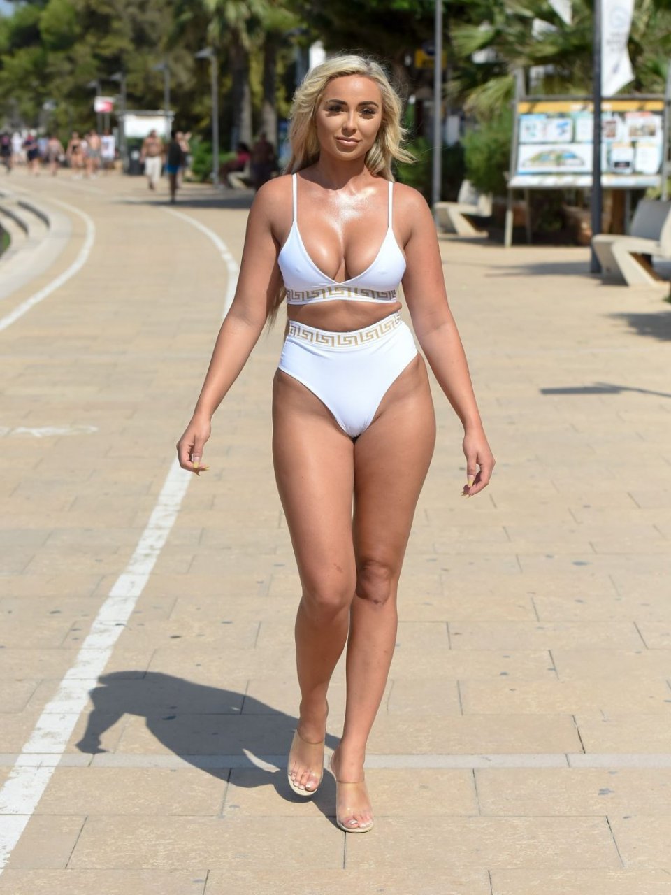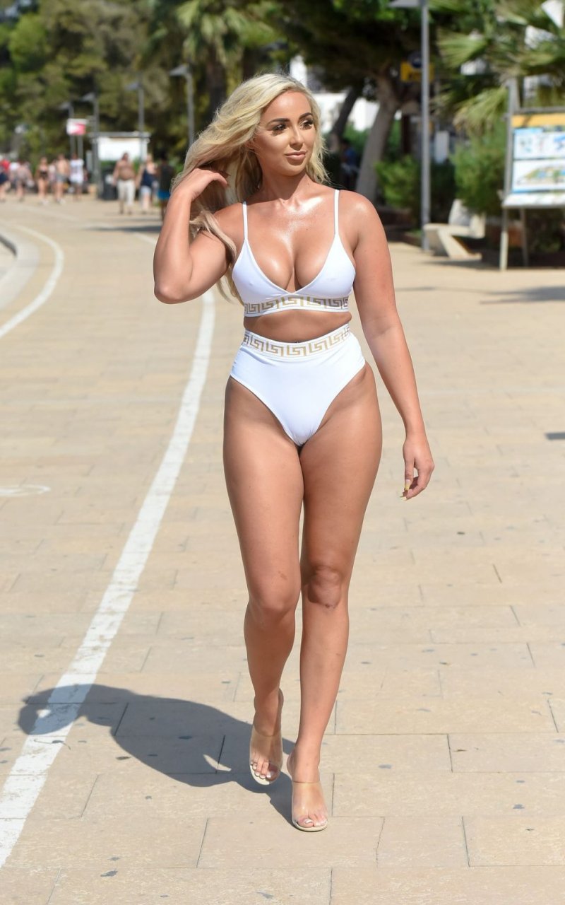 “Survival of the Fittest” star Georgia Cole esce dopo aver festeggiato con l’ex di Georgia Steel, Sam Bird. Ritratta qui nel giorno del suo 27° compleanno in un bikini bianco mentre arriva a O Beach Ibiza, 18/09/2019.