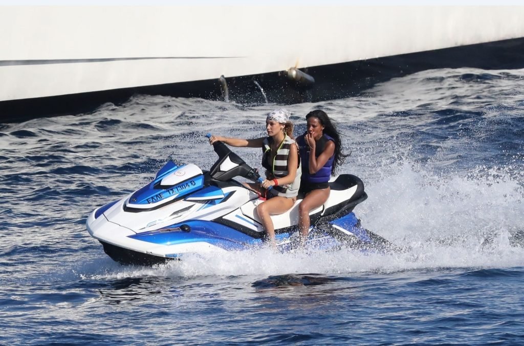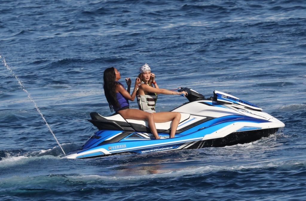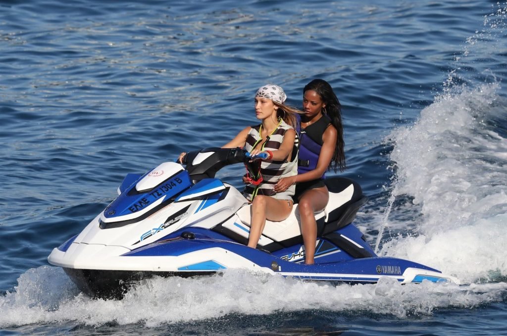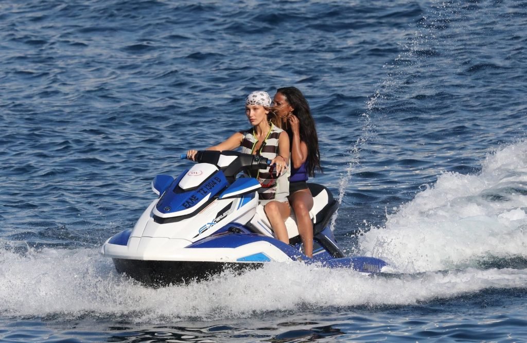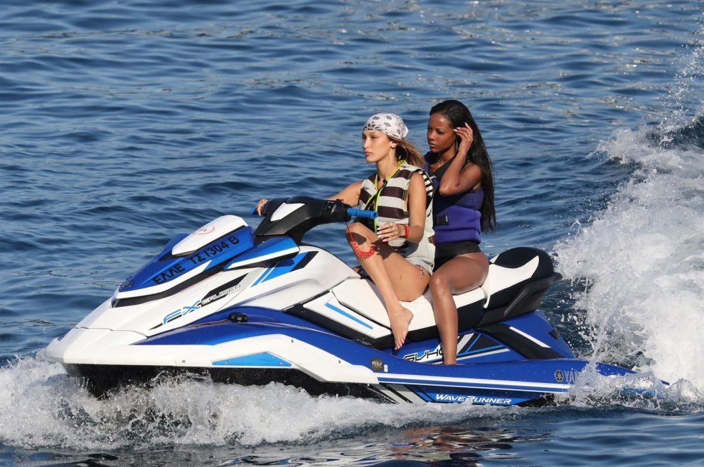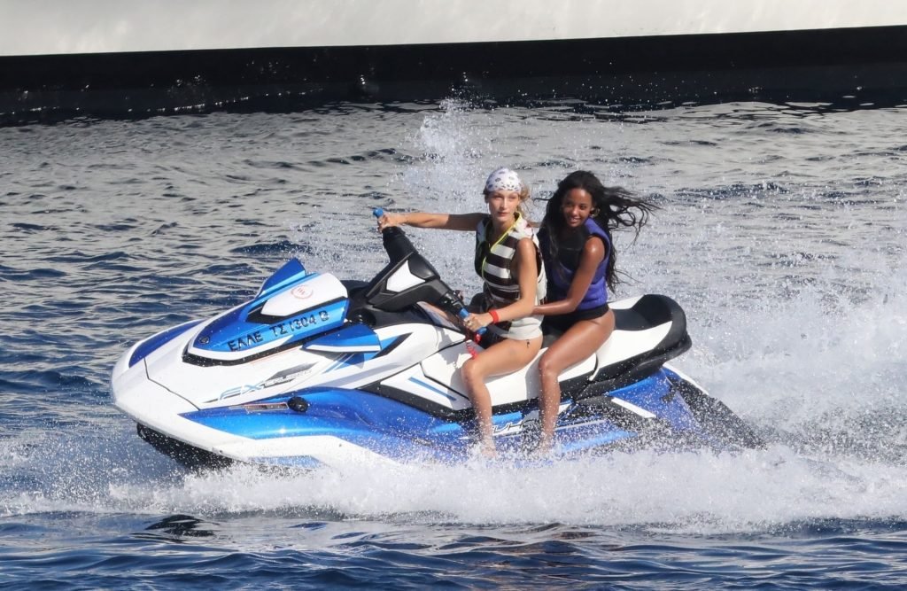 Gigi Hadid con sua sorella Bella Hadid trascorrono il loro tempo in spiaggia e si godono alcuni sport acquatici sull’isola di Mykonos, 30/07/2019. Erano accompagnate dalla loro altra sorella Alana Hadid, che era con il suo fidanzato, Elad Idan.