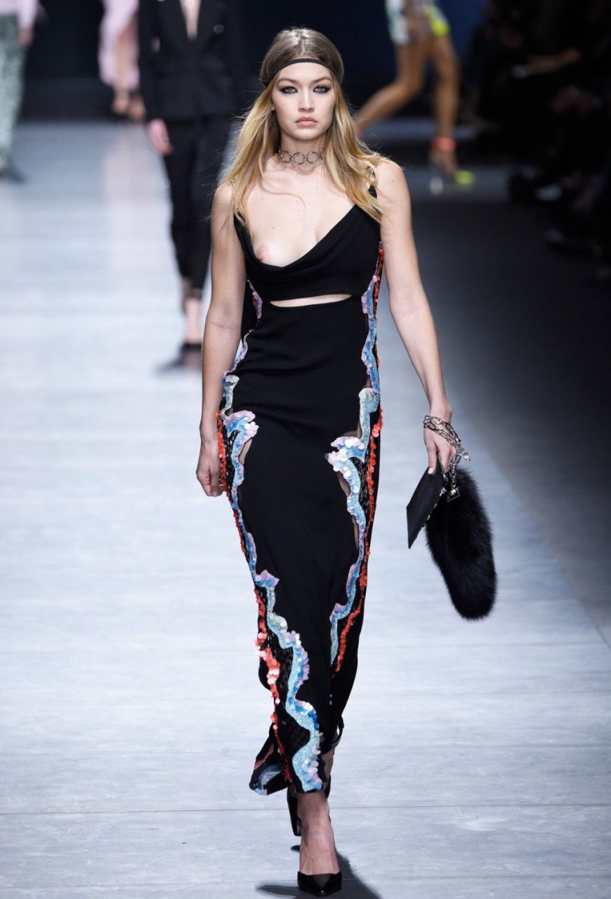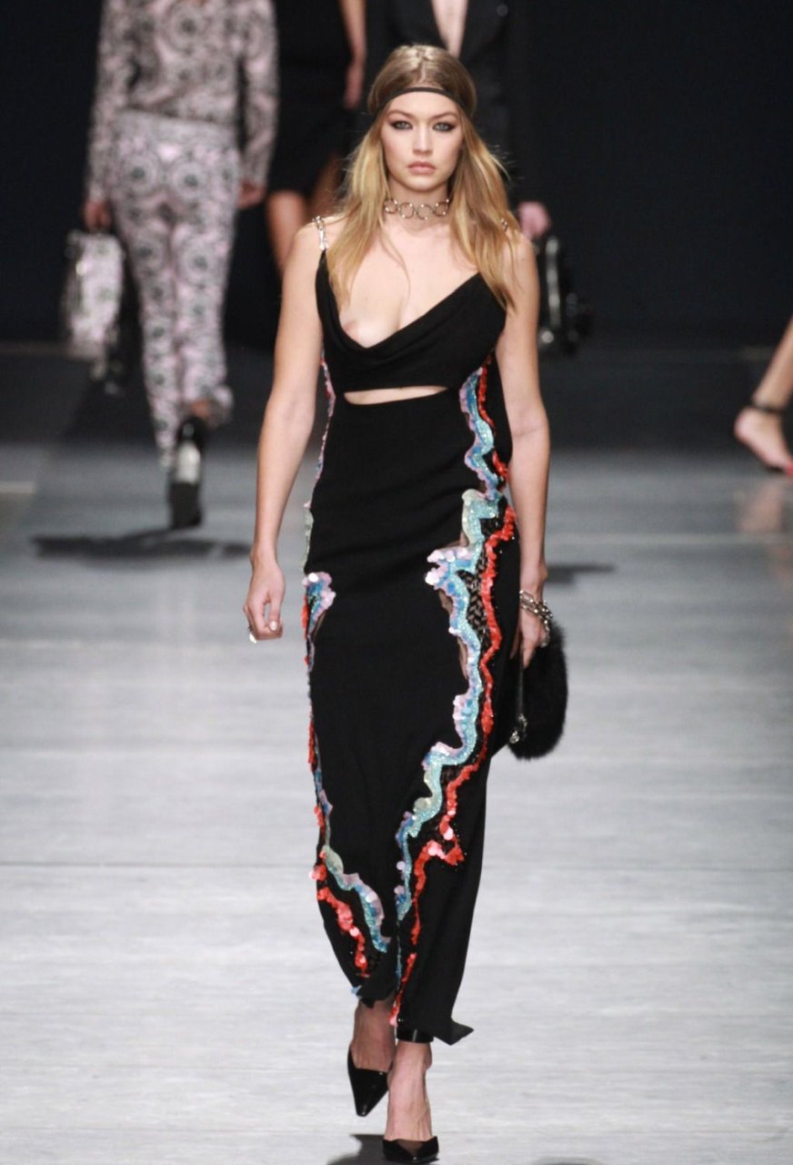 Gigi Hadid ha sfilato senza reggiseno alla sfilata di moda Versace a Milano, 26/02/2016. Faccia da poker… Gigi Hadid è una modella americana e personaggio televisivo. Età: 20 (23 aprile 1995).