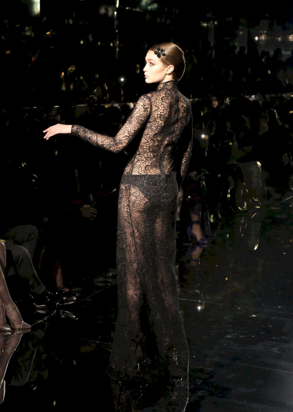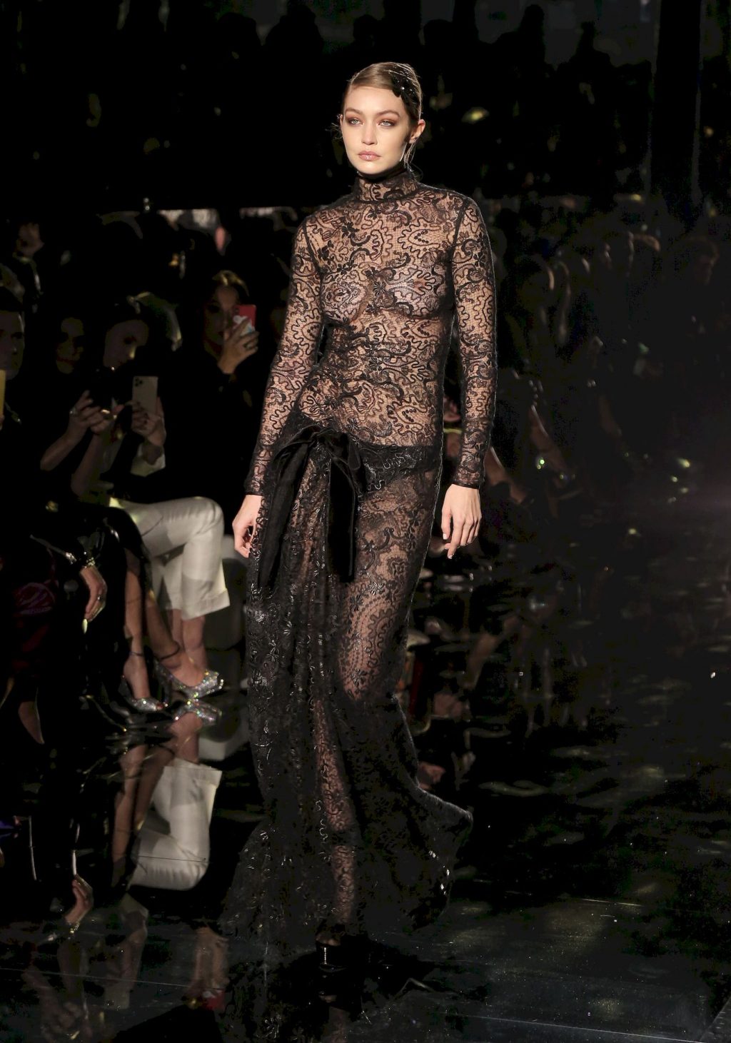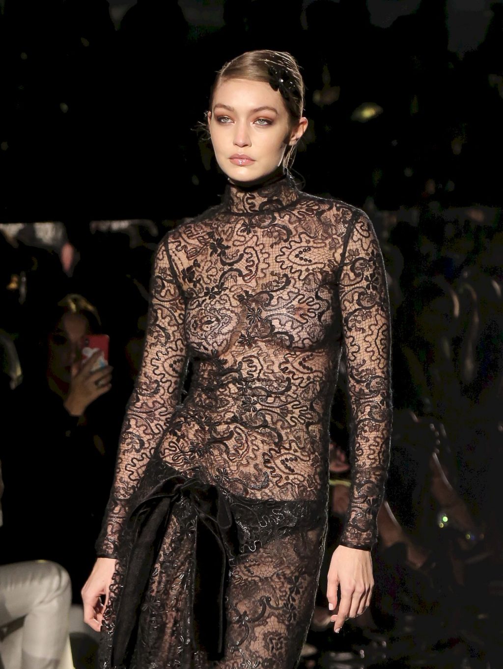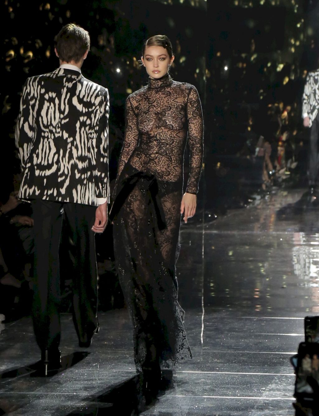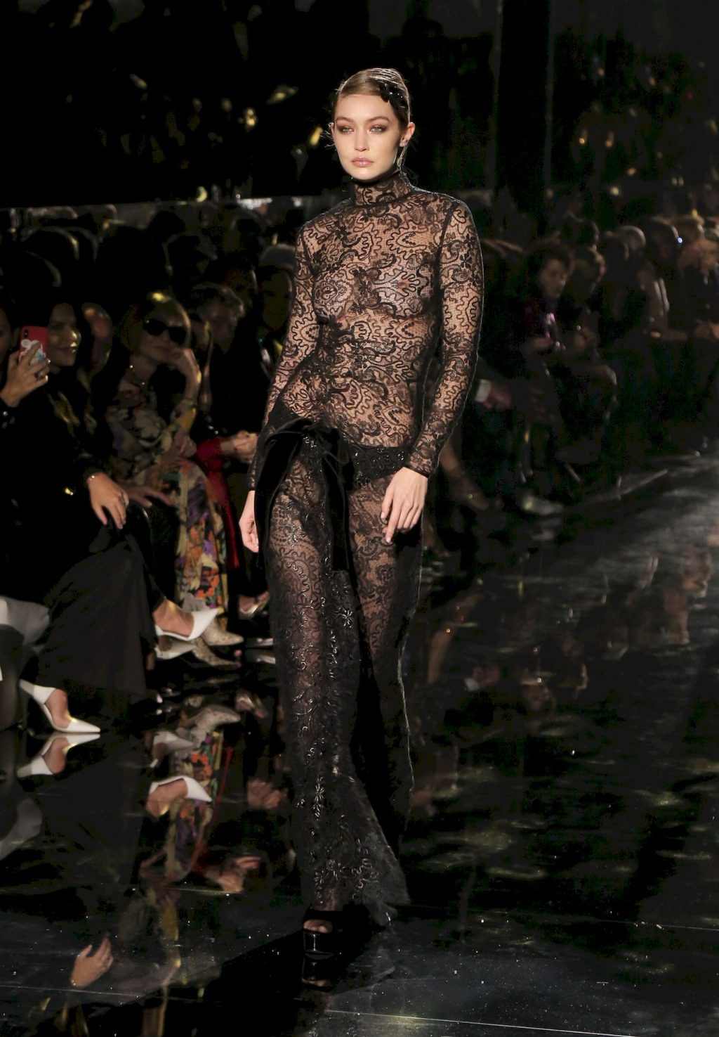Gigi Hadid sfila durante lo spettacolo Tom Ford AW20 presso Milk Studios il 7 febbraio 2020 a Hollywood. La sorella di Bella ha anche mostrato i suoi seni, indossando un vestito trasparente.