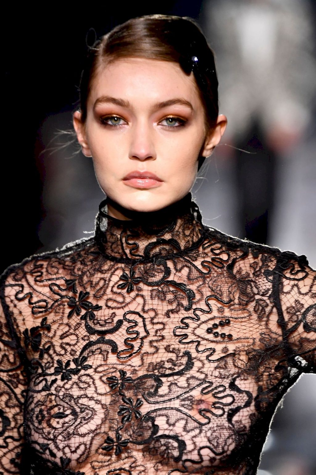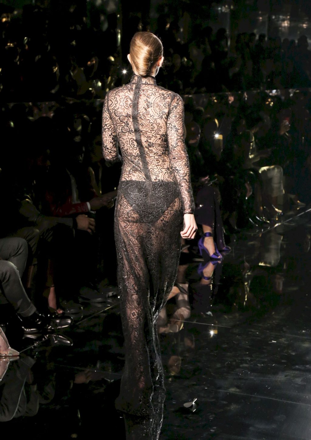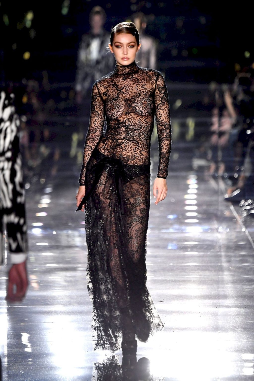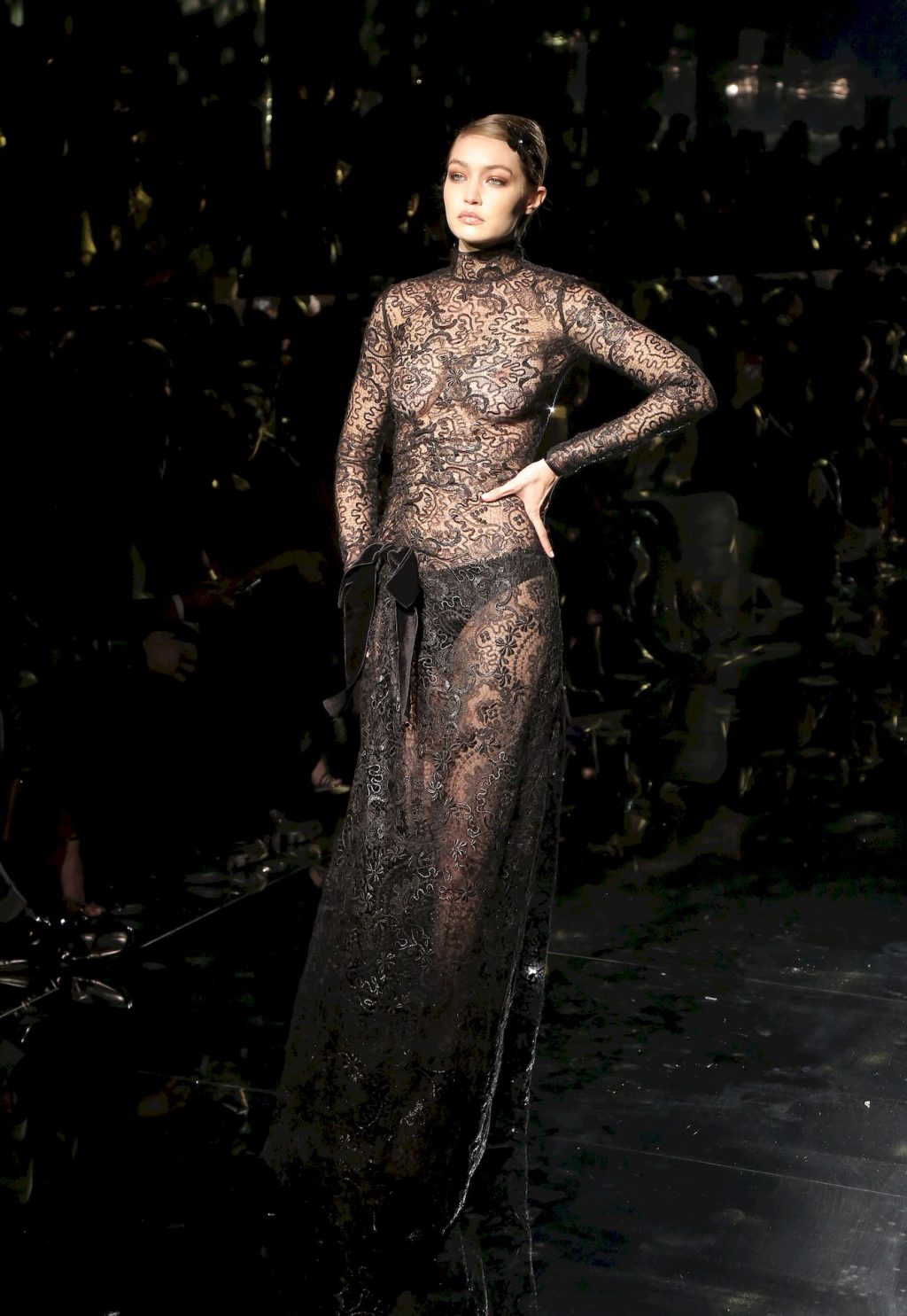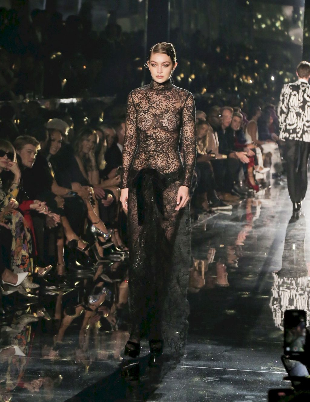 Gigi Hadid sfila durante lo spettacolo Tom Ford AW20 presso Milk Studios il 7 febbraio 2020 a Hollywood. La sorella di Bella ha anche mostrato i suoi seni, indossando un vestito trasparente.