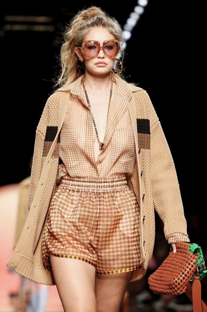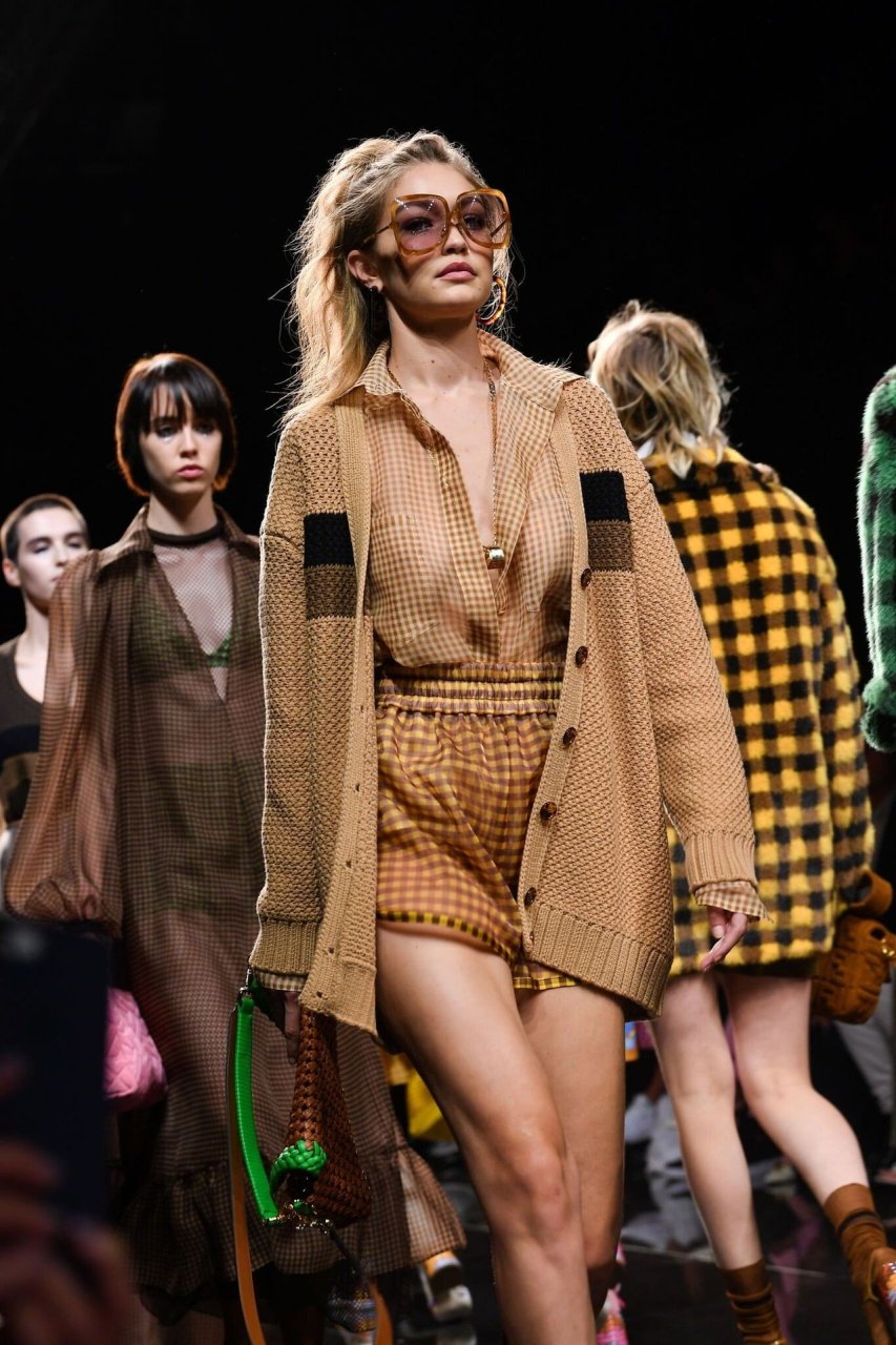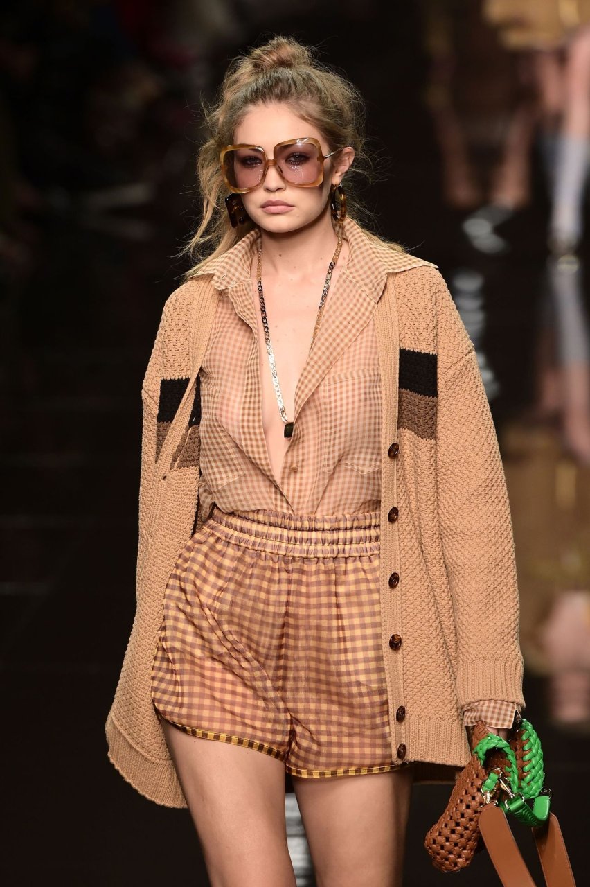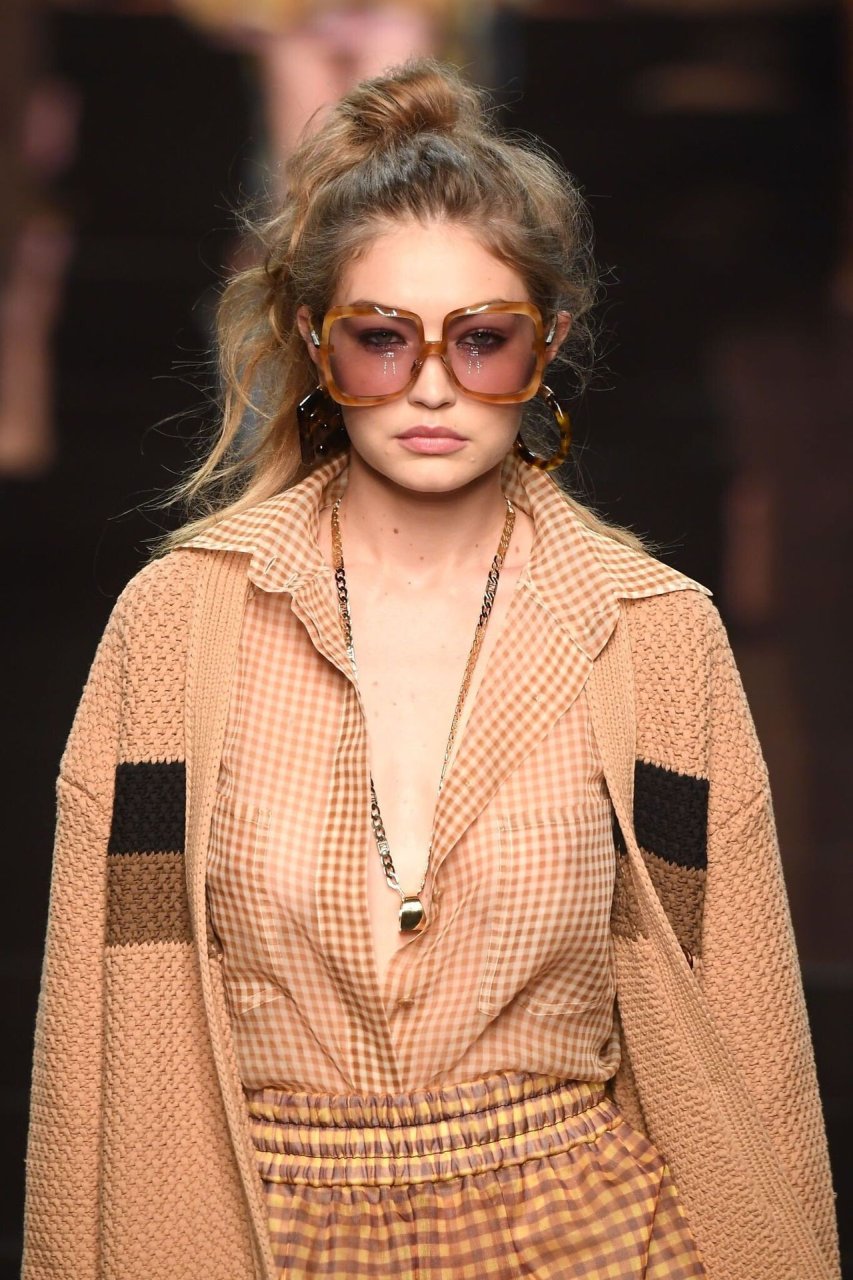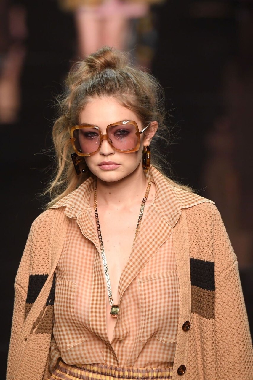 Model Gigi Hadid ha mostrato il suo décolleté, indossando una camicia trasparente alla sfilata Fendi durante la Milano Fashion Week Primavera/Estate 2020, 19/09/2019.