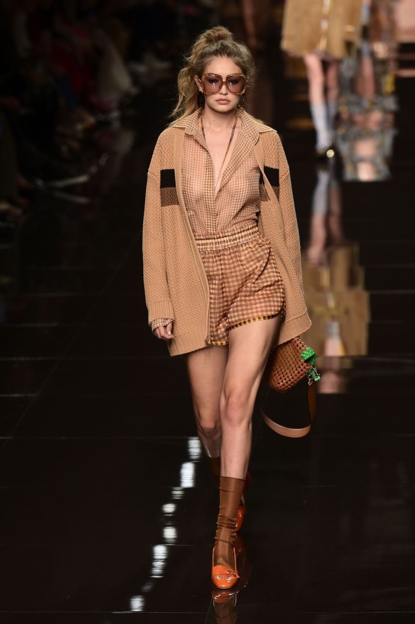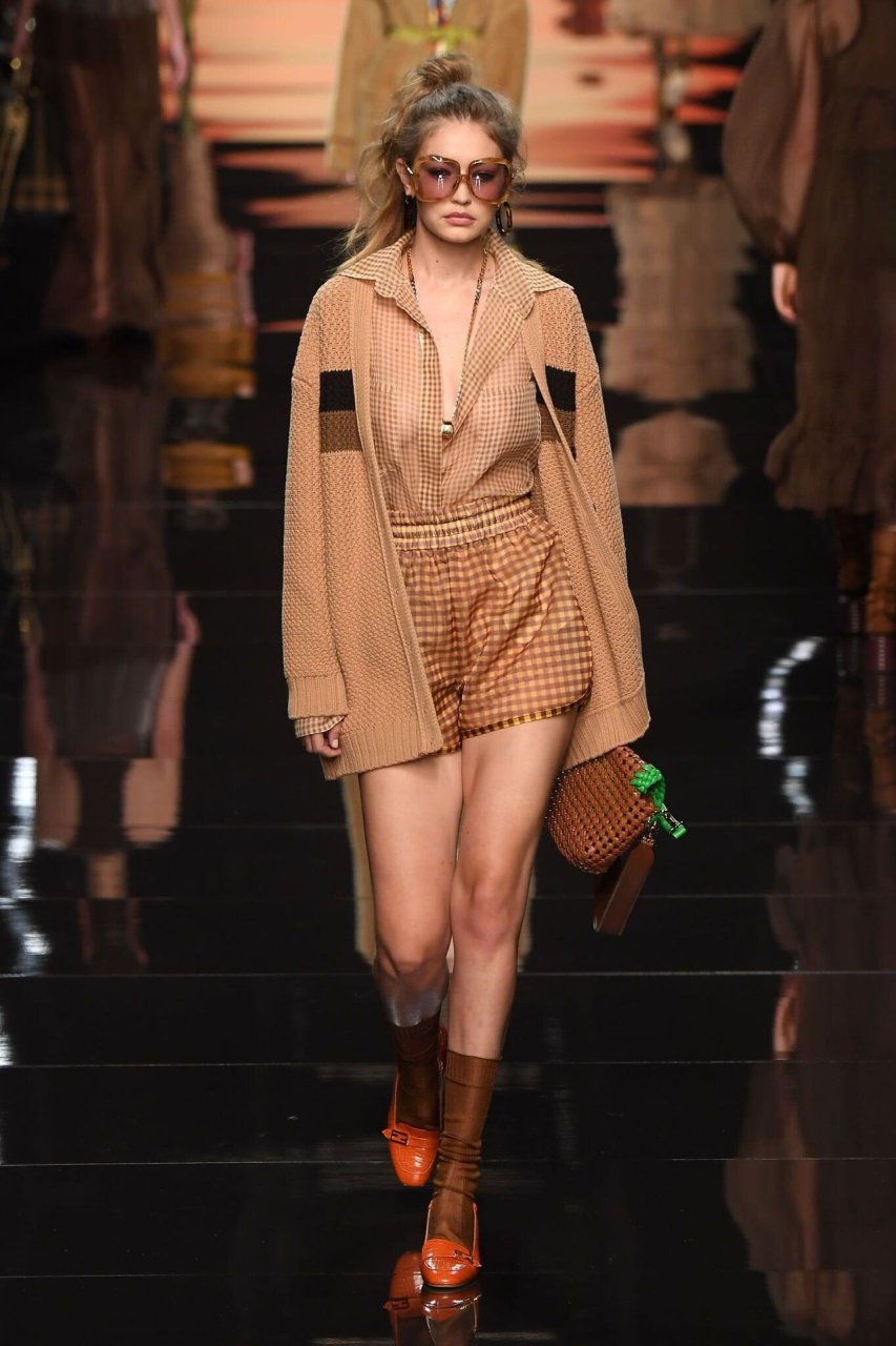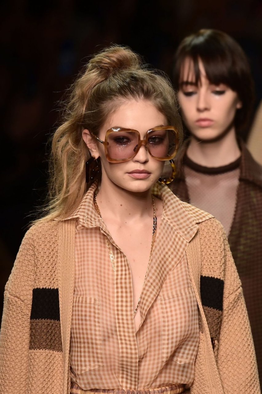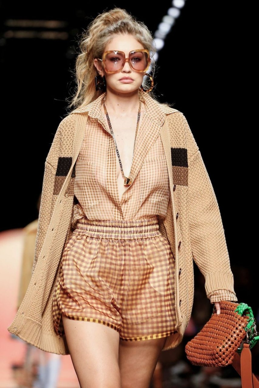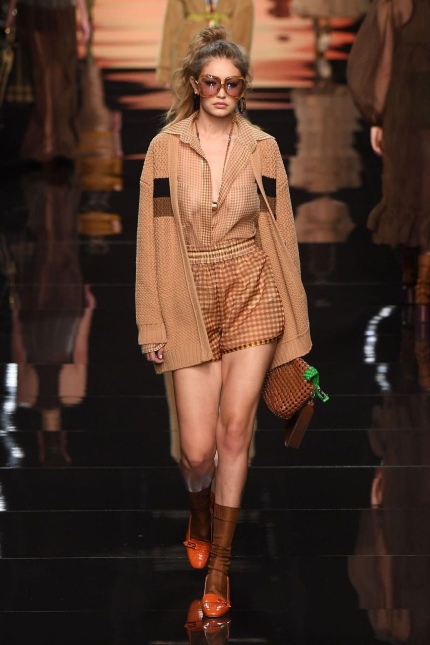 Model Gigi Hadid ha mostrato il suo décolleté, indossando una camicia trasparente alla sfilata Fendi durante la Milano Fashion Week Primavera/Estate 2020, 19/09/2019.