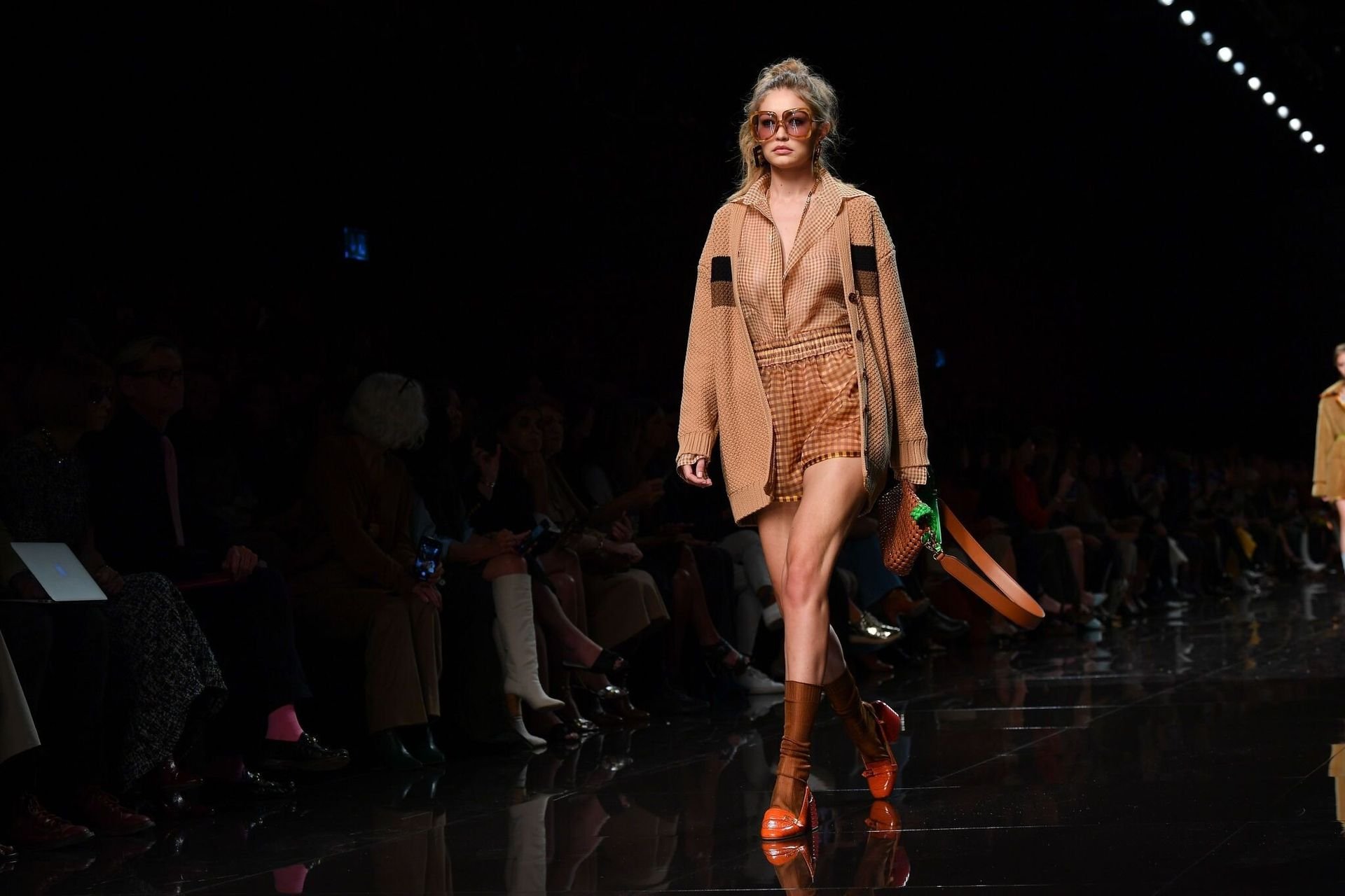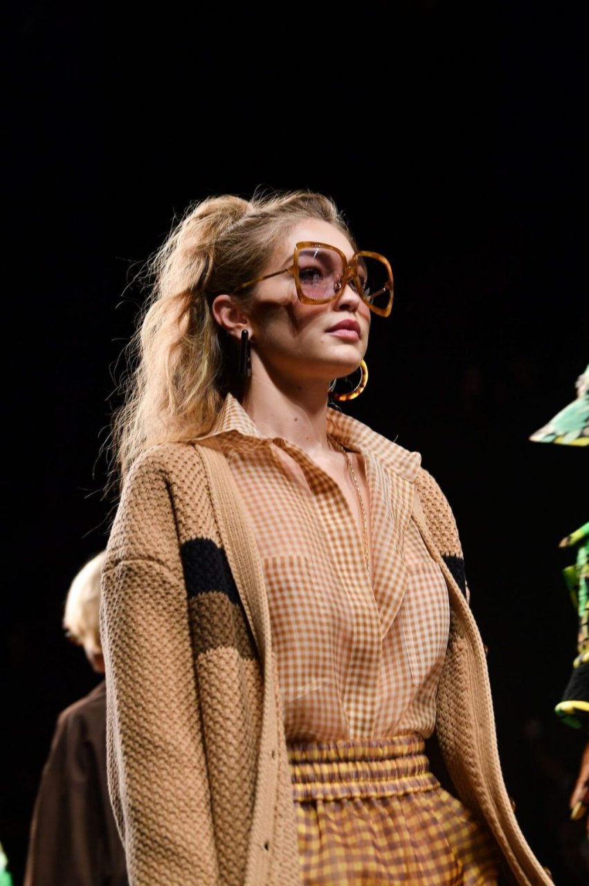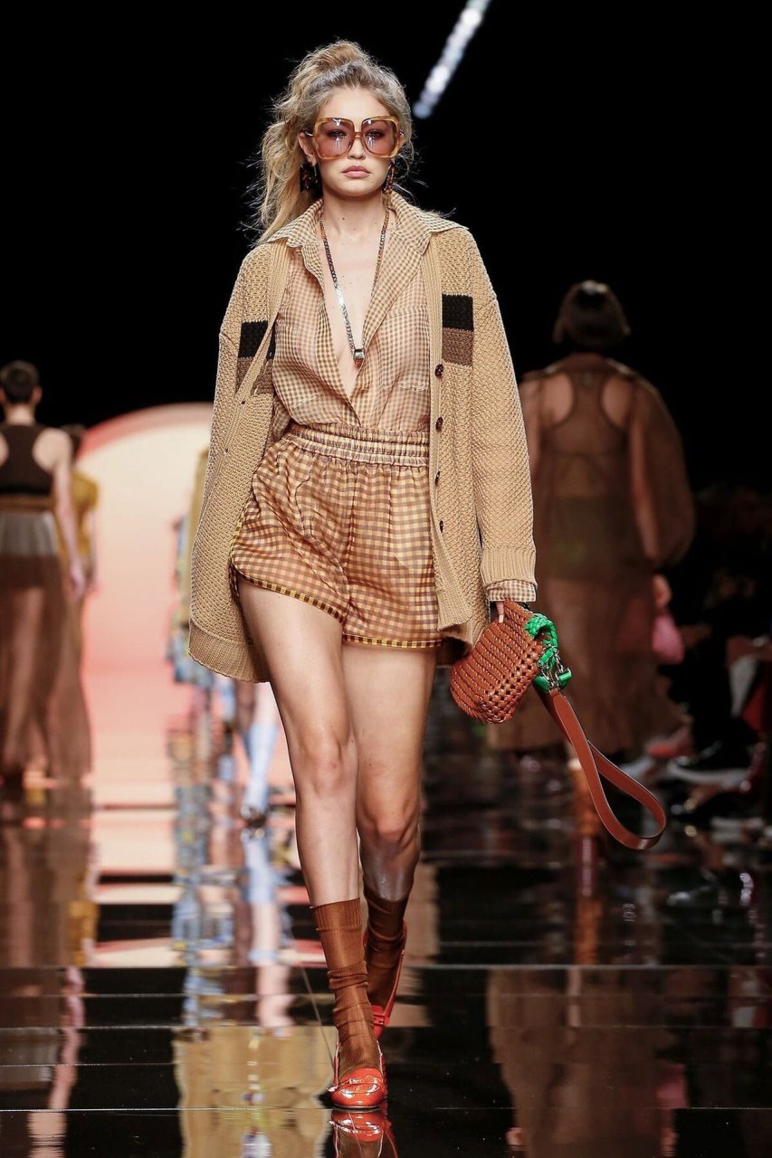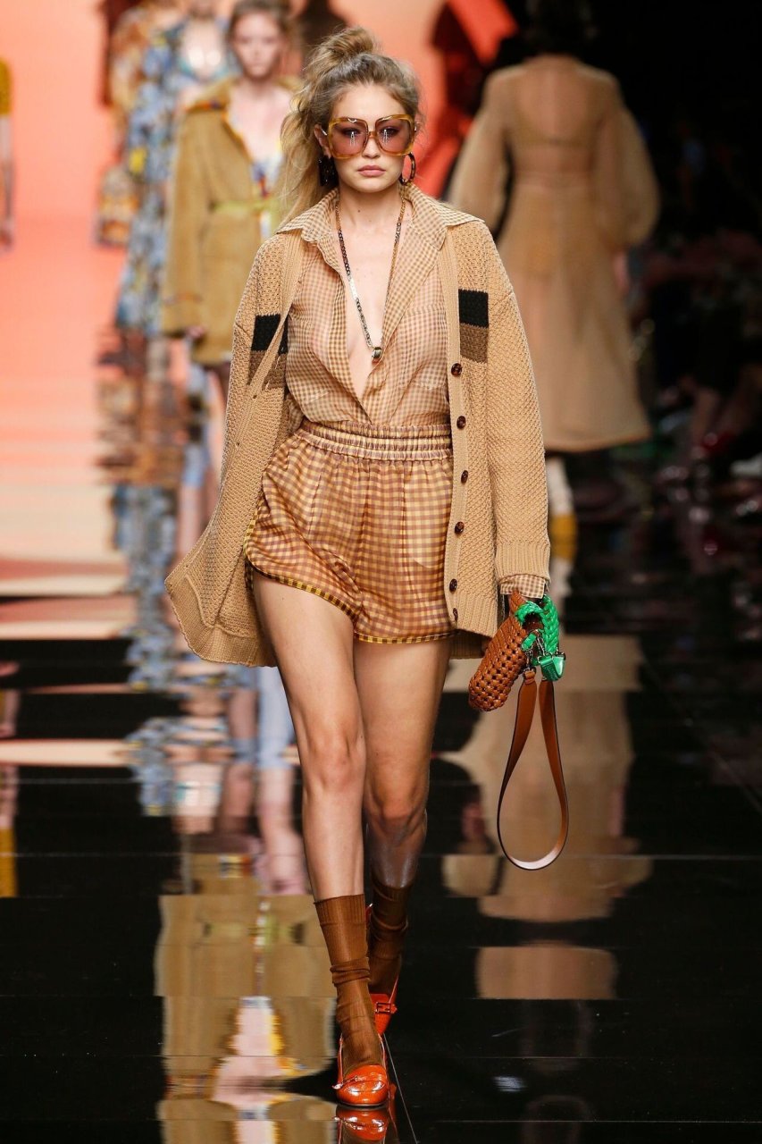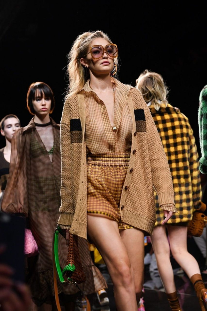 Model Gigi Hadid ha mostrato il suo décolleté, indossando una camicia trasparente alla sfilata Fendi durante la Milano Fashion Week Primavera/Estate 2020, 19/09/2019.