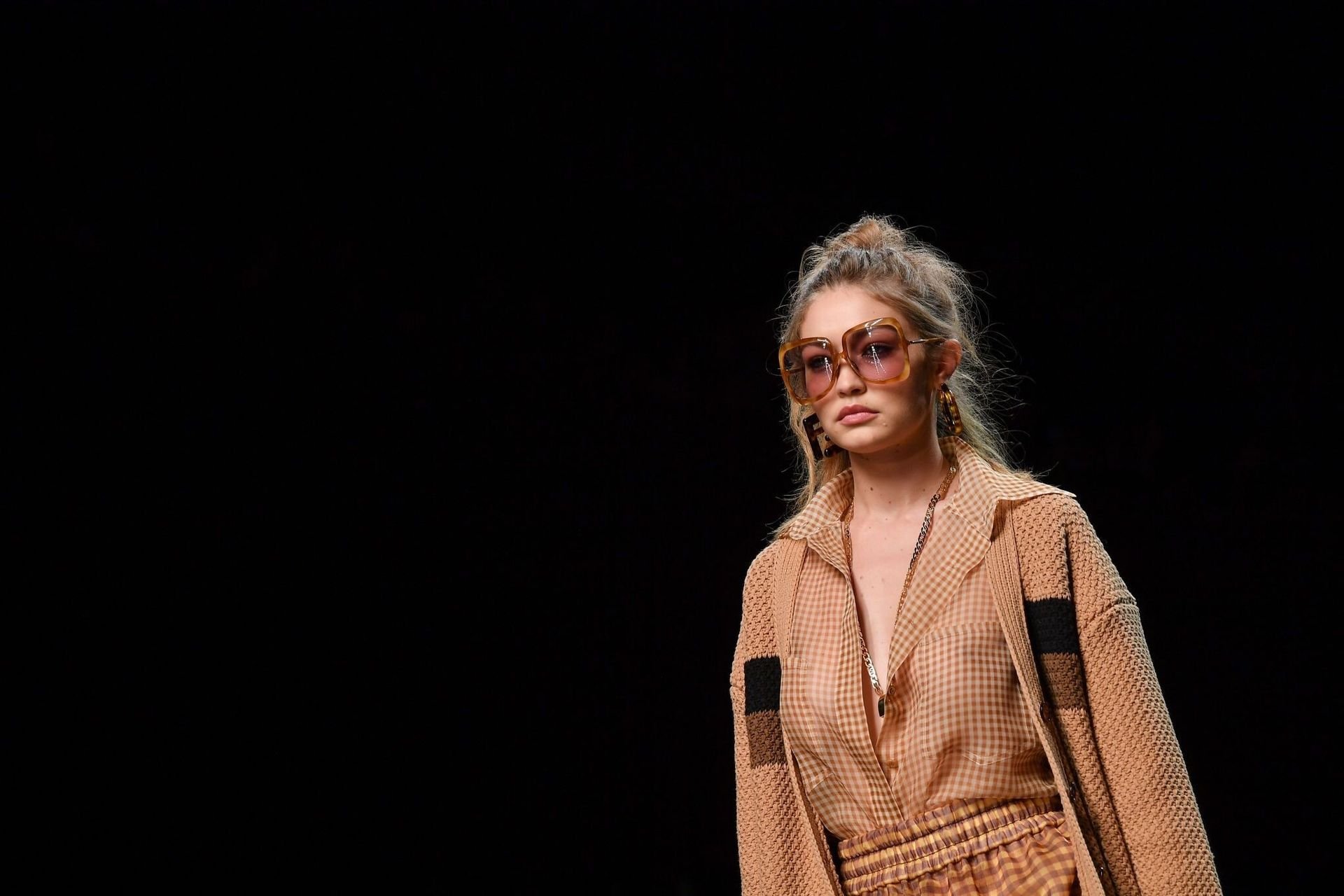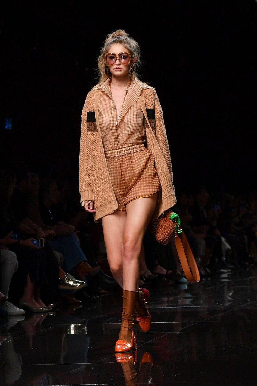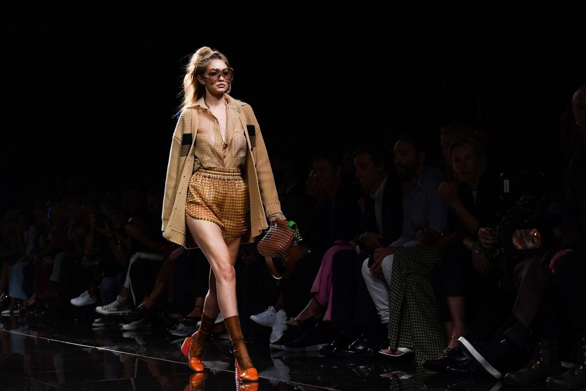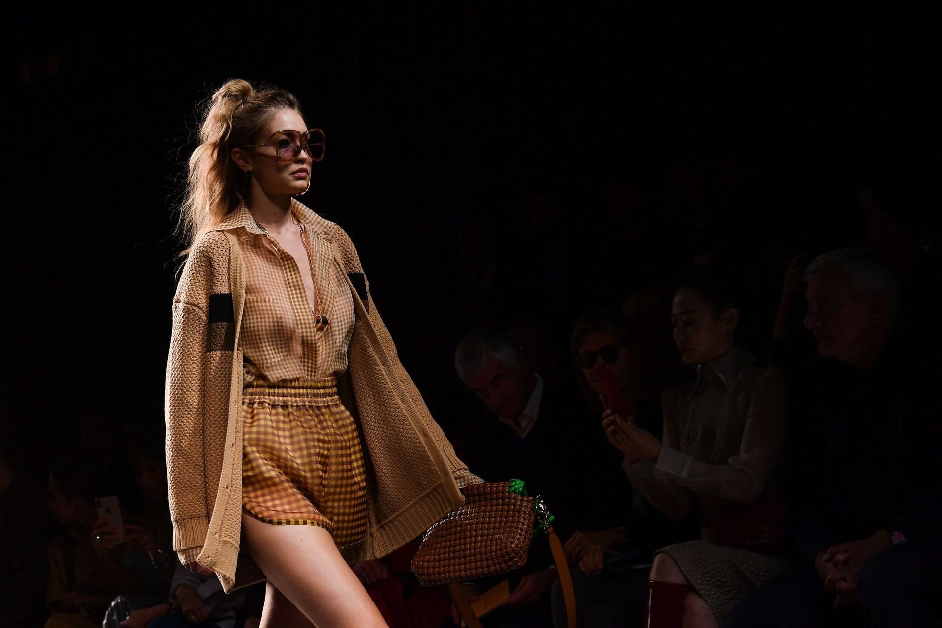 Model Gigi Hadid ha mostrato il suo décolleté, indossando una camicia trasparente alla sfilata Fendi durante la Milano Fashion Week Primavera/Estate 2020, 19/09/2019.
