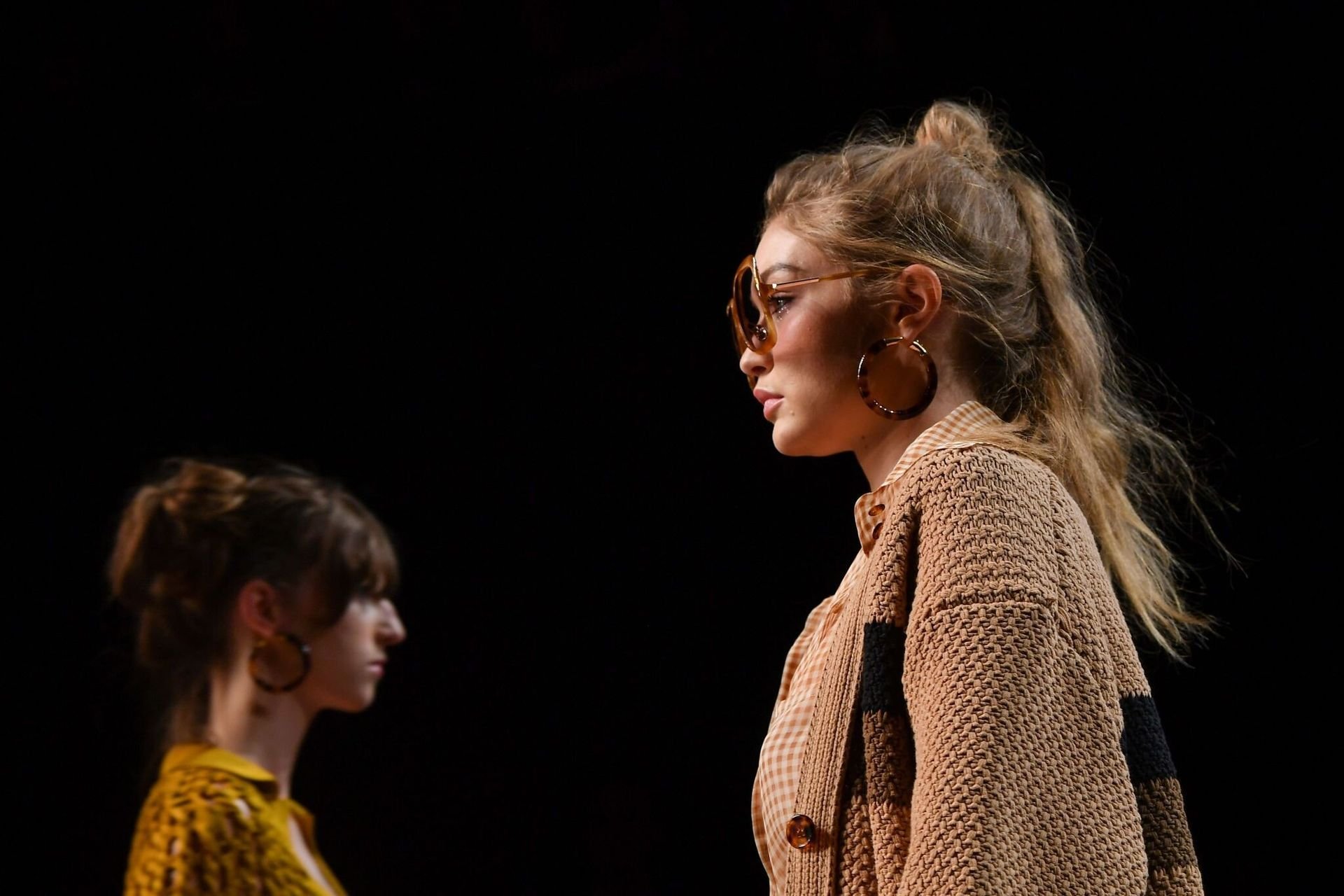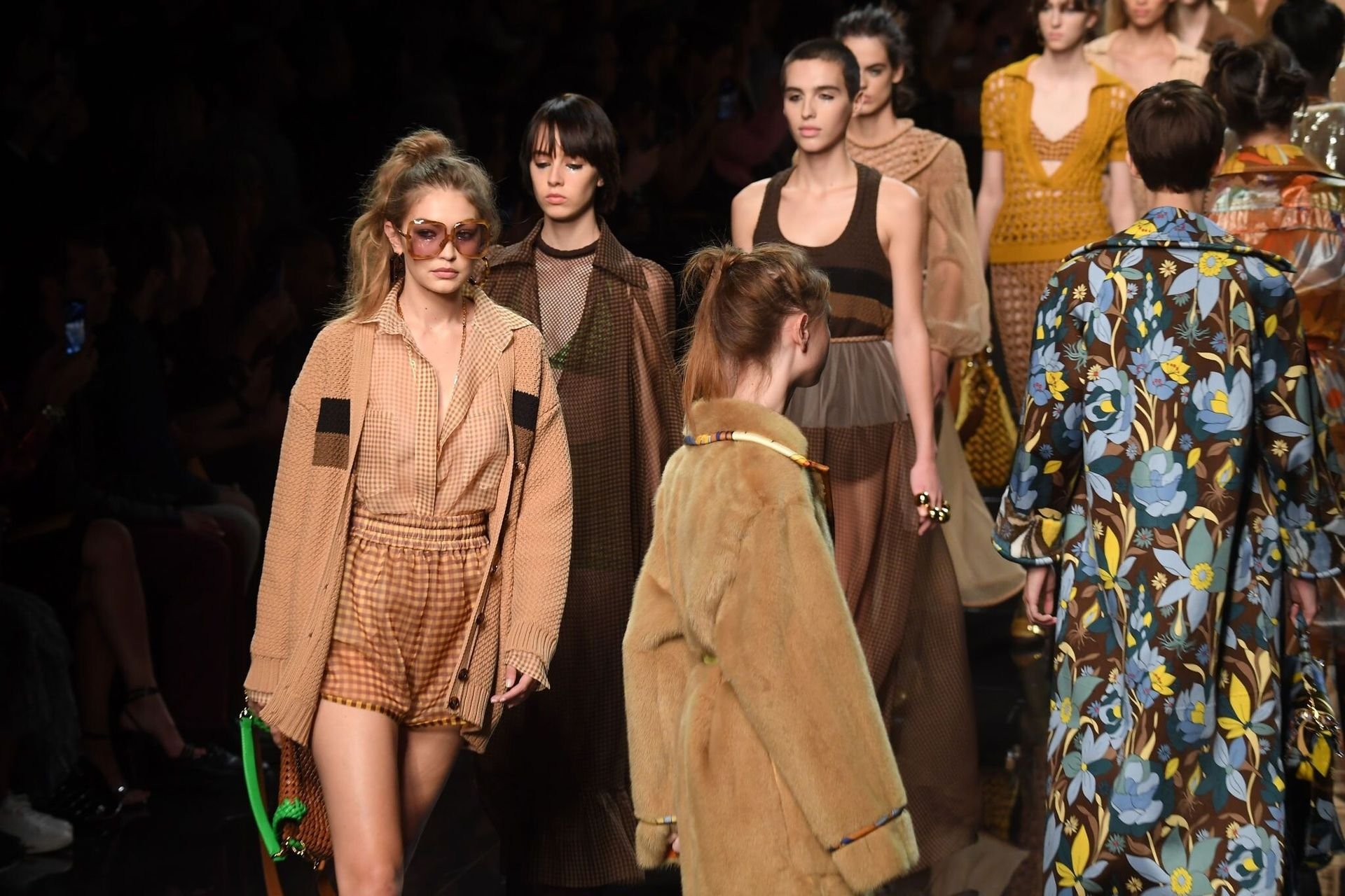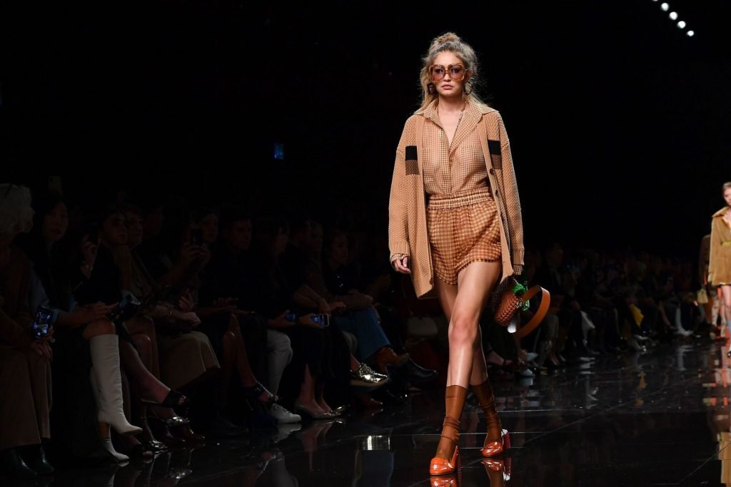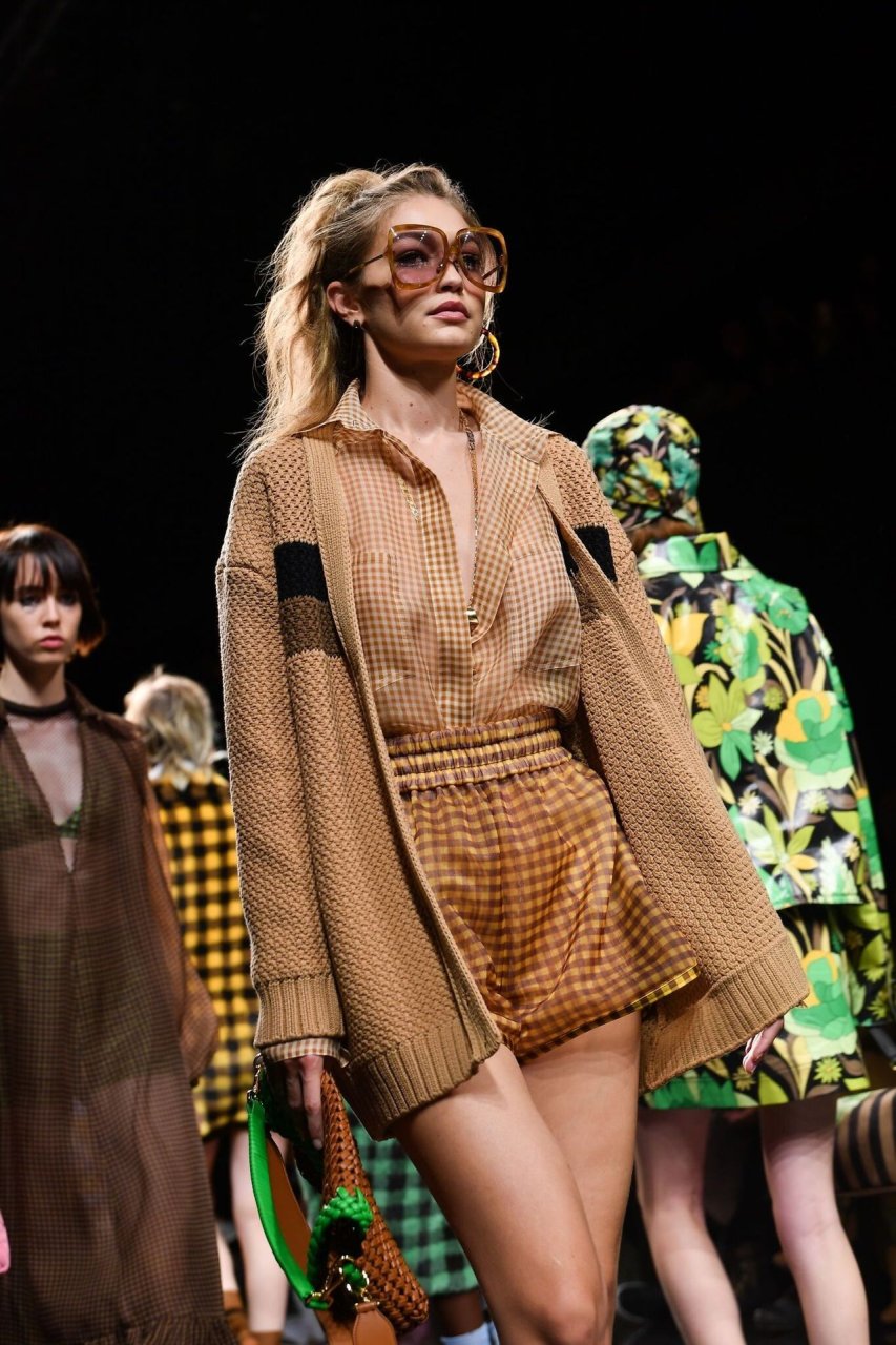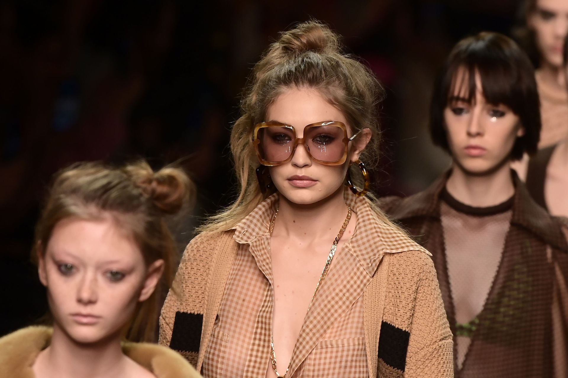 Model Gigi Hadid ha mostrato il suo décolleté, indossando una camicia trasparente alla sfilata Fendi durante la Milano Fashion Week Primavera/Estate 2020, 19/09/2019.