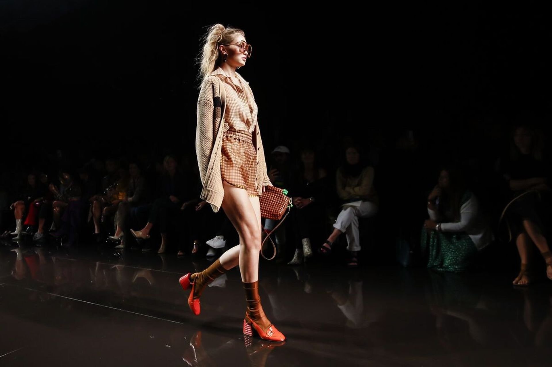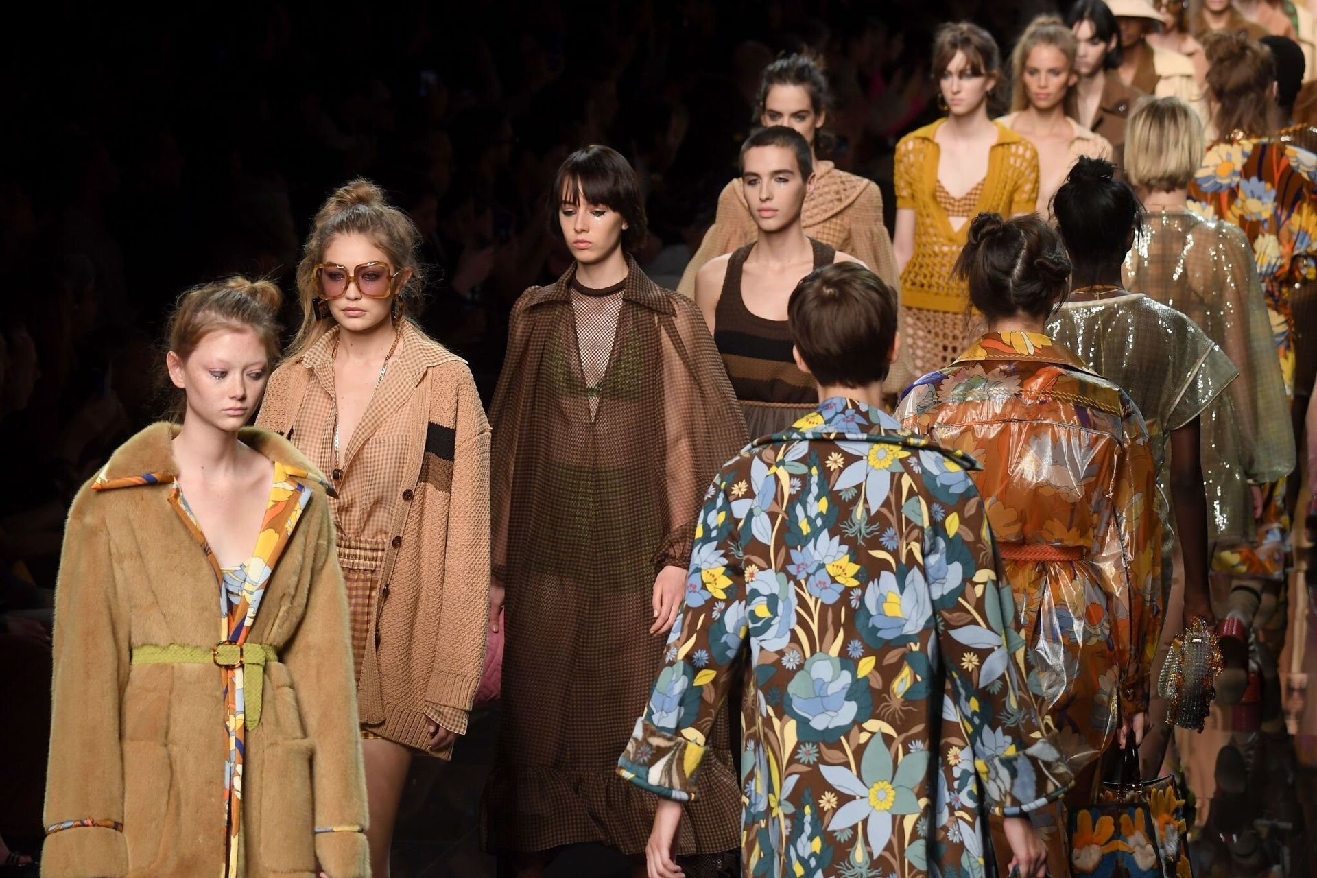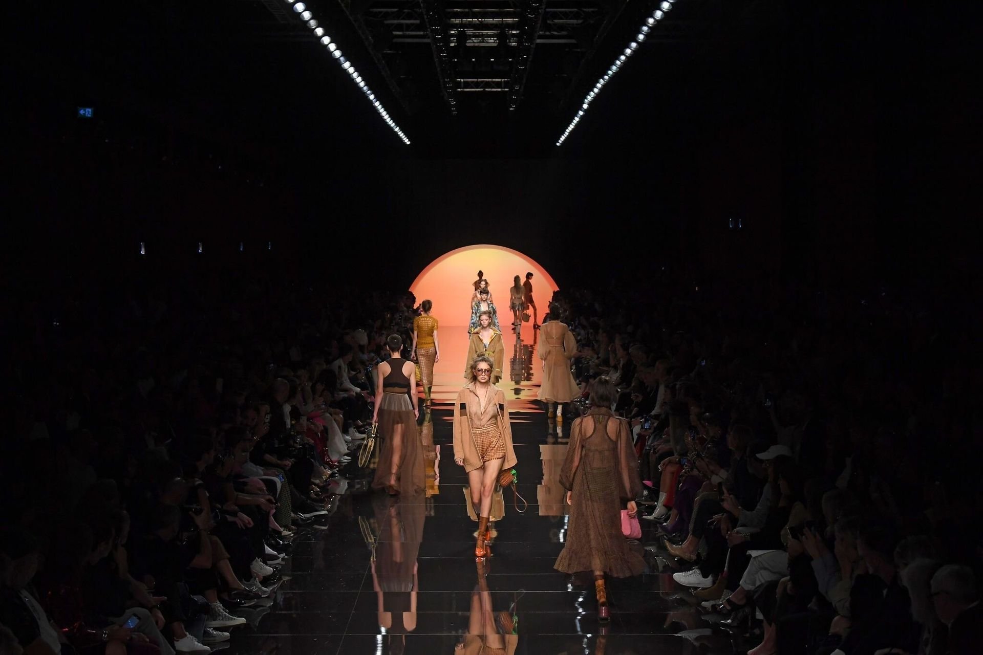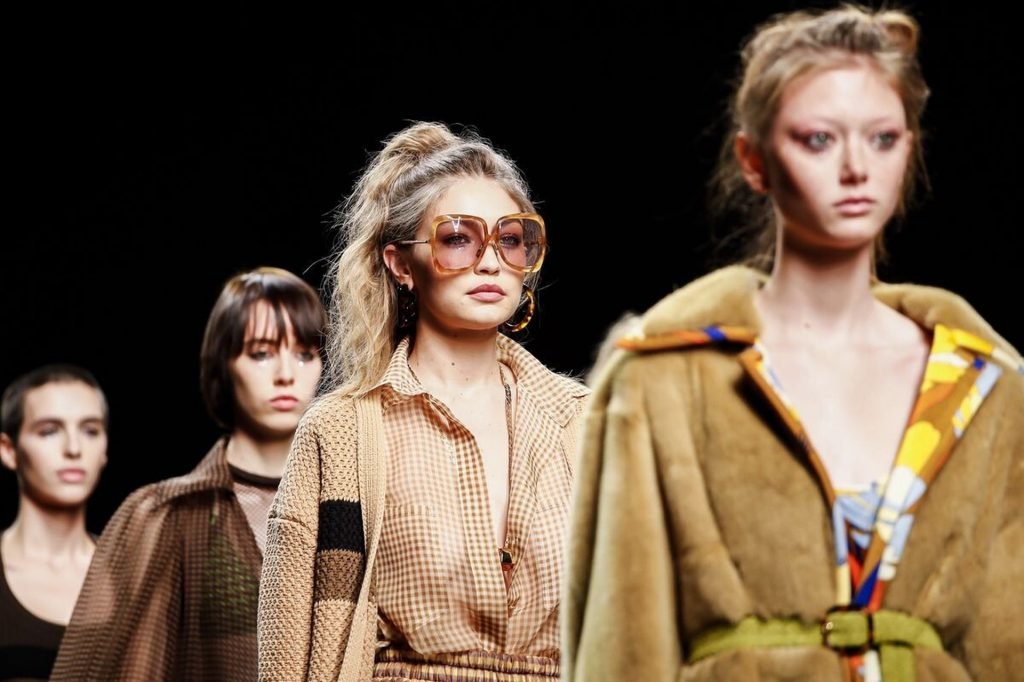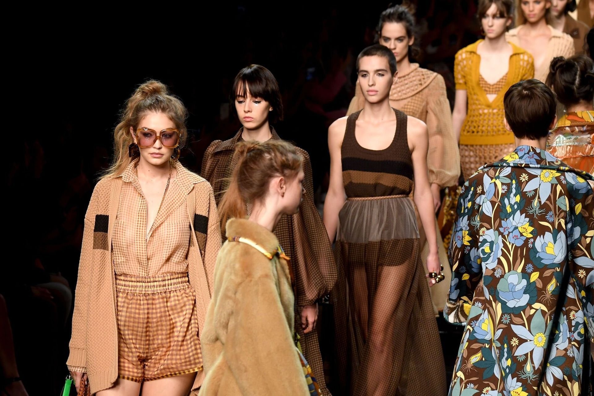 Model Gigi Hadid ha mostrato il suo décolleté, indossando una camicia trasparente alla sfilata Fendi durante la Milano Fashion Week Primavera/Estate 2020, 19/09/2019.