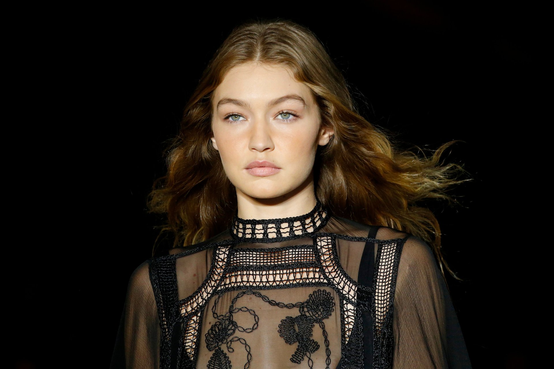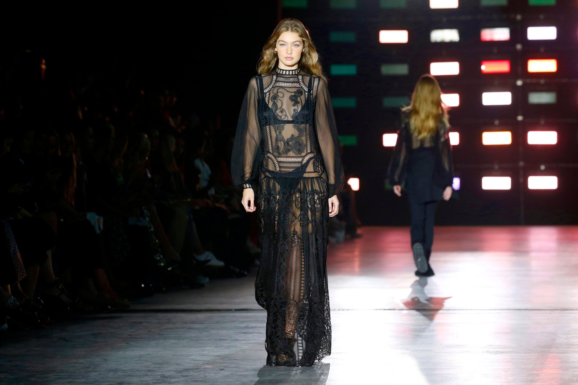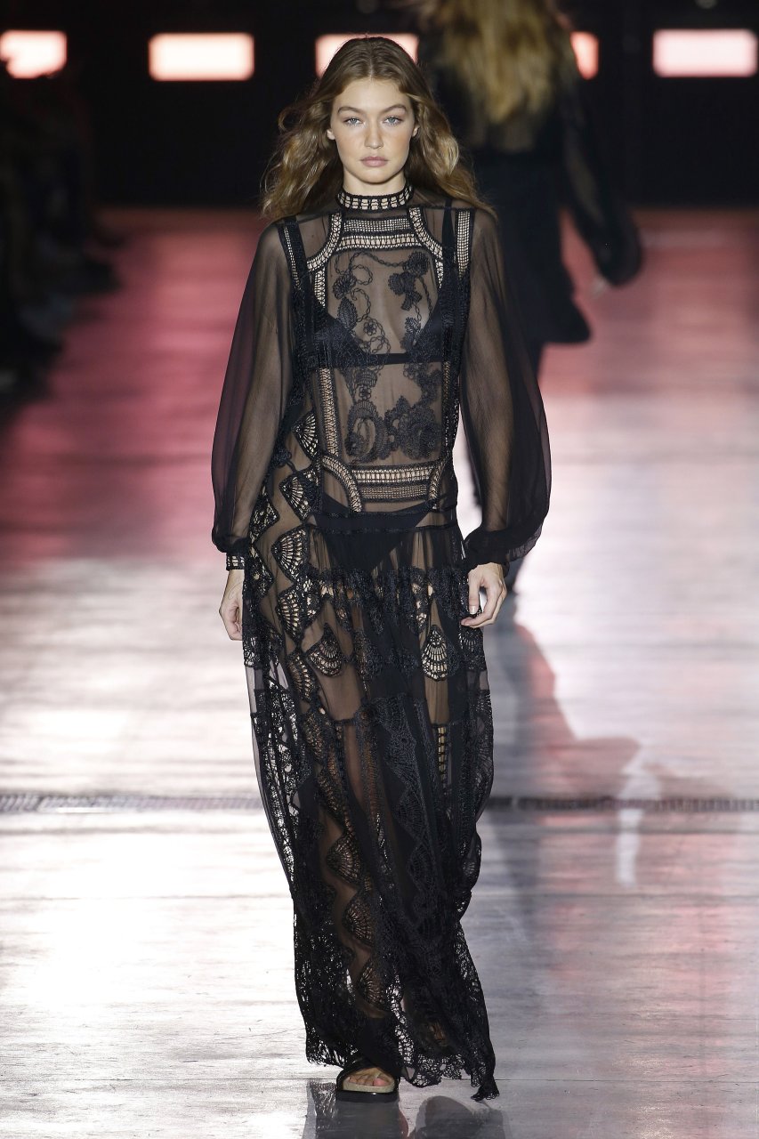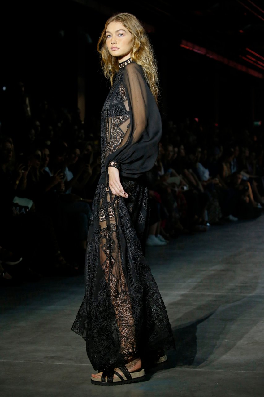 Gigi Hadid sfila alla sfilata di moda Alberta Ferretti a Milano, 19/09/2018. La modella di 23 anni Gigi Hadid è apparsa in un abito nero in chiffon trasparente.