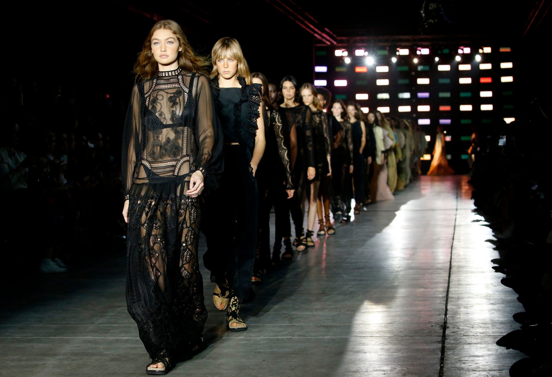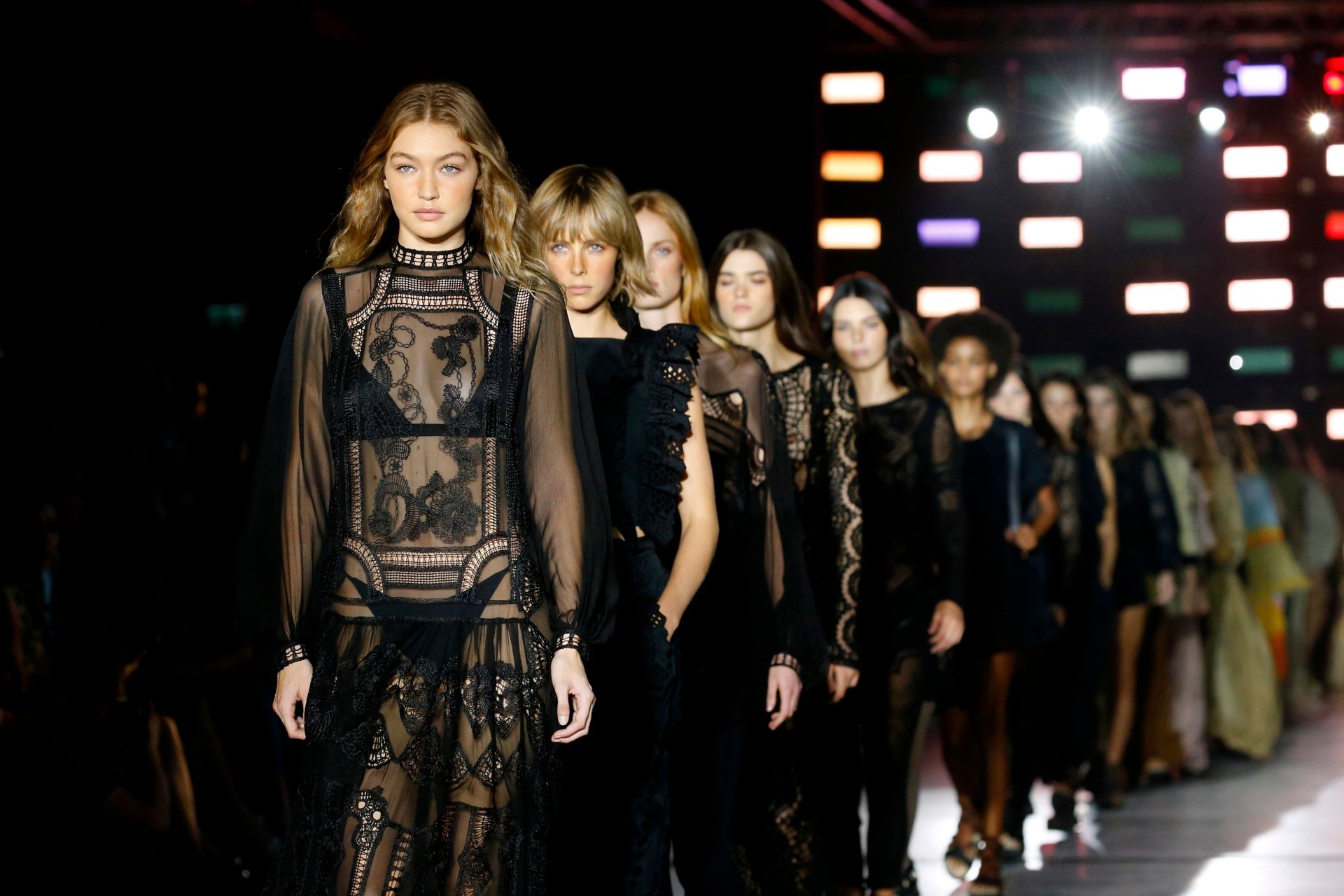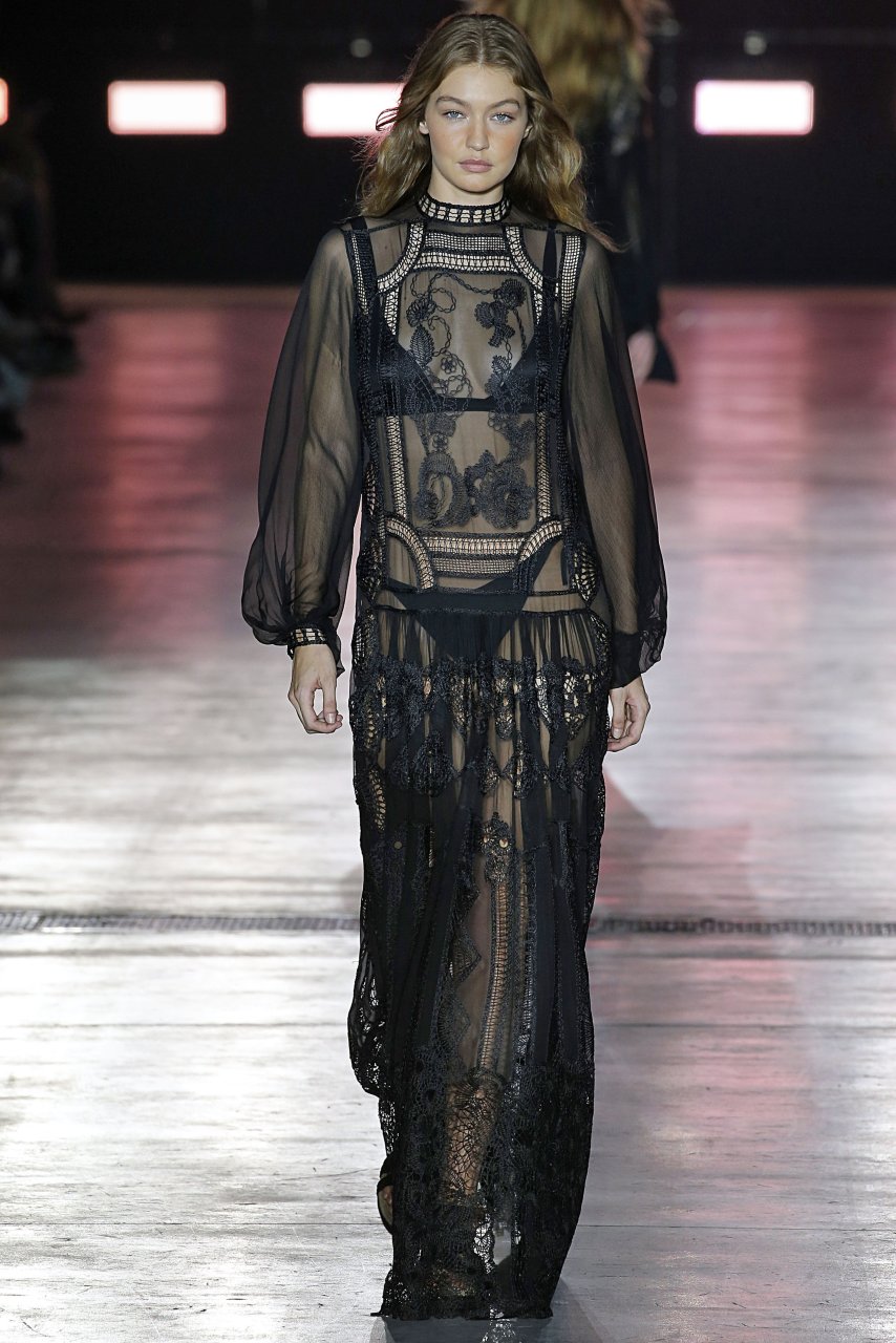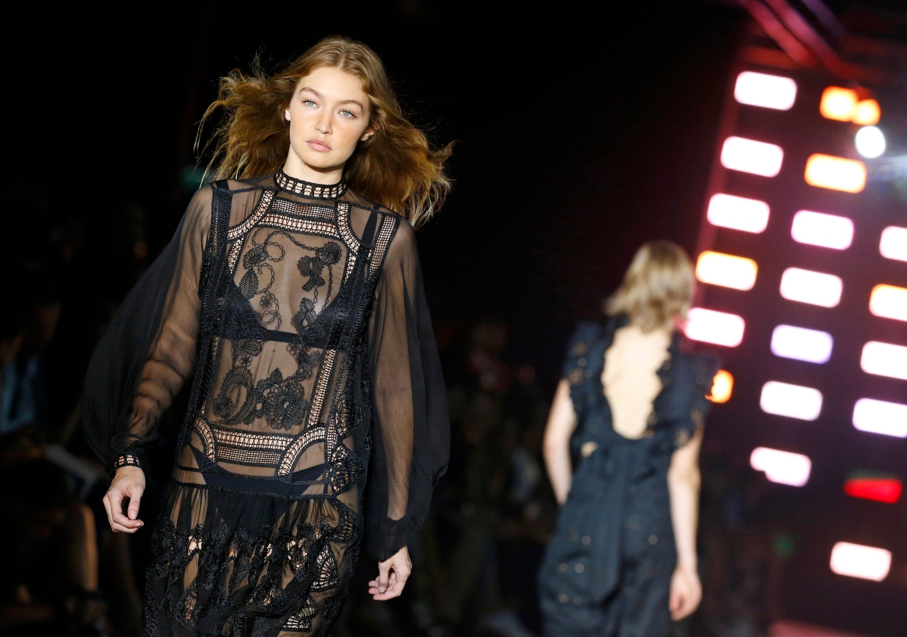 Gigi Hadid sfila alla sfilata di moda Alberta Ferretti a Milano, 19/09/2018. La modella di 23 anni Gigi Hadid è apparsa in un abito nero in chiffon trasparente.