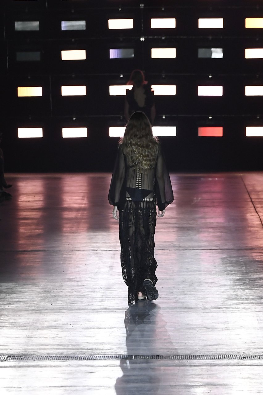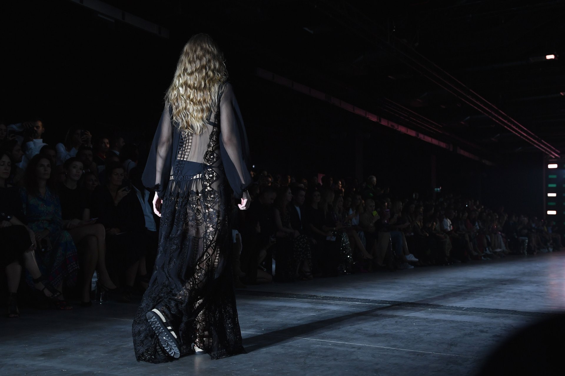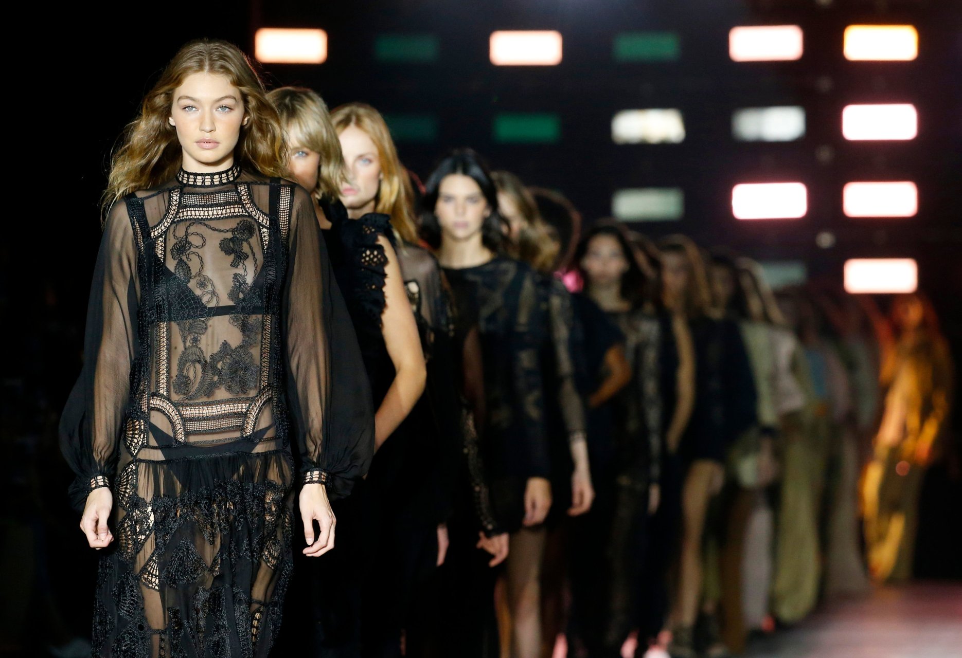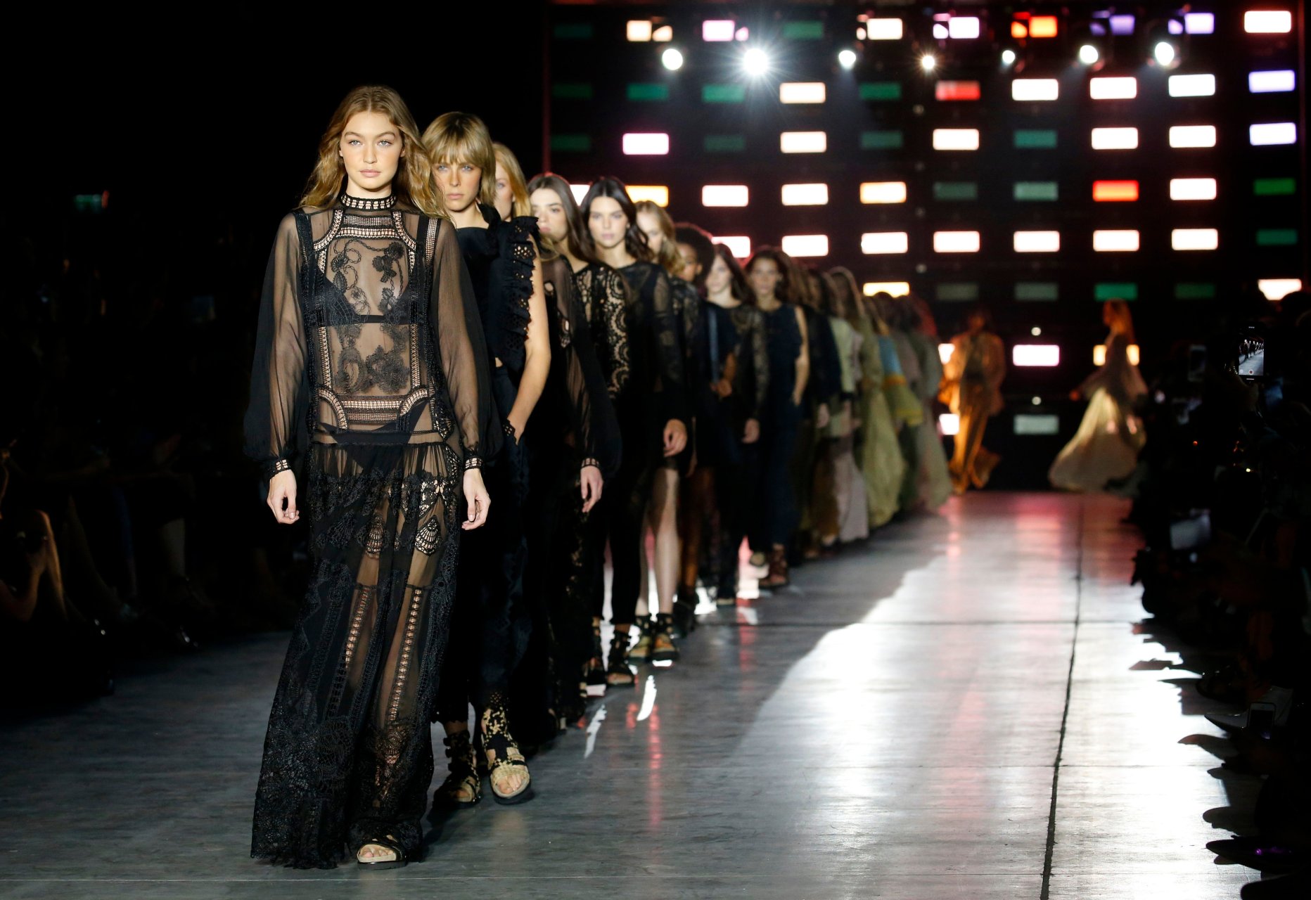 Gigi Hadid sfila alla sfilata di moda Alberta Ferretti a Milano, 19/09/2018. La modella di 23 anni Gigi Hadid è apparsa in un abito nero in chiffon trasparente.