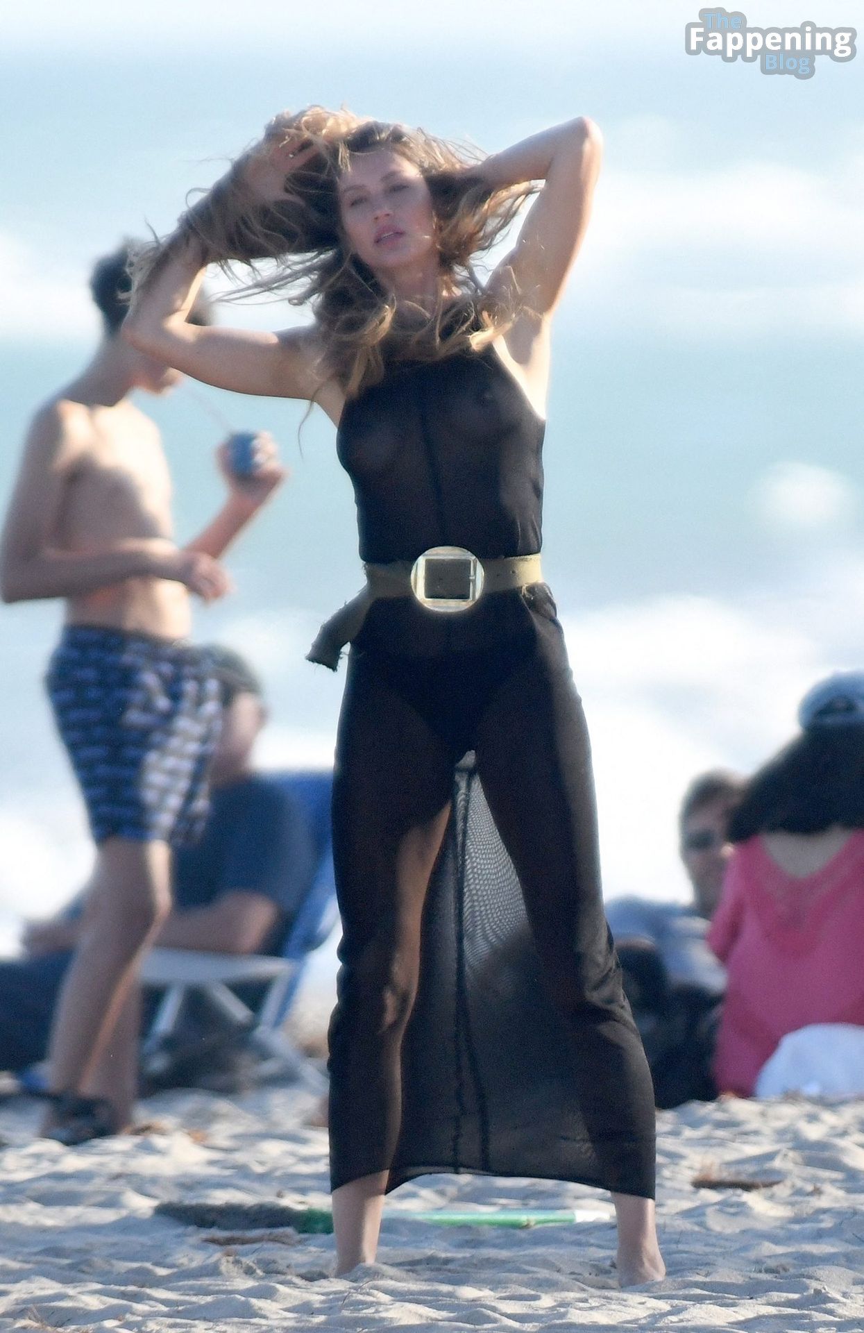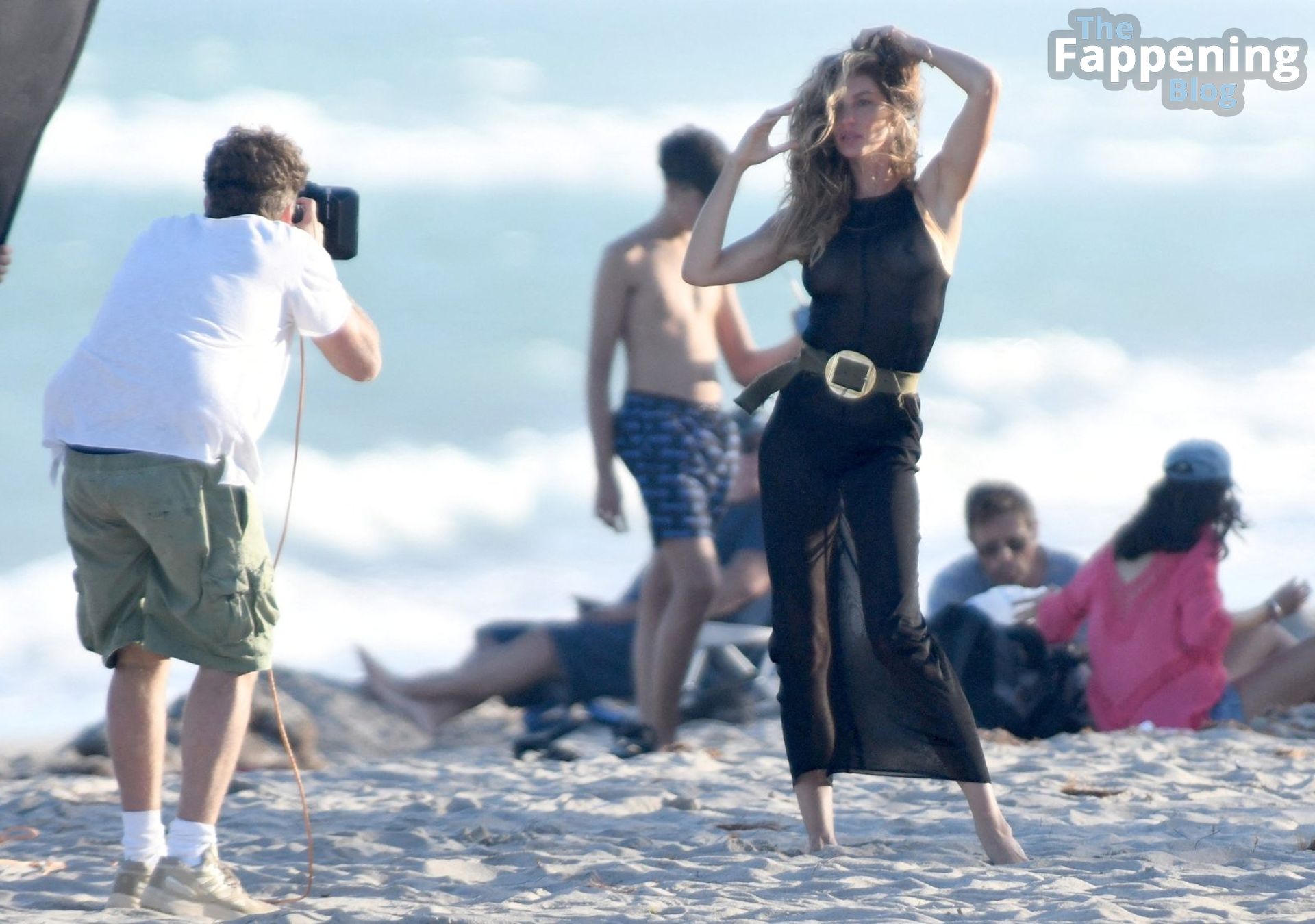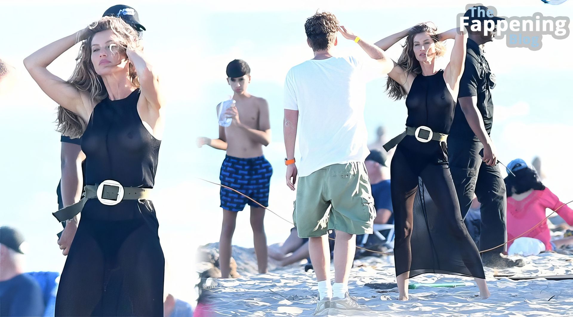 Gisele Bündchen mostra i suoi seni e capezzoli posando senza reggiseno in un outfit trasparente durante uno shooting fotografico a Miami Beach.