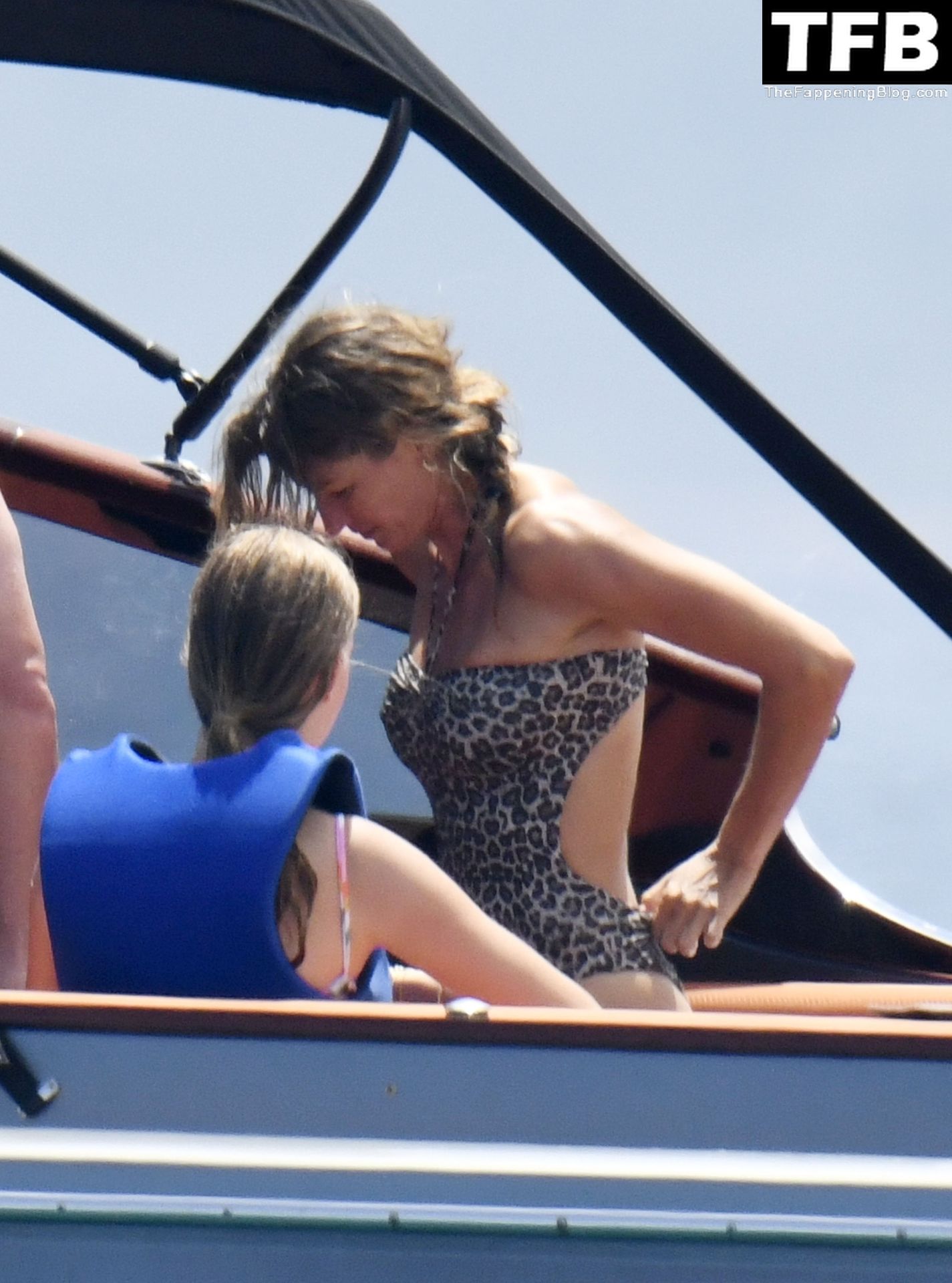 La supermodella brasiliana Gisele Bundchen mostra la sua figura in un costume da bagno con stampa animalier mentre è ritratta con suo marito, il giocatore NFL Tom Brady, che si godono le loro vacanze estive su uno yacht di lusso in Italia, 07/02/2022.