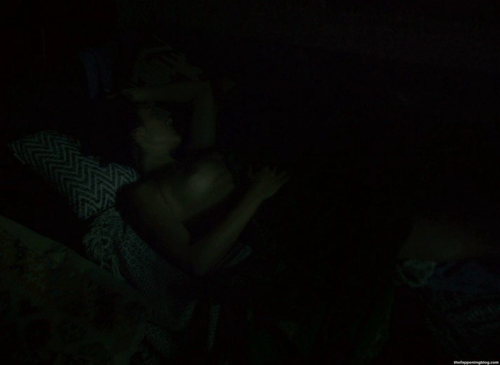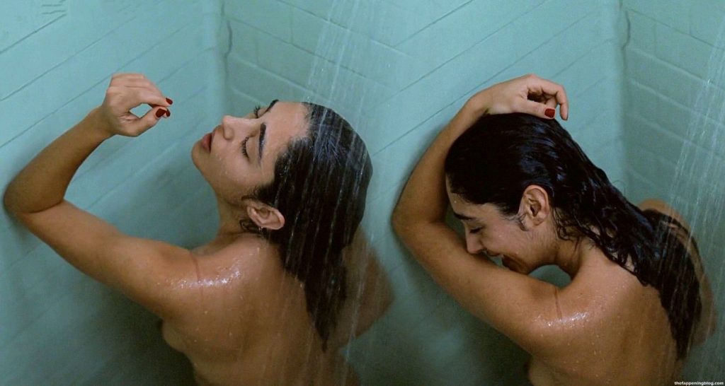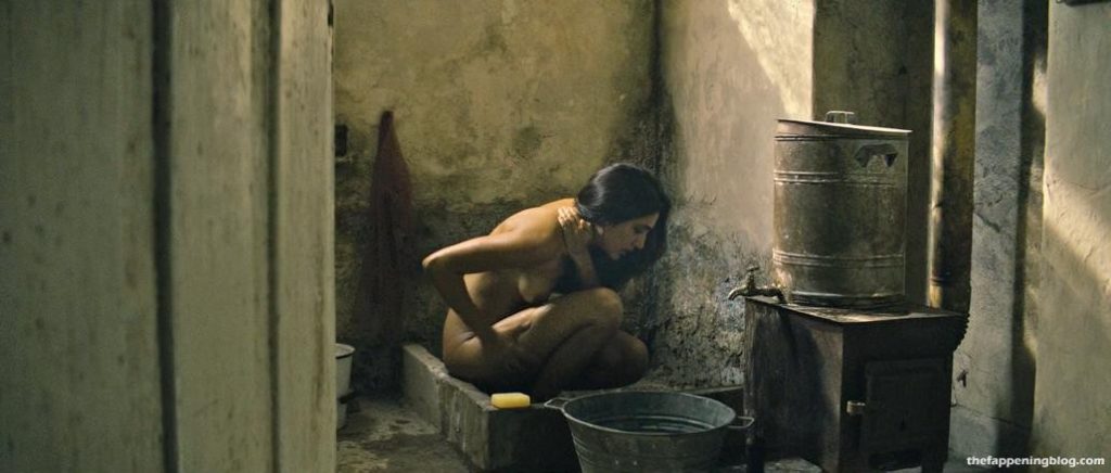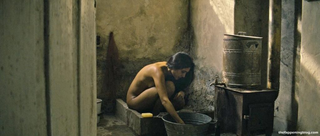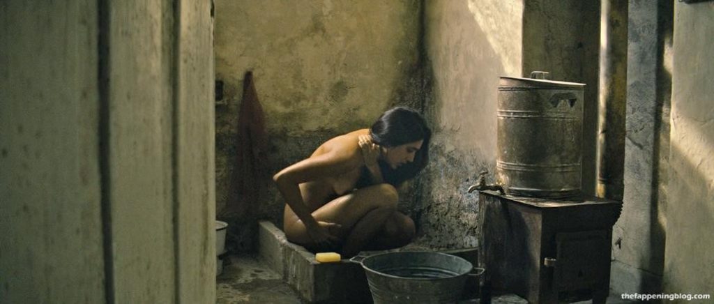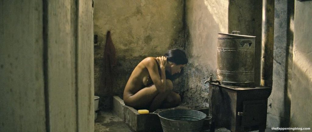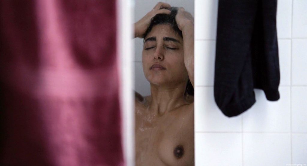 Golshifteh Farahani is hunched over naked as she squats in the corner of a room bathing herself from a bucket, showing side boob pressed against her leg and flashing her nipple briefly when she leans back a little.