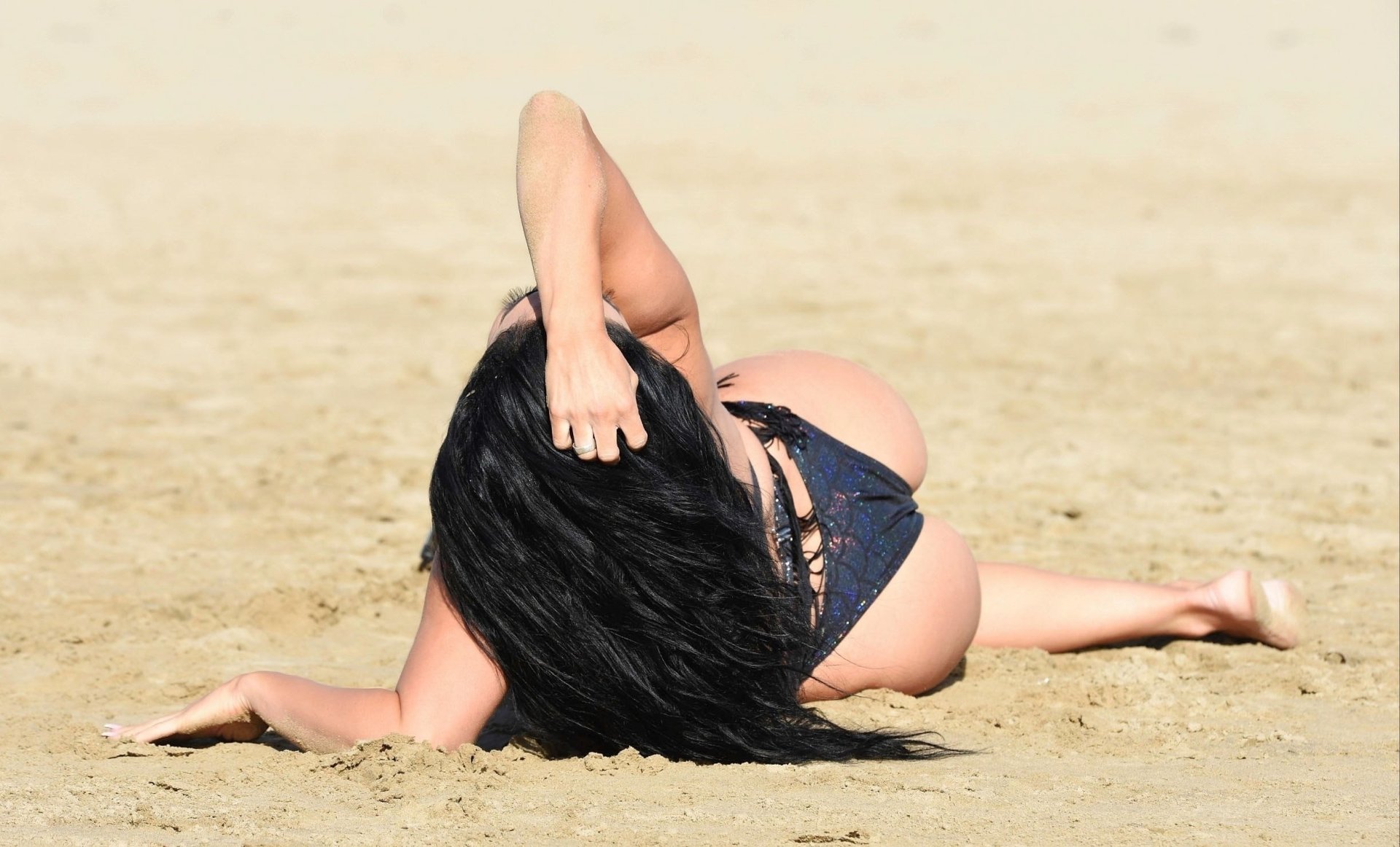 Modella glamour Grace J Teal (30) subisce un malfunzionamento del guardaroba mentre le sue enormi forme escono dal bikini durante una fuga in Spagna, 30/09/2018.