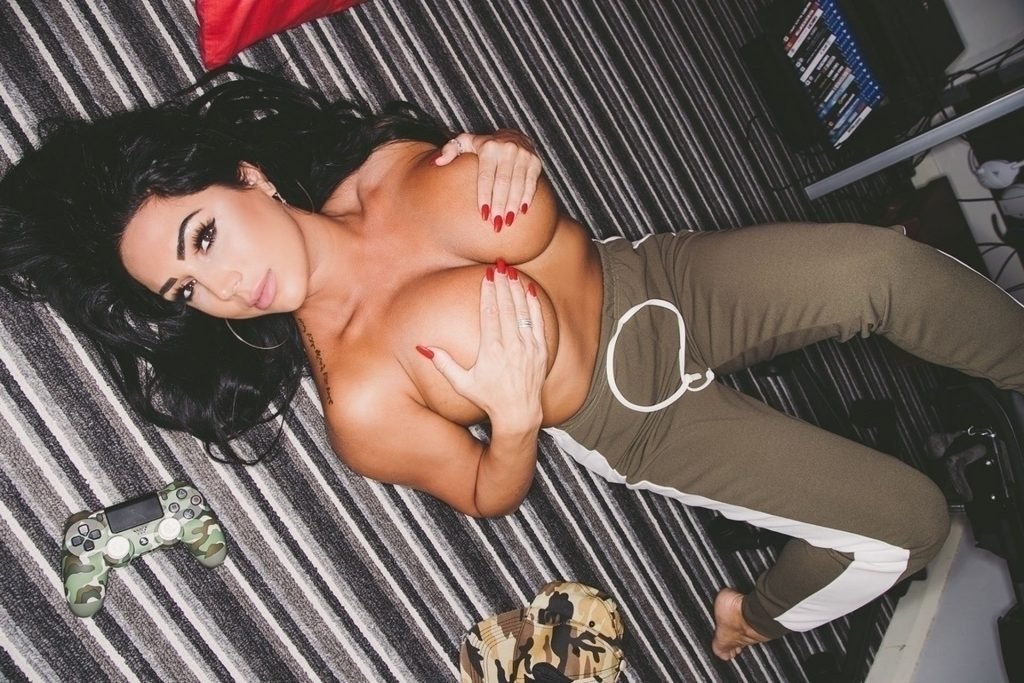 La splendida modella glamour formosa Grace J Teal si gode un po’ di azione con la PlayStation durante una pausa in un servizio fotografico a Manchester, 17/10/2019.