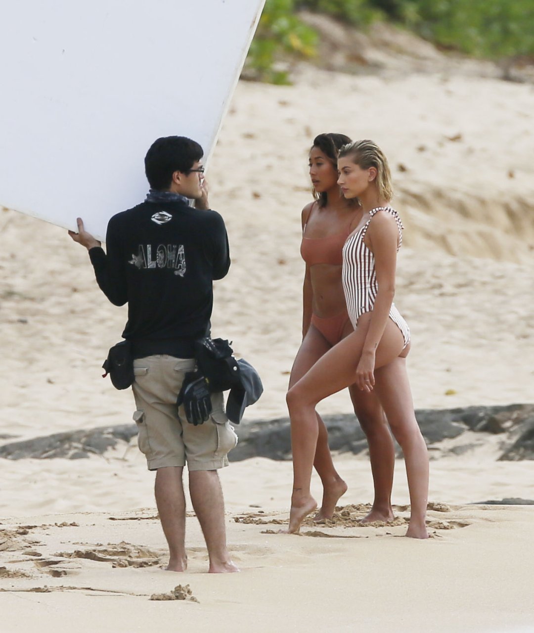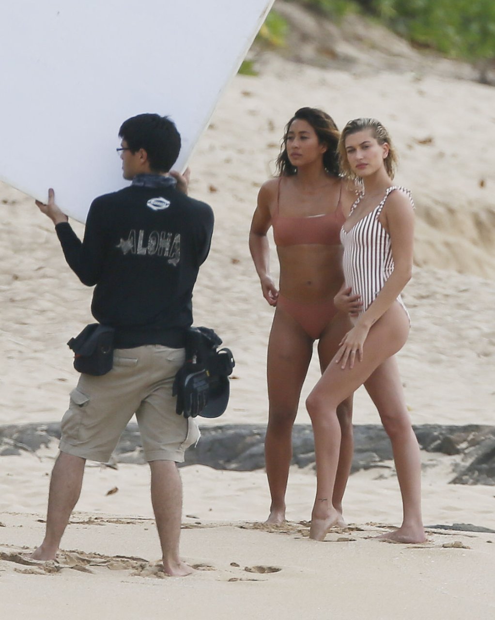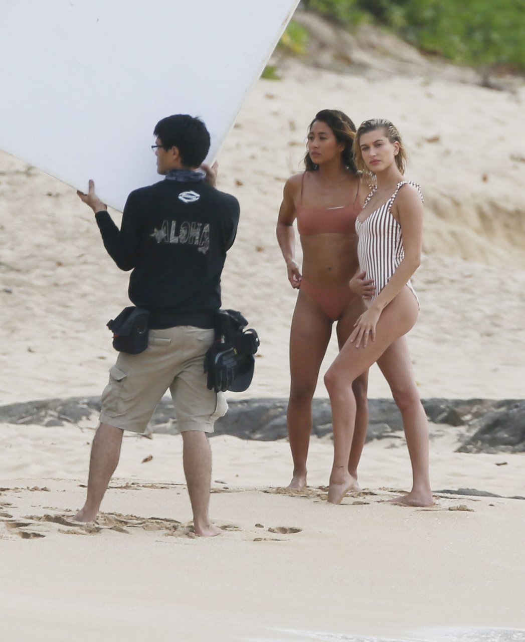 Hailey Baldwin fa colpo sulla spiaggia alle Hawaii, 31/05/2018. La modella di moda di 21 anni è passata da un bikini intero a righe a un costume da bagno a due pezzi ed è stata accompagnata da un’altra modella in alcune parti del servizio fotografico.