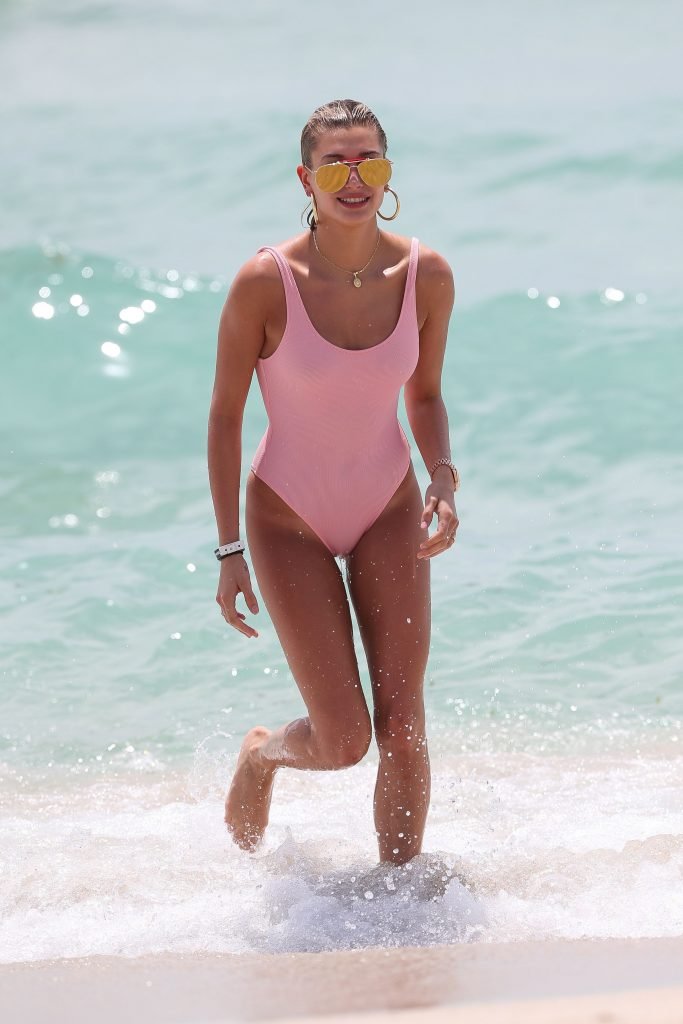 Hailey Baldwin indossa un costume intero rosa pallido sulla spiaggia di Miami, 10/06/2017. Hailey Rhode Baldwin è una modella e attrice americana di Tucson. Età – 20.