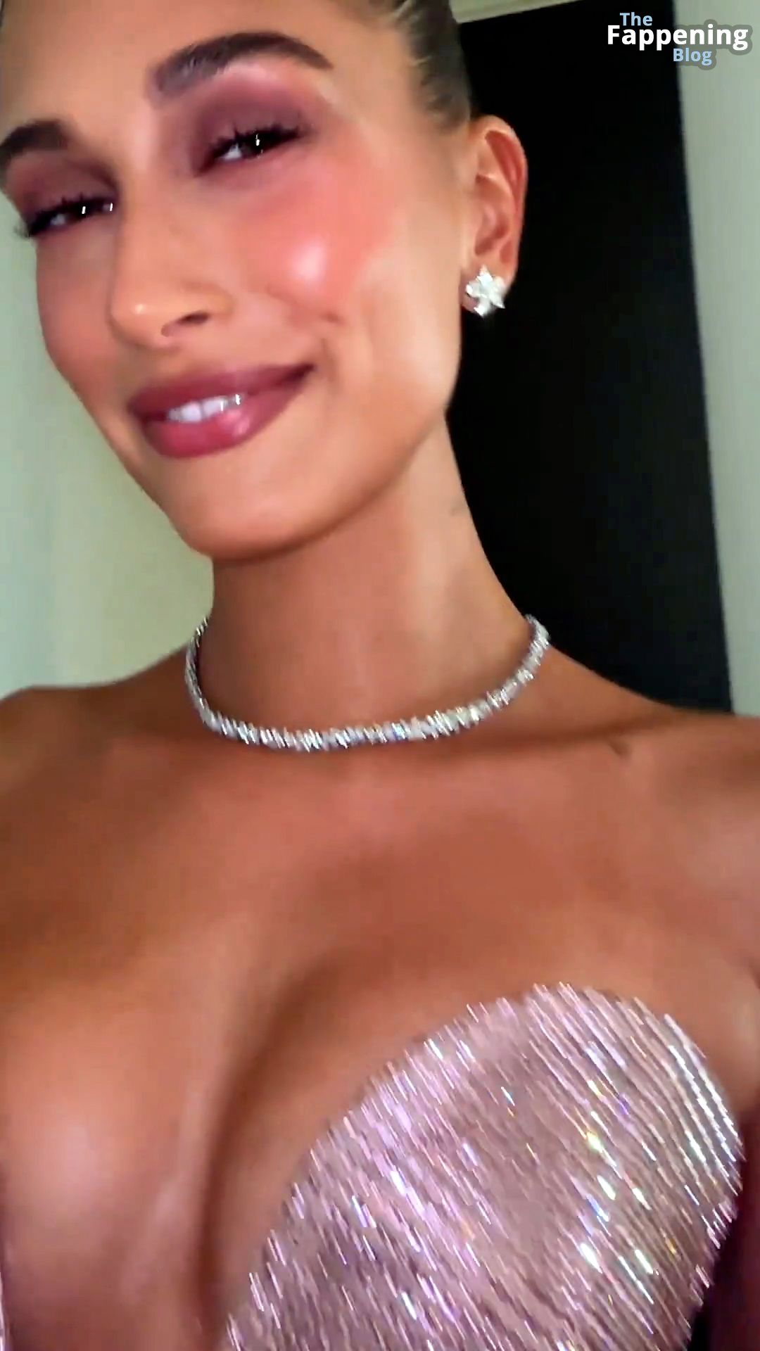 Ha completato il suo outfit con scarpe Gianvito Rossi tono nude, caratterizzate da cinturini trasparenti davanti. E la sua acconciatura? Classica Hailey – liscia e tirata indietro. Il suo look glamour includeva un trucco rosa glamour, con particolare attenzione a labbra e guance, accentuando la sua bellezza naturale.