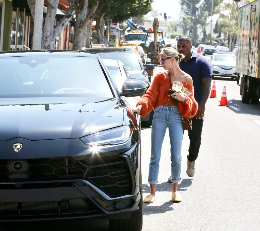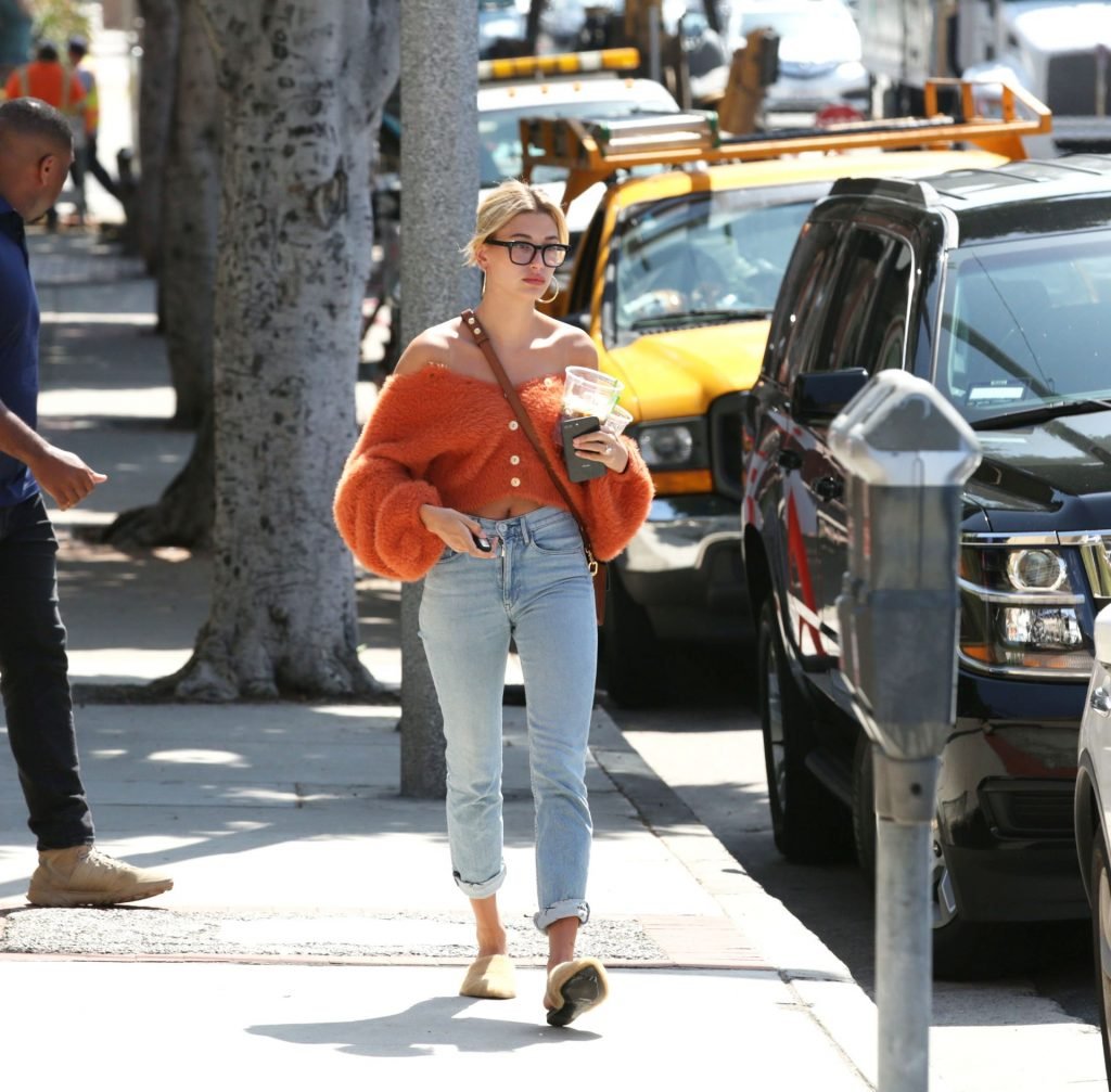 Hailey Baldwin si prende una pausa dal marito Justin Bieber per fare alcune commissioni e prendere un caffè freddo dopo essere tornata dalla South Bay a Los Angeles, 25/04/2019. La top model mette in mostra i suoi addominali perfetti, mentre va senza reggiseno con un maglione peloso arancione, corto e scollato sulle spalle, abbinato a jeans blu e ciabatte pelose neutre.
